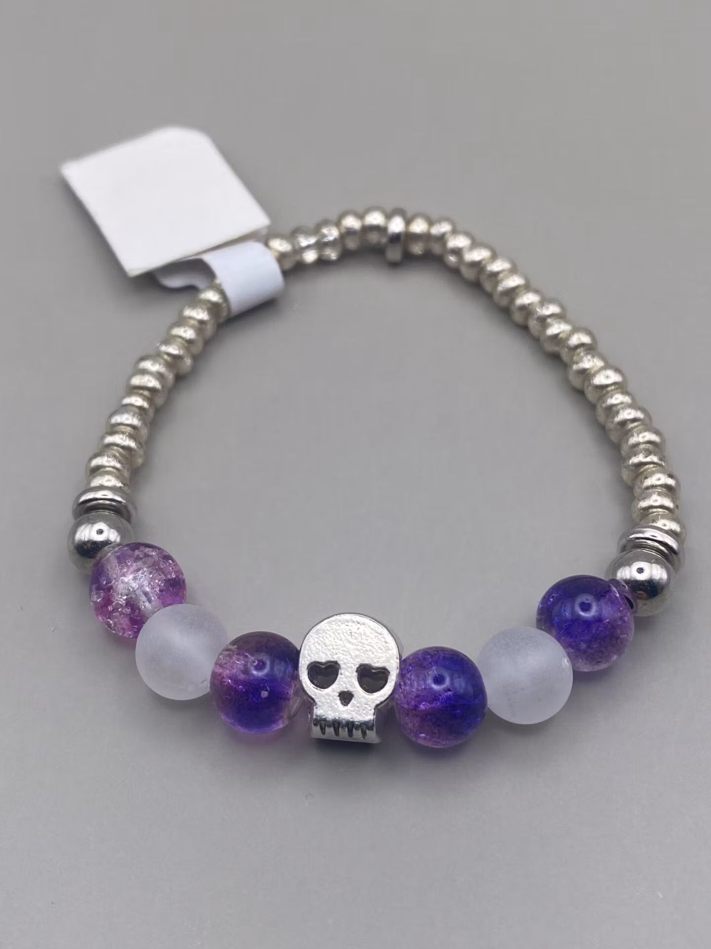 Armband av blåmellerade glas pärlor, varvat med frostat glas pärlor, silvriga glaspärlor, silvriga detaljer och dödskalle i blickfånget