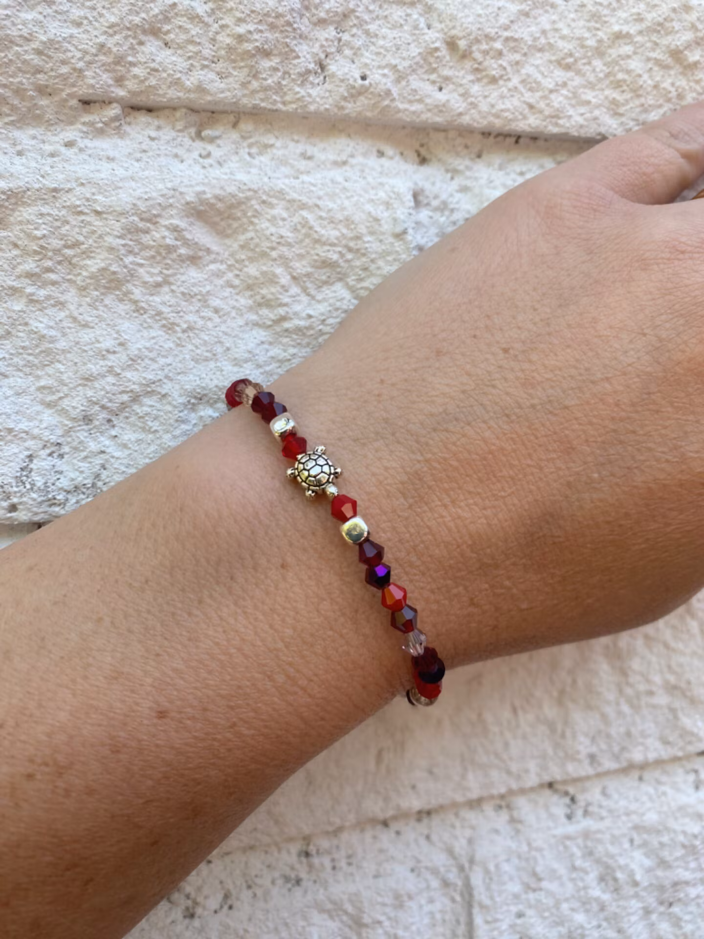 Armband av i blandade mindre glaspärlor i röda toner, silverfärgade detaljer och liten sköldpadda i blickfånget