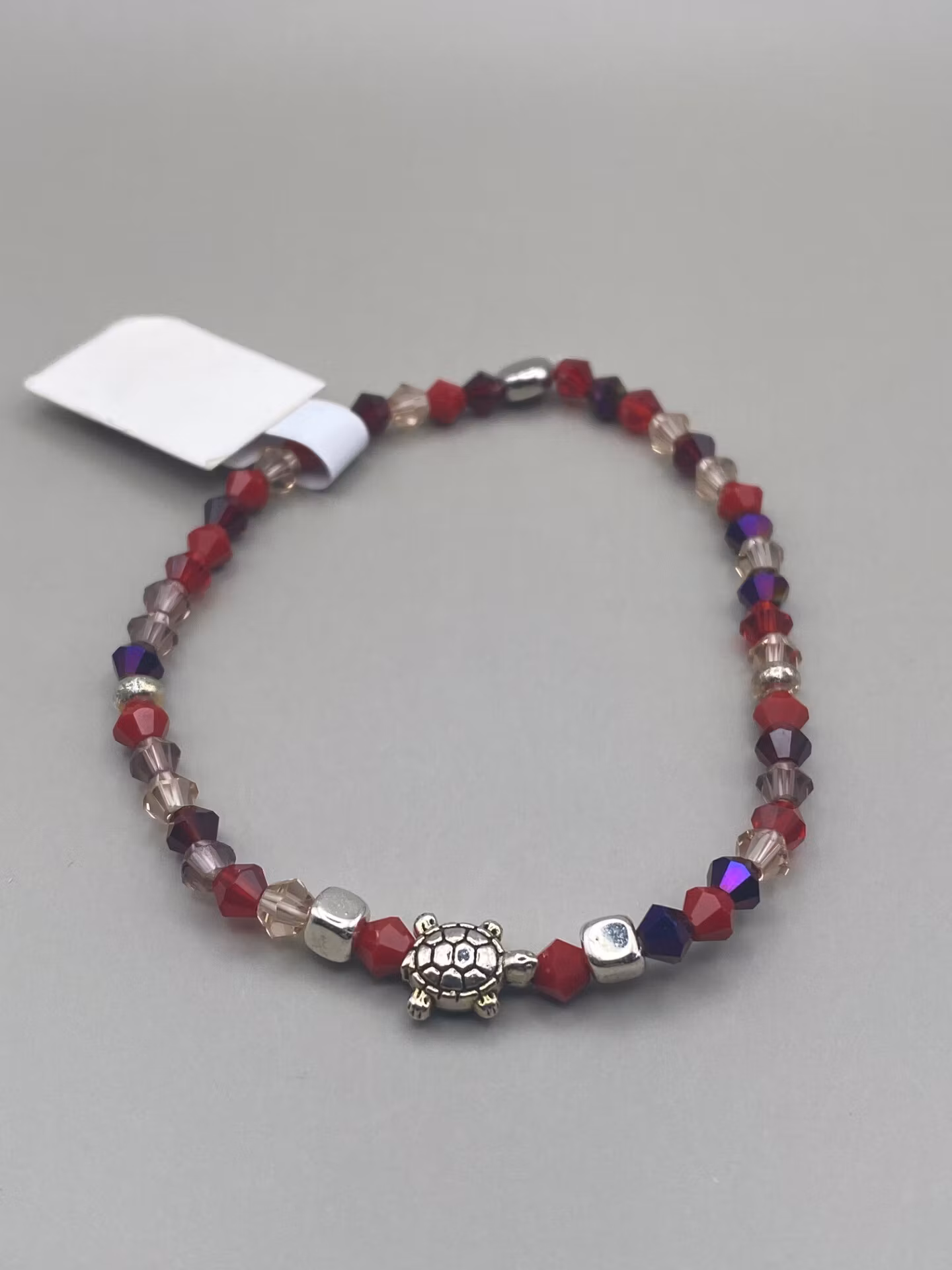 Armband av i blandade mindre glaspärlor i röda toner, silverfärgade detaljer och liten sköldpadda i blickfångetPärlolr 4mm