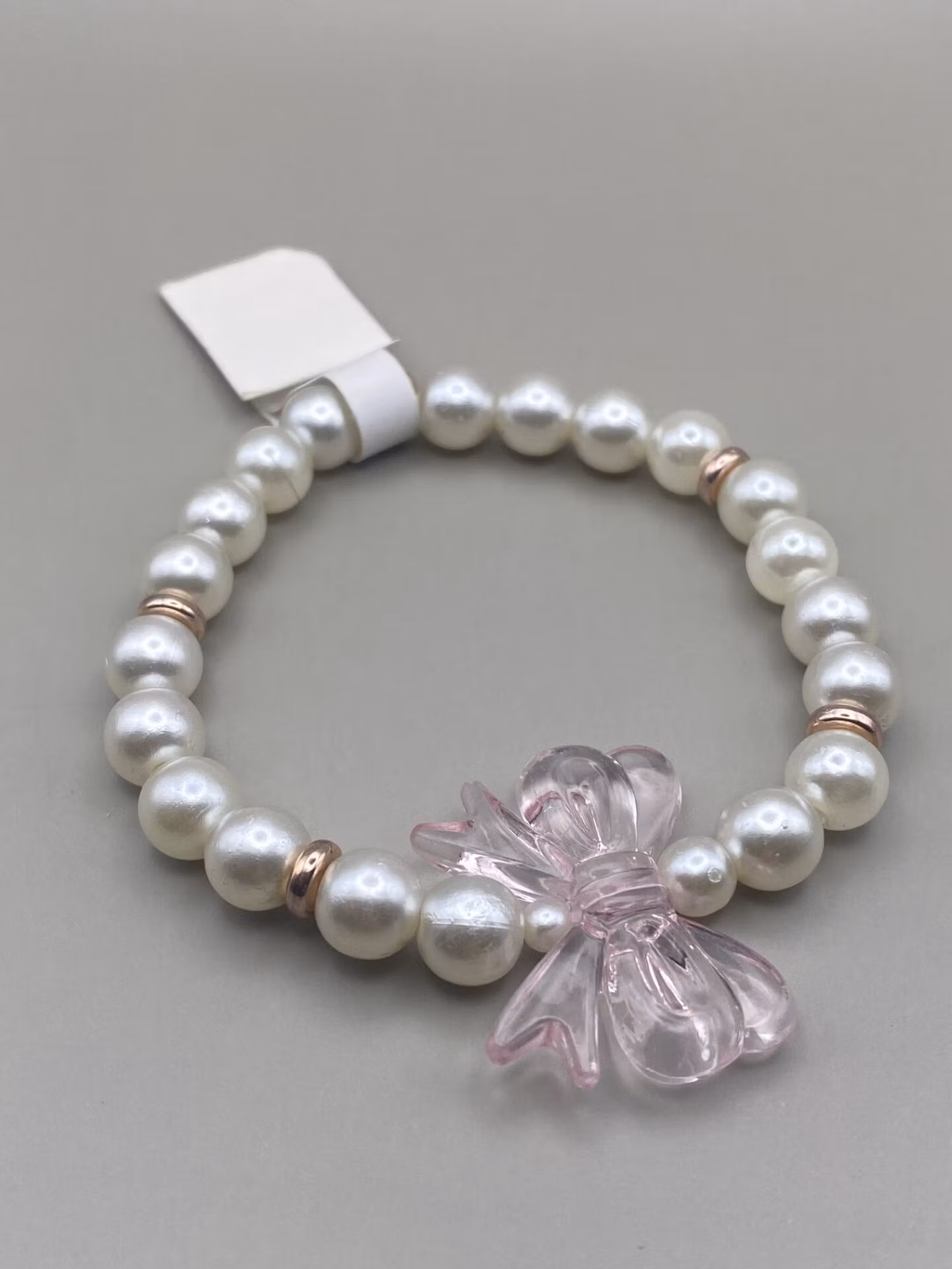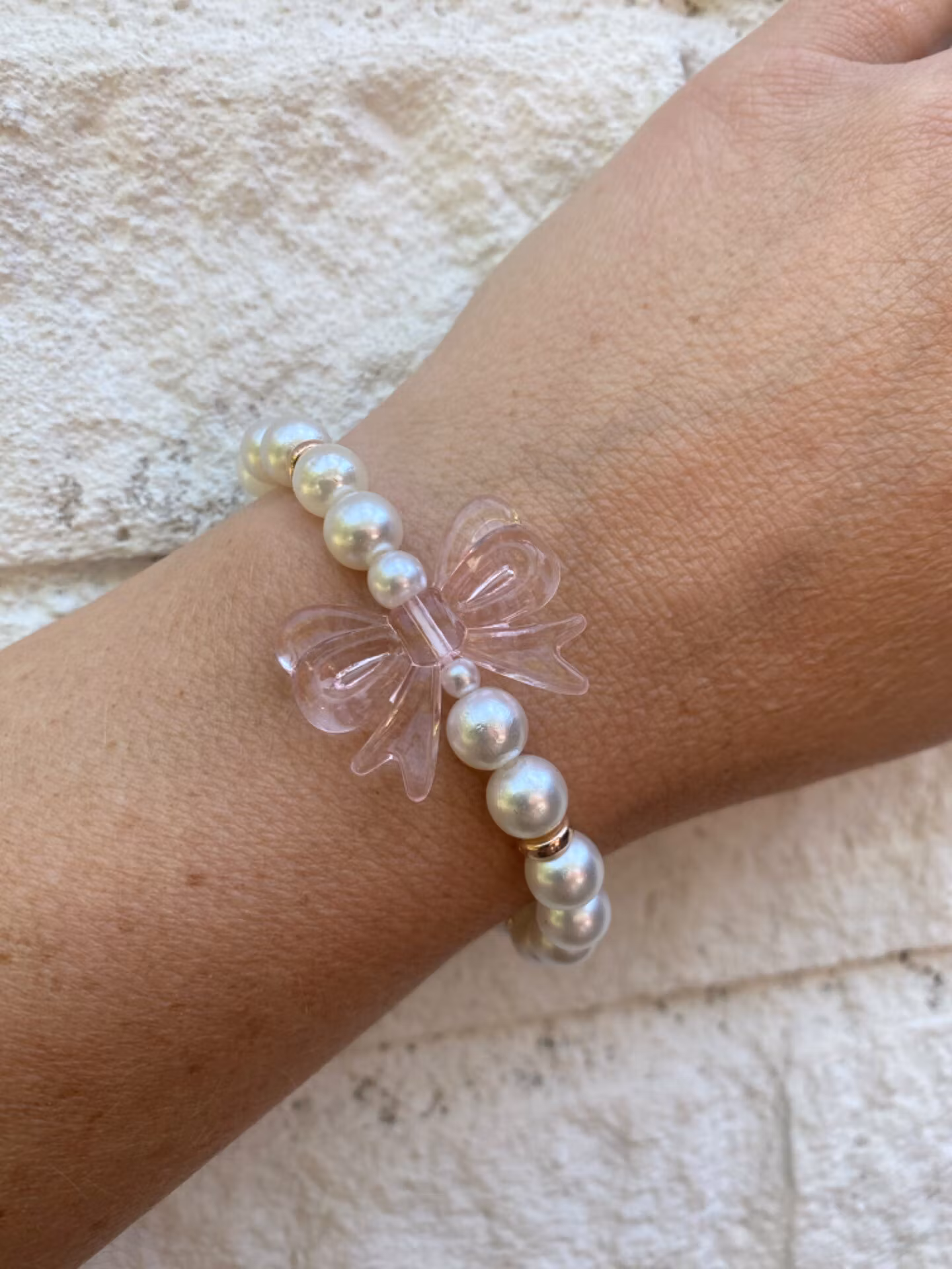 Armband i benvita pärlor varvat med rosefärgade detaljer, stor ljusrosa genomskinlig rosett i blickfånget