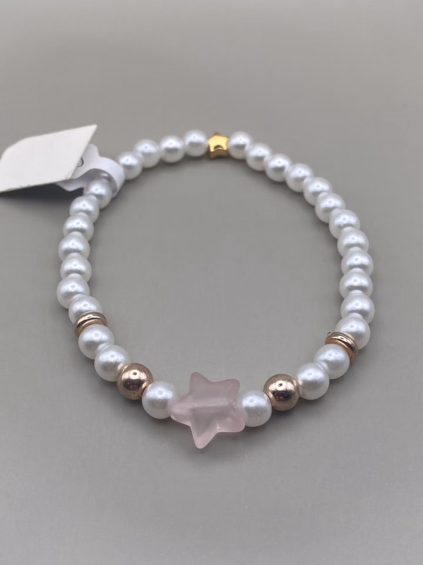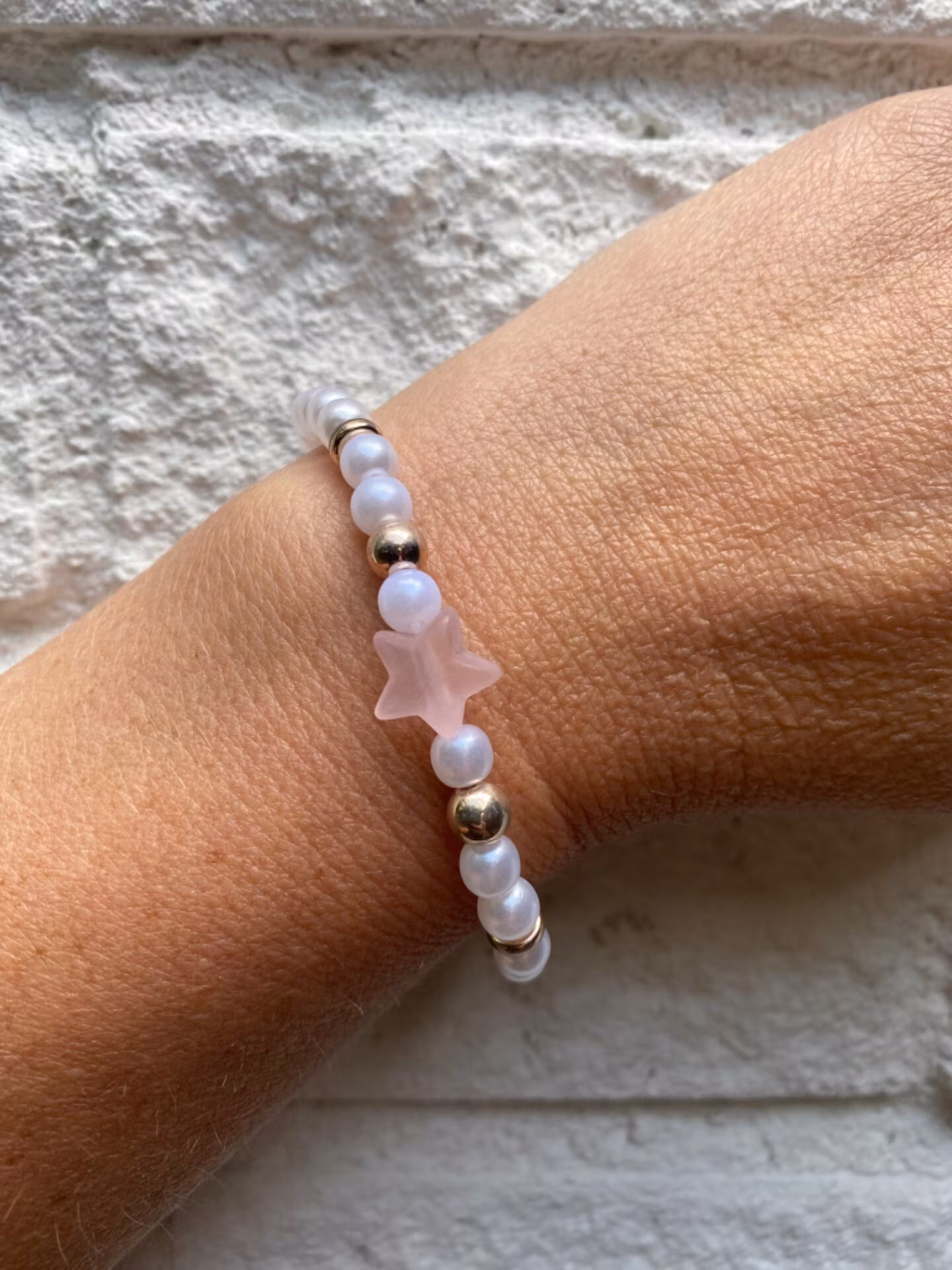 Armband i kritvita pärlor varvat med roséfärgade detaljer och ljusrosa frostad stjärna i blickfånget