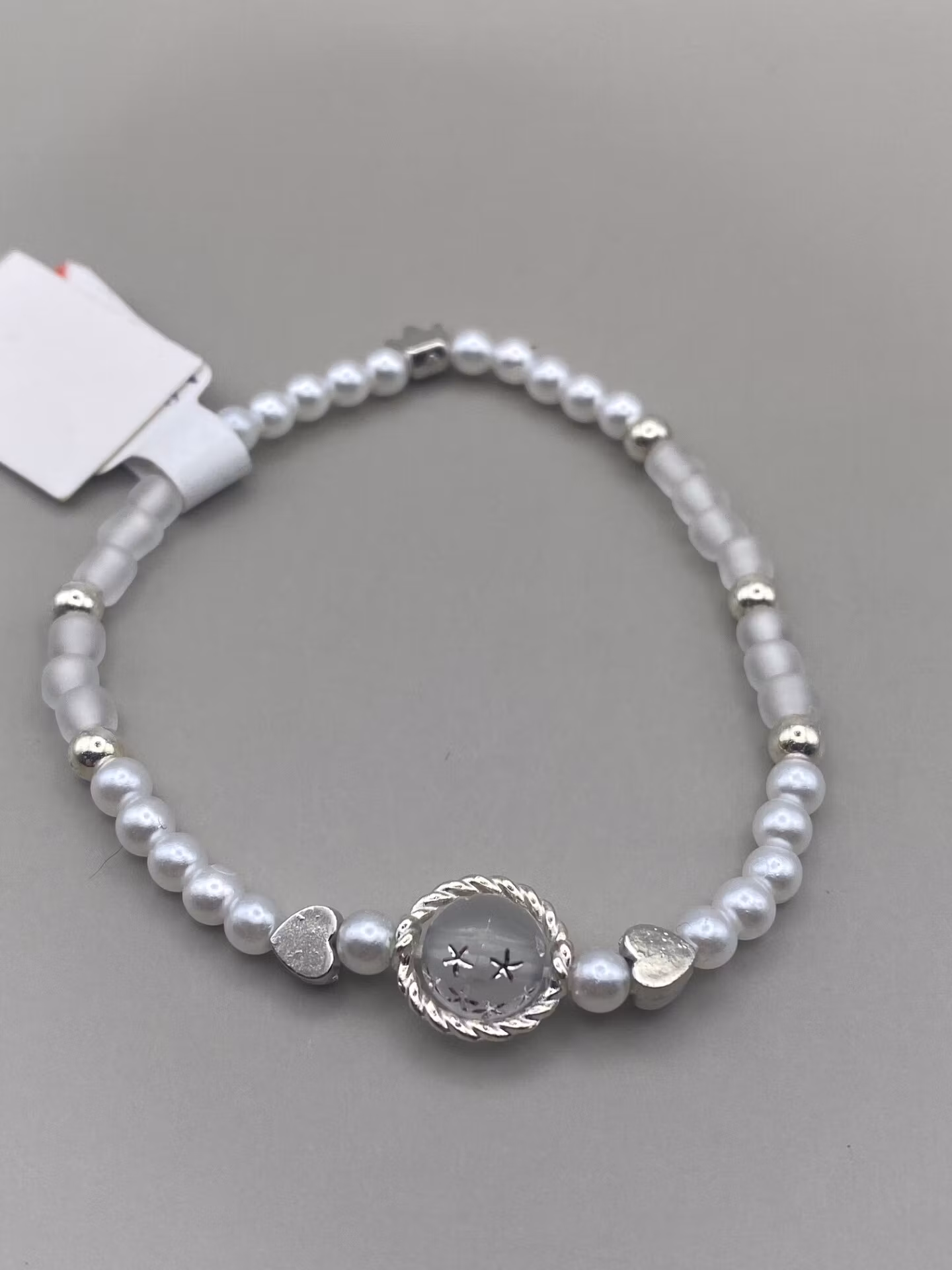 Armband av små vita pärlor, varvat med silverfärgade detaljer och matta vita pärlor. Större frostad mönstrad pärla med silverfärgat hölje i blickfånget.