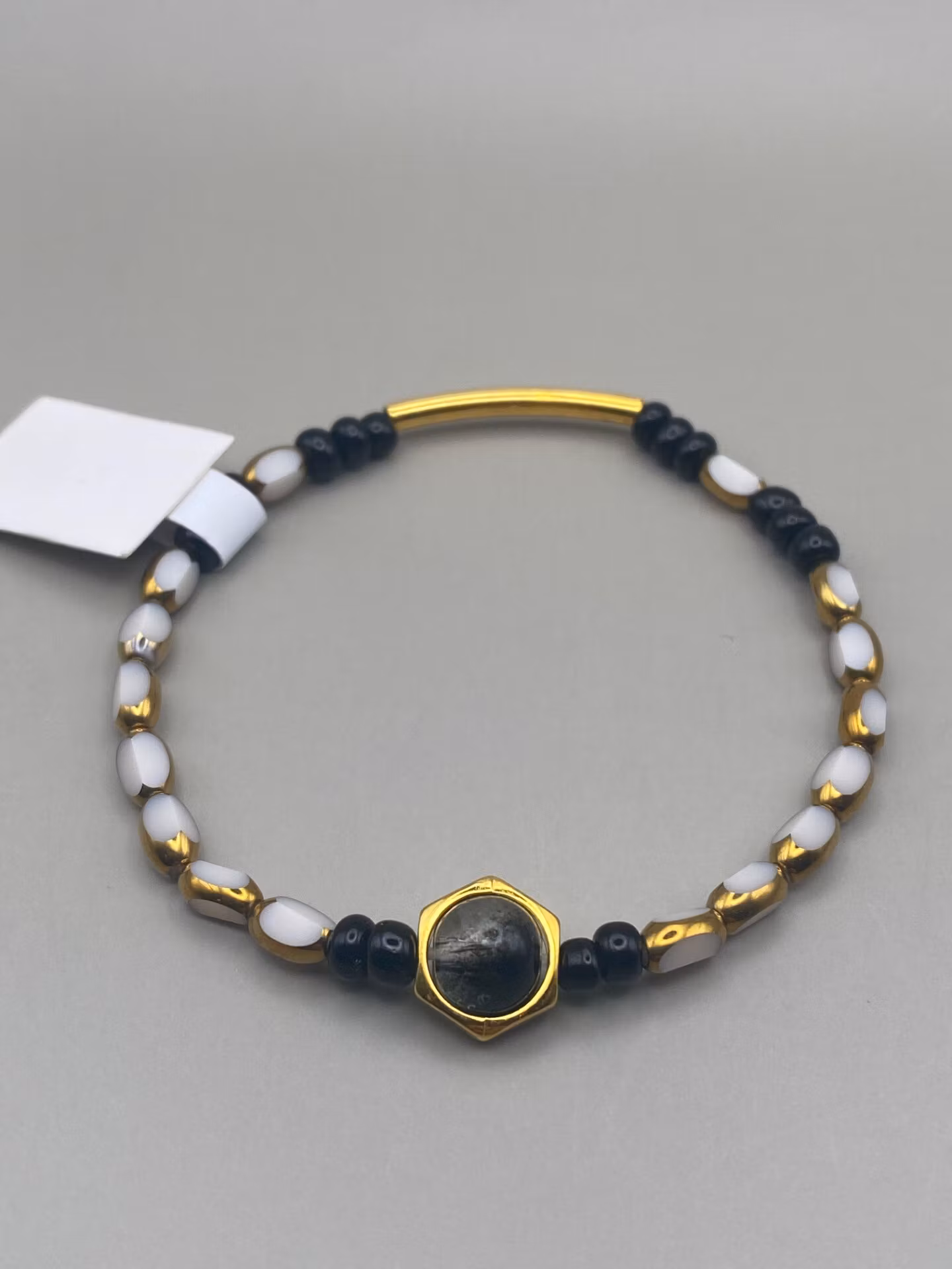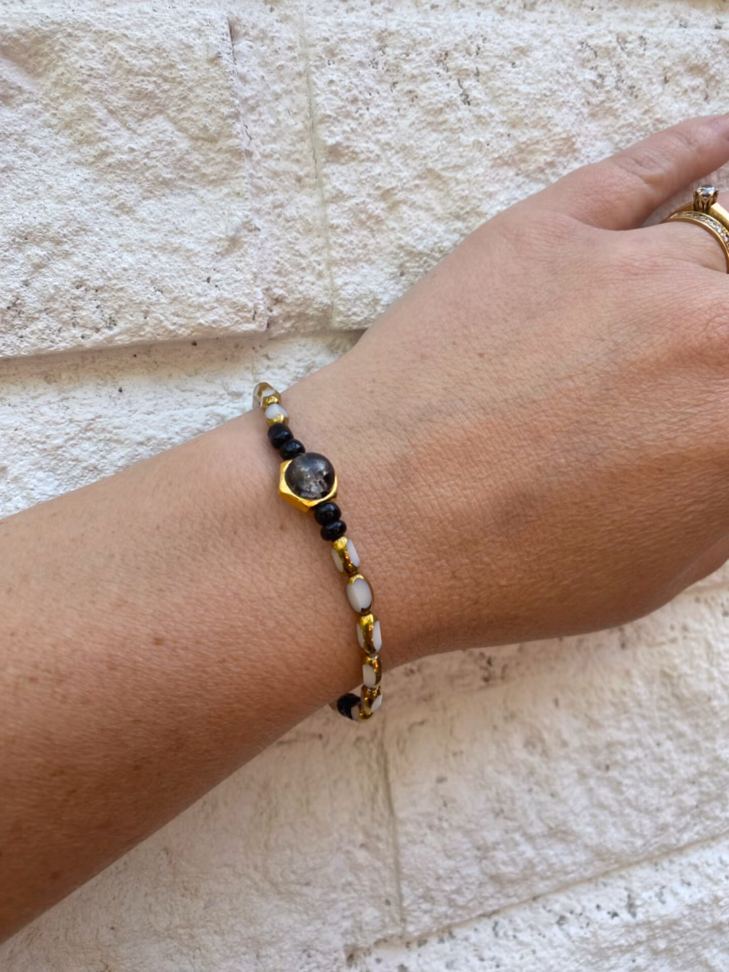 Armband i tonerna av guld- beige- och svarta pärlor och detaljer. Svartmellerad glaspärla i guldfärgat hölje i blickfånget