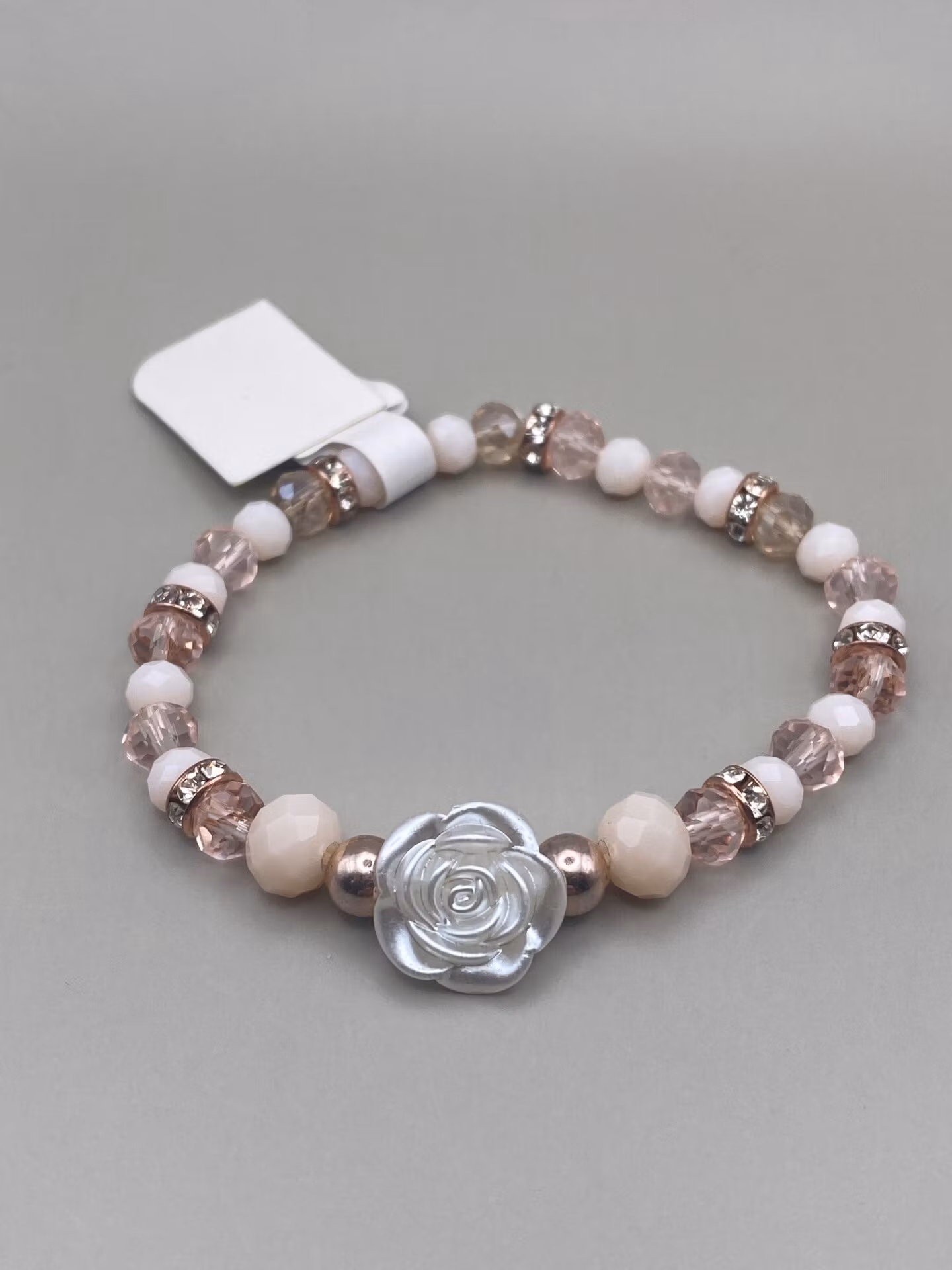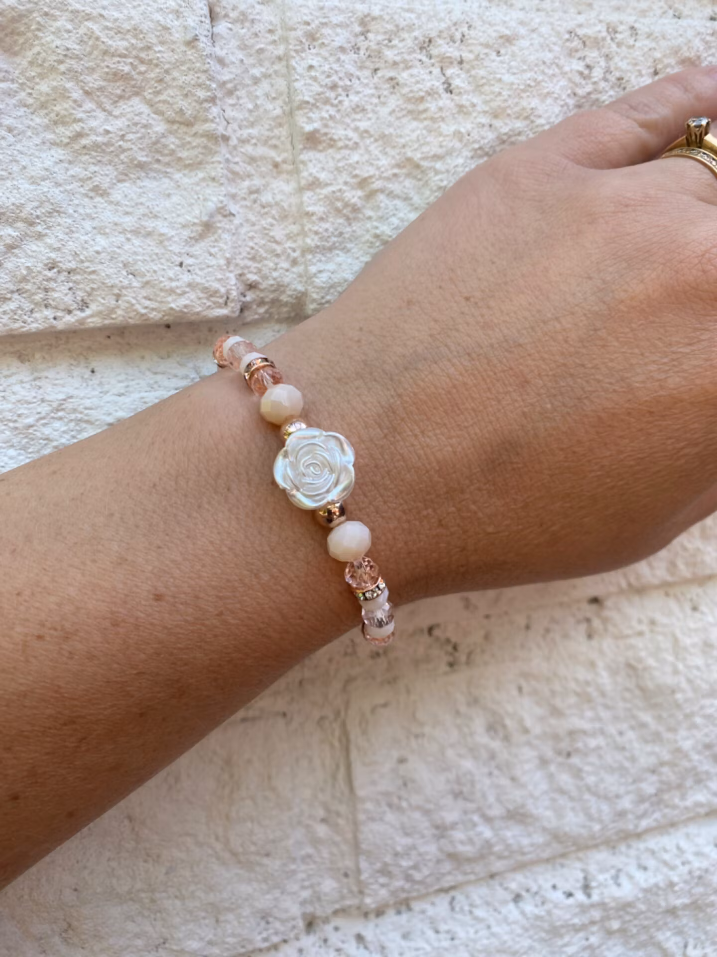 Armband i härliga ljusrosa och aprikosa toner, varvat med roséfärgade detaljer och strass, vit ros i blickfånget