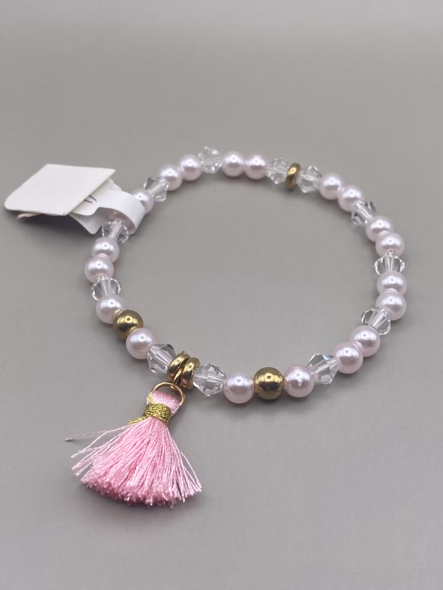 Armband i ljusrosa pärlor samt glaspärlor, varvat med guldfärgade detaljer och rosa ”tassle” i blickfånget