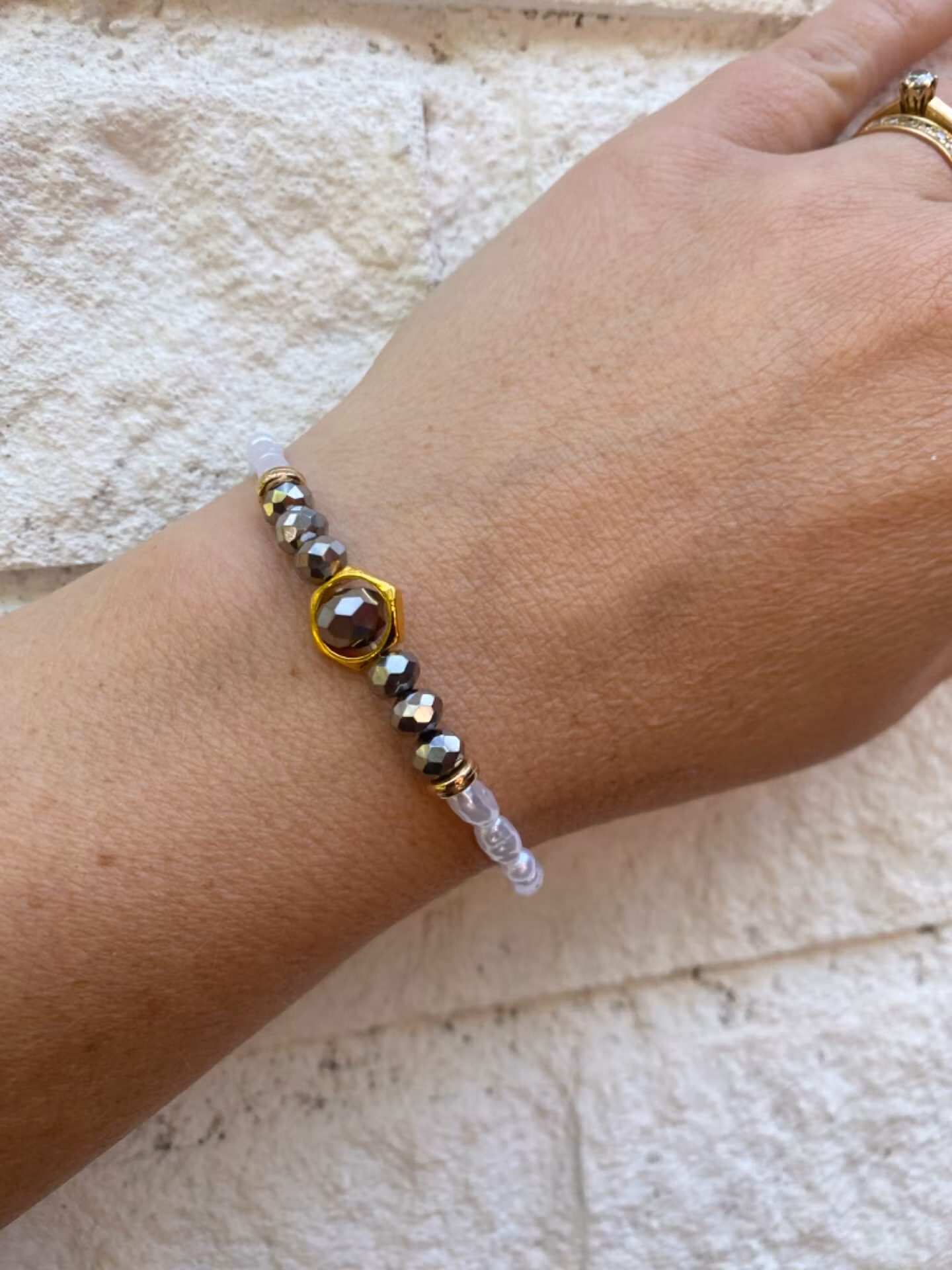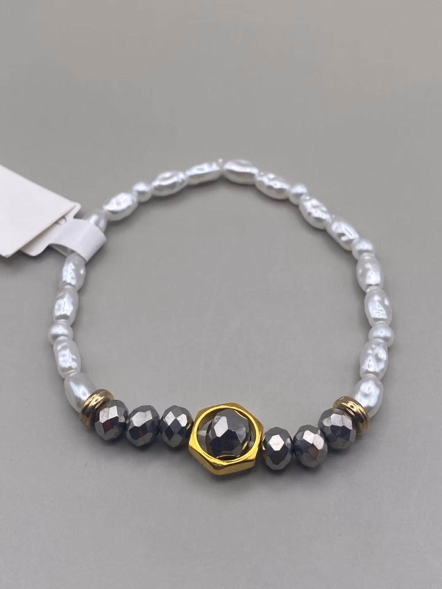 Armband i kritvita oregelbundna pärlor, silverfärgade glasstenar i blickfånget samt guldfärgat hölje runt en större pärla.