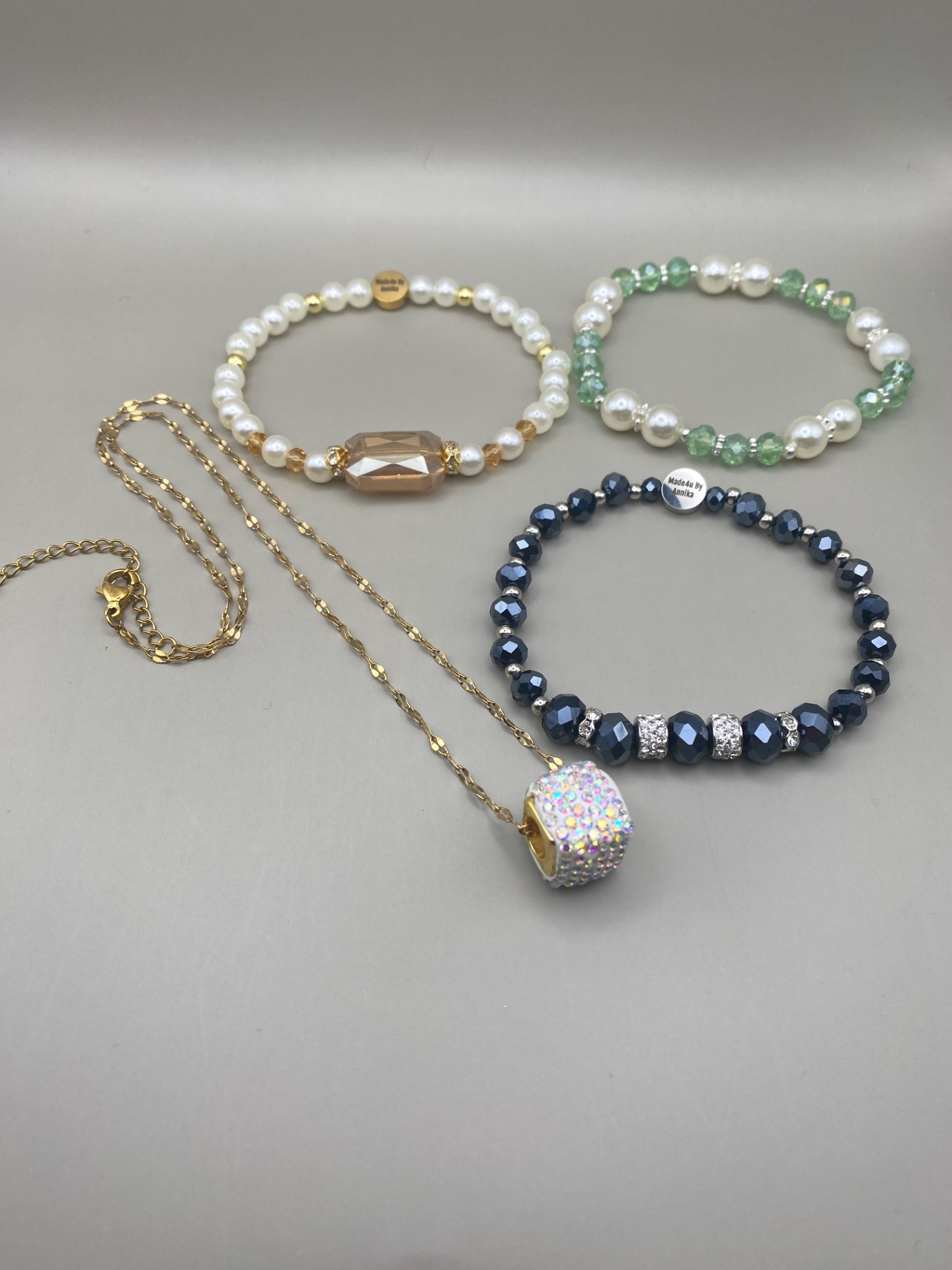 Du väljer storlek på armbanden vid beställning, och varje armband pärlas speciellt efter dina mått. Perfekt som present – eller som en vardagslyx till dig själv.