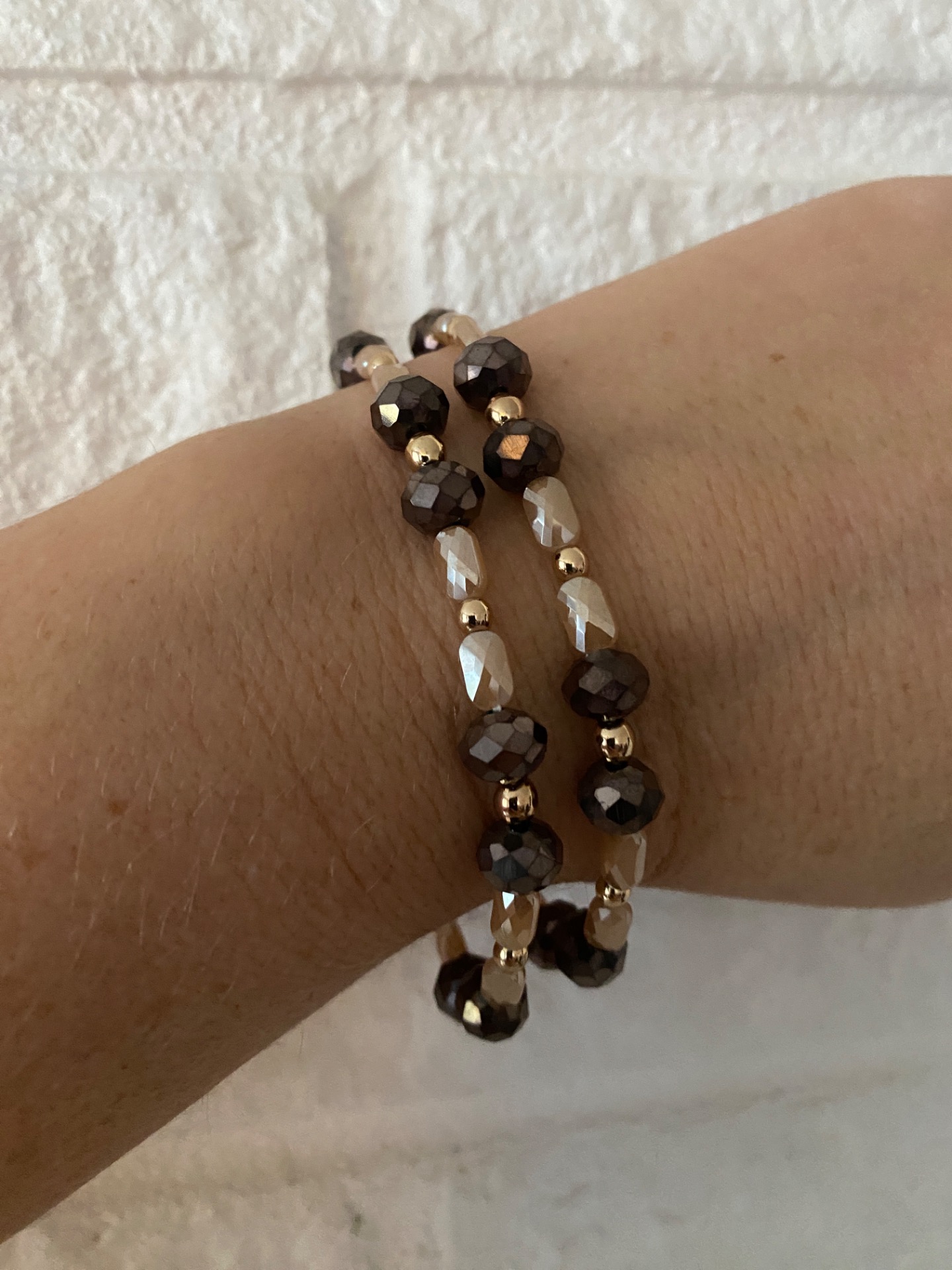 Vackert lekfullt armband i facetterade glaskristallpärlor, mörkbruna spegelblanka, beiga avlånga och små guldfärgade distanser.