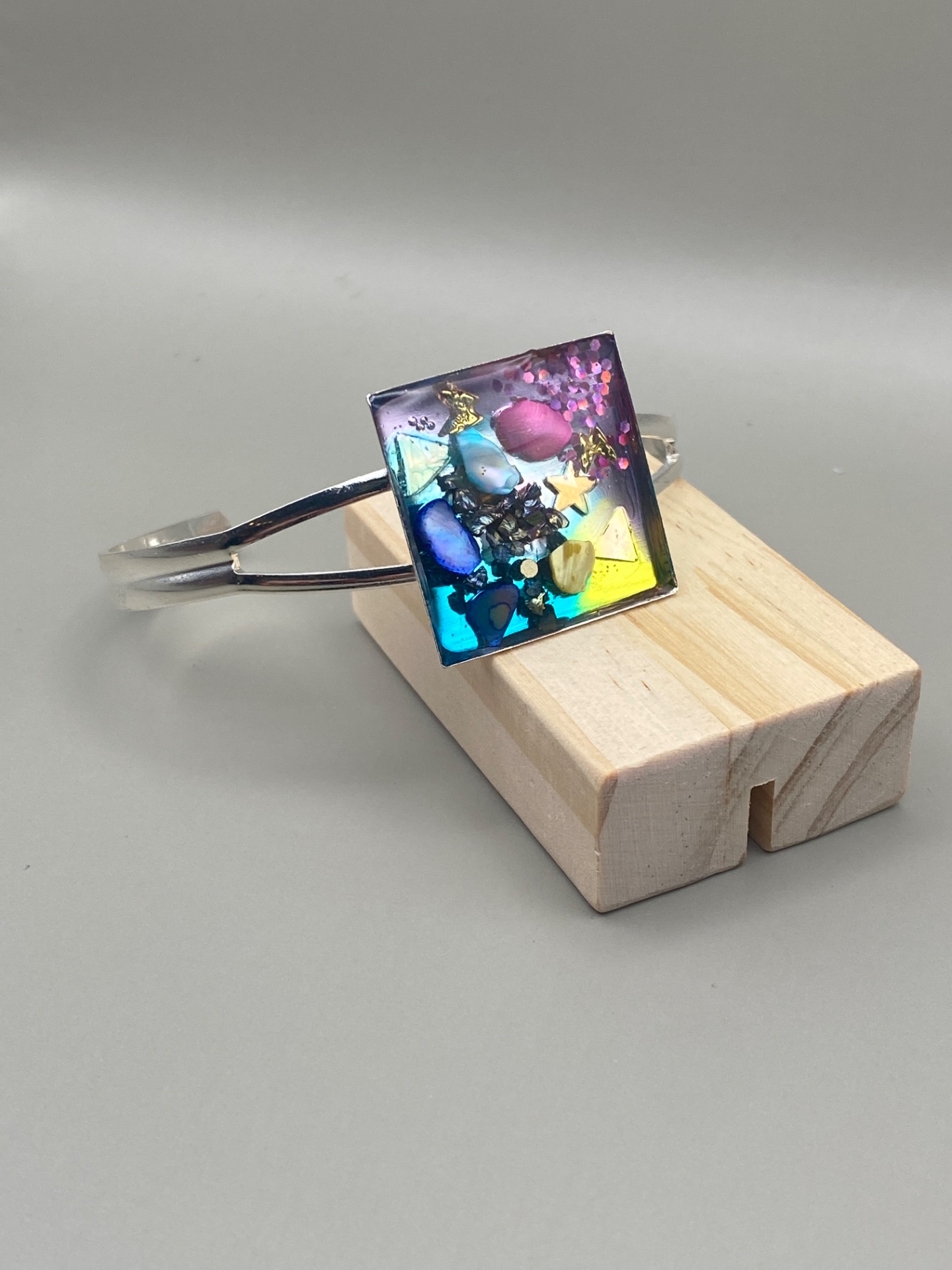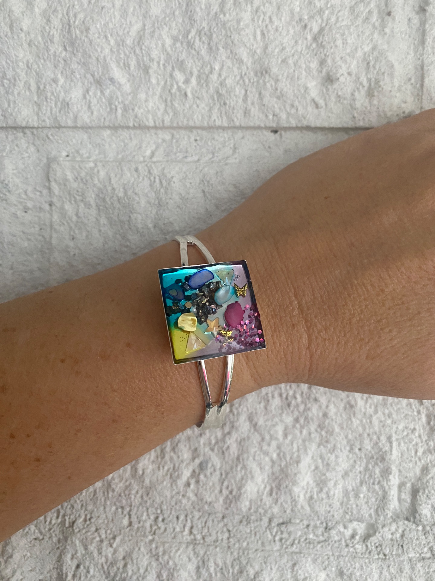 Spännande lekfullt armband med fast ram i silverfärgad koppar och vacker stor fyrkantigberlock med en härlig mix av blått, guld, rosa och lila och små dekorativa guldfärgade fjärilar i det vackra glasliknande resin.
