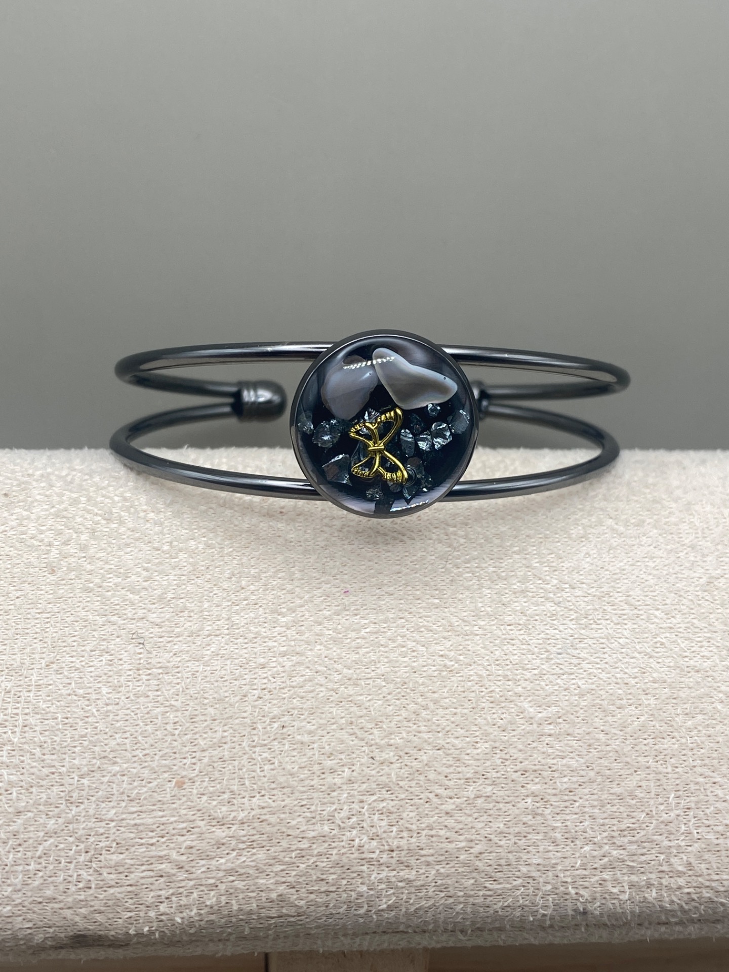 Vackert lekfullt armband med fast ram i mörkt stålgrå färgad koppar och vacker stor platt berlock med en härlig mix av silvergrått och svart, med en dekorativ guldfärgad fjäril täckt i det vackra glasliknande resin.