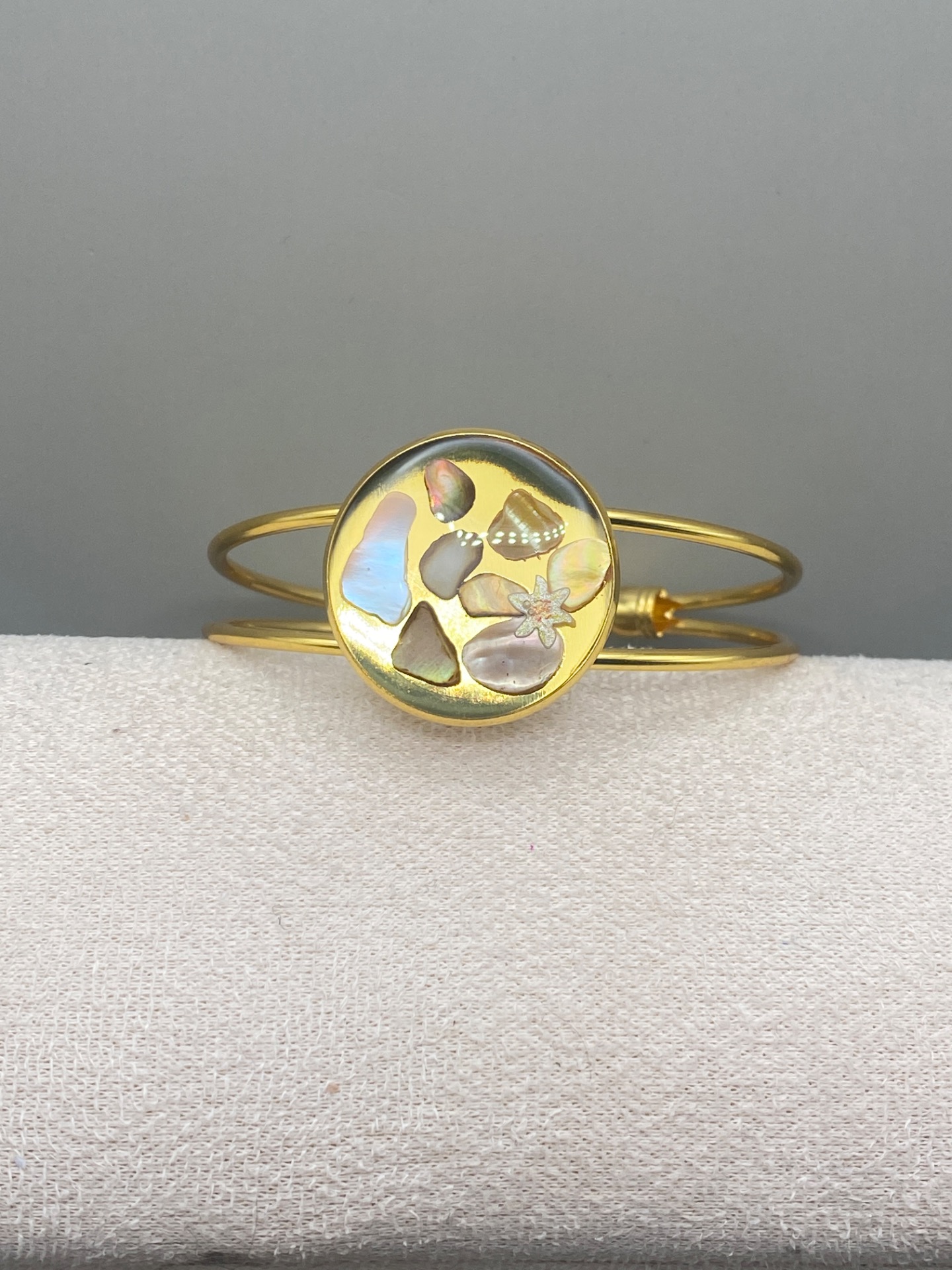Vackert lekfullt armband med fast guldfärgad ram och vacker stor platt berlock med en härlig mix av beige och brunt, täckt i det vackra glasliknande resin.
