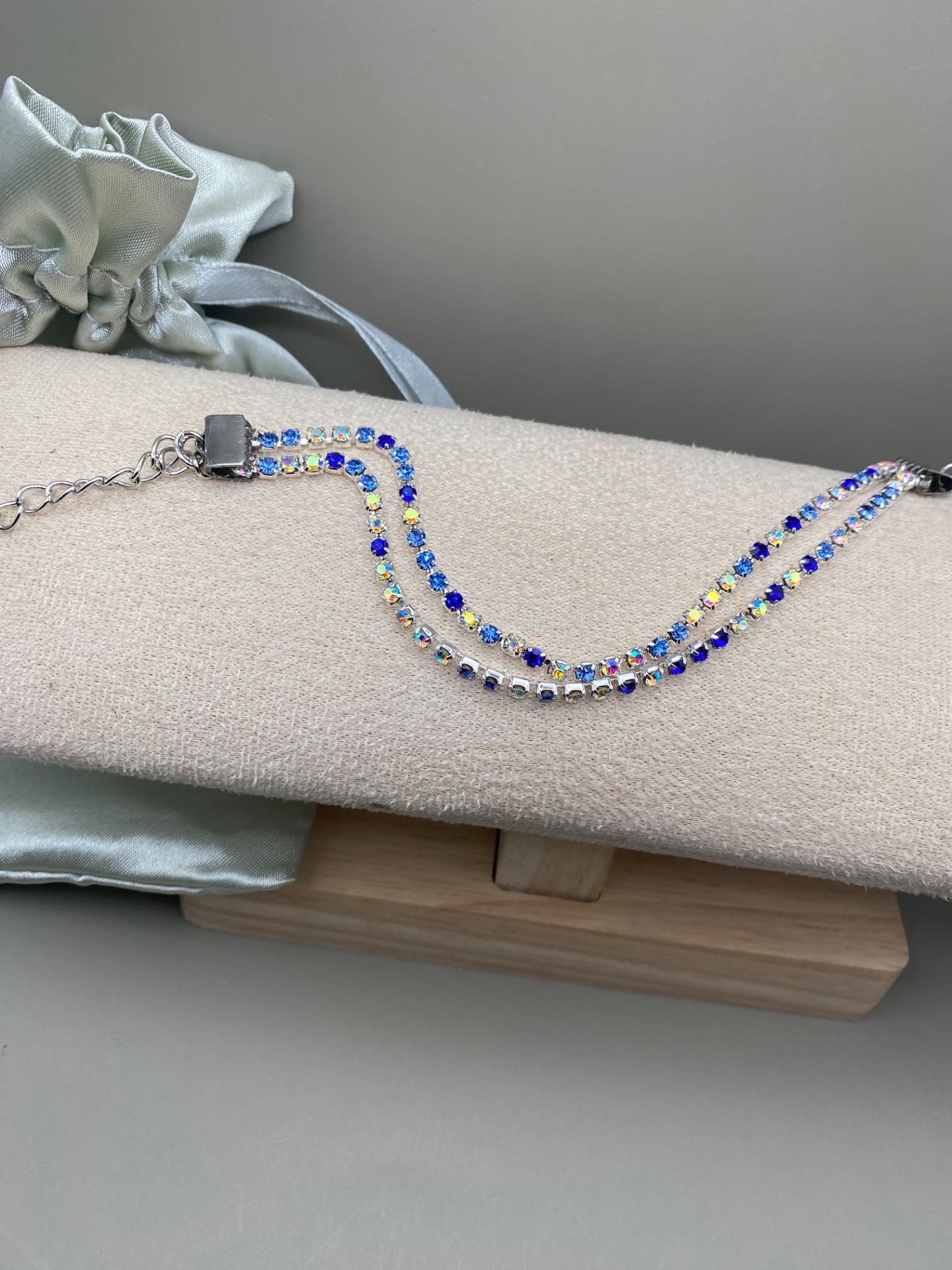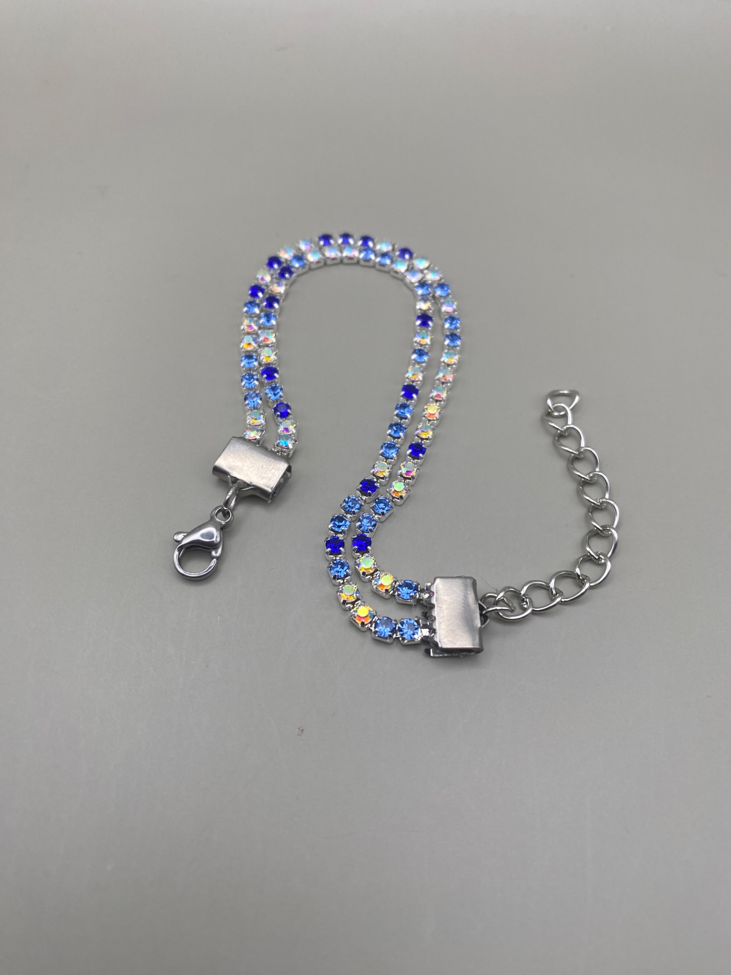 Vackert skimrande strassarmband med två rader strass i blåa toner. Armbandet har en klassisk, reglerbar infästning med cirka 5 cm justeringsmån.