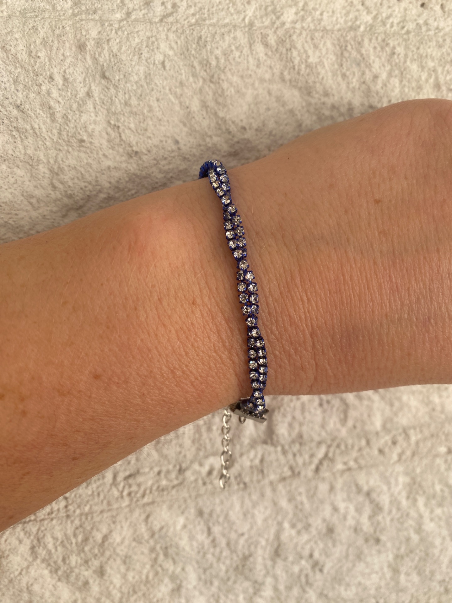 Elegant strassarmband med två tvinnade rader gnistrande klar strass, vackert kontrasterande mot en djup mörkblå bas. Armbandet har en klassisk, reglerbar infästning med cirka 5 cm justeringsmån.