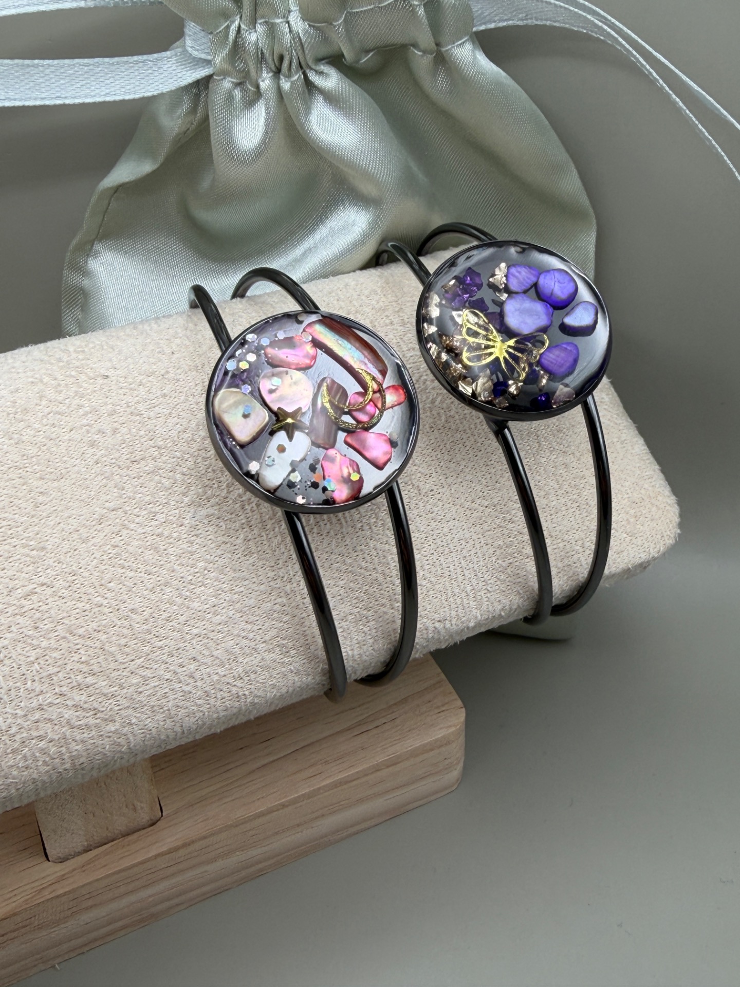Vackert lekfullt armband med fast ram i svartgråfärgad koppar och vacker stor platt berlock med en härlig mix av lila nyanser av stenar och glaskross med en fin liten dekorativ guldfärgad fjäril, i kristallklar resin, gjuten för hand för att ge en unik och exklusiv finish.