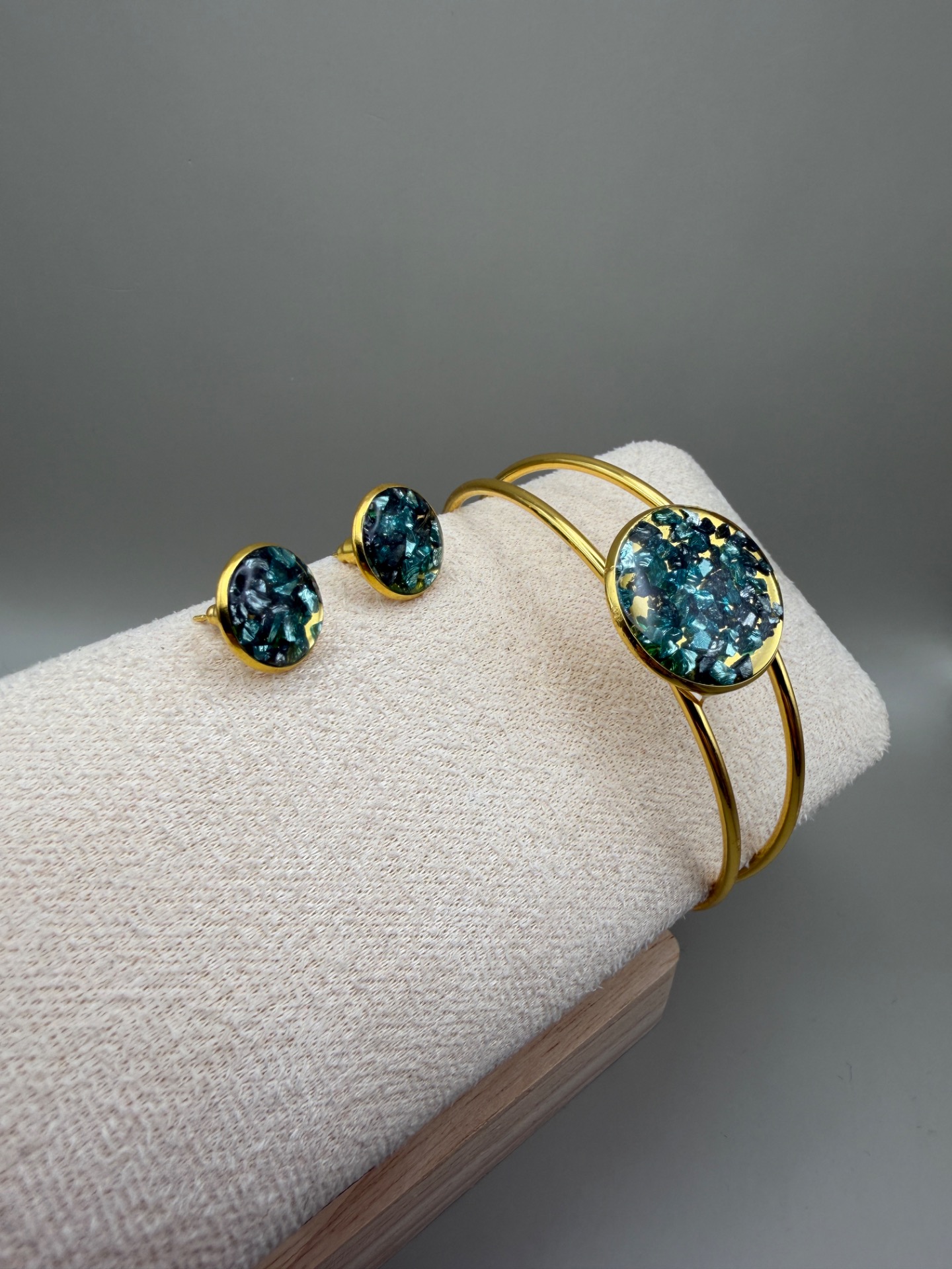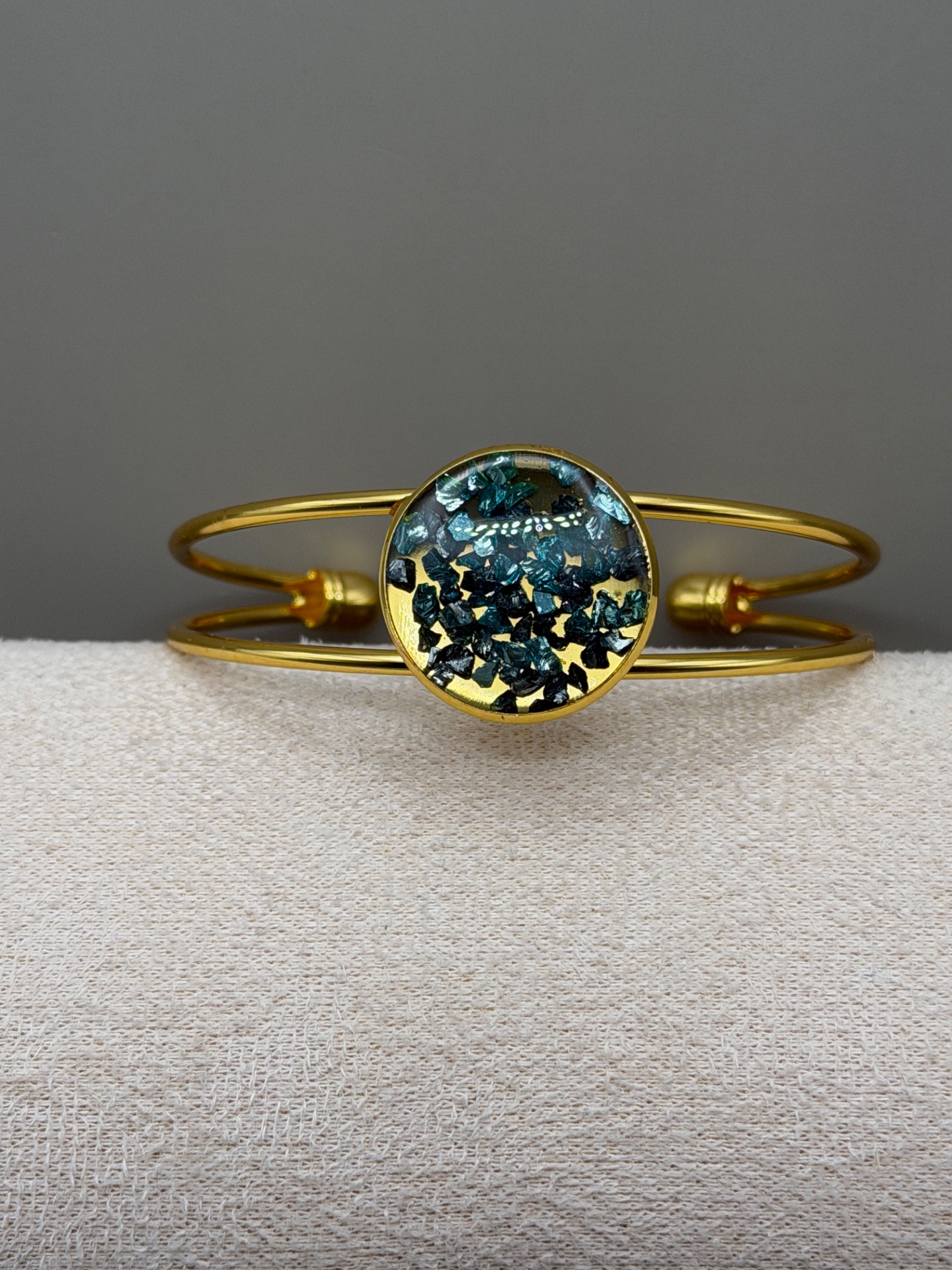 Vackert lekfullt armband med fast ram i guldfärgad koppar och vacker stor platt berlock med en fin mix av turkos och grågrönt glaskross, i kristallklar resin, gjuten för hand för att ge en unik och exklusiv finish.