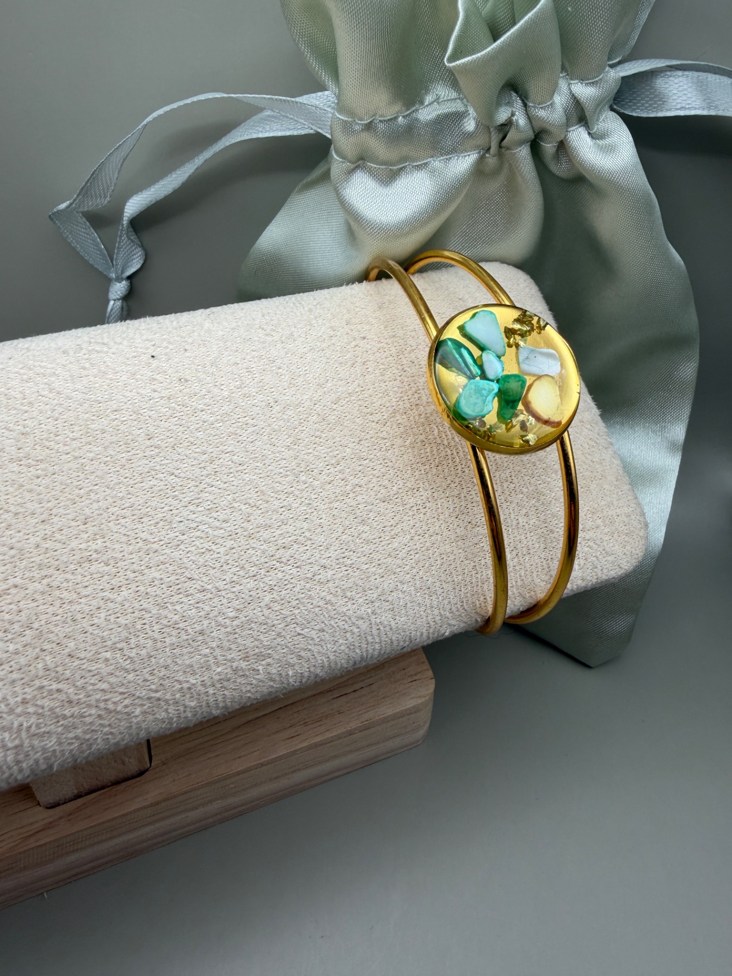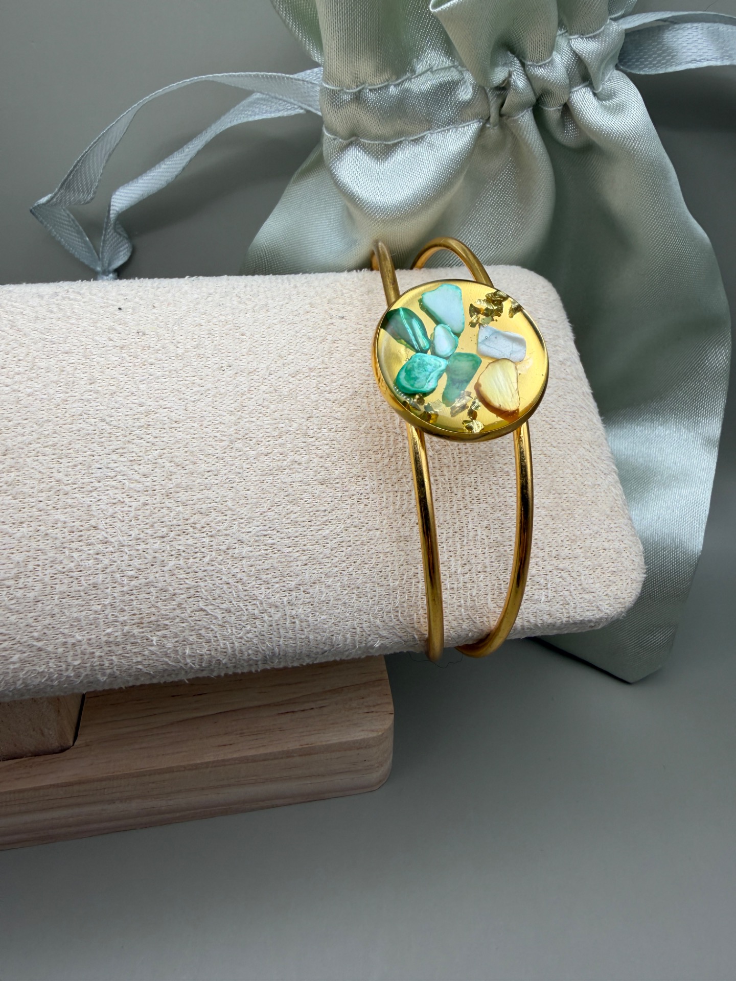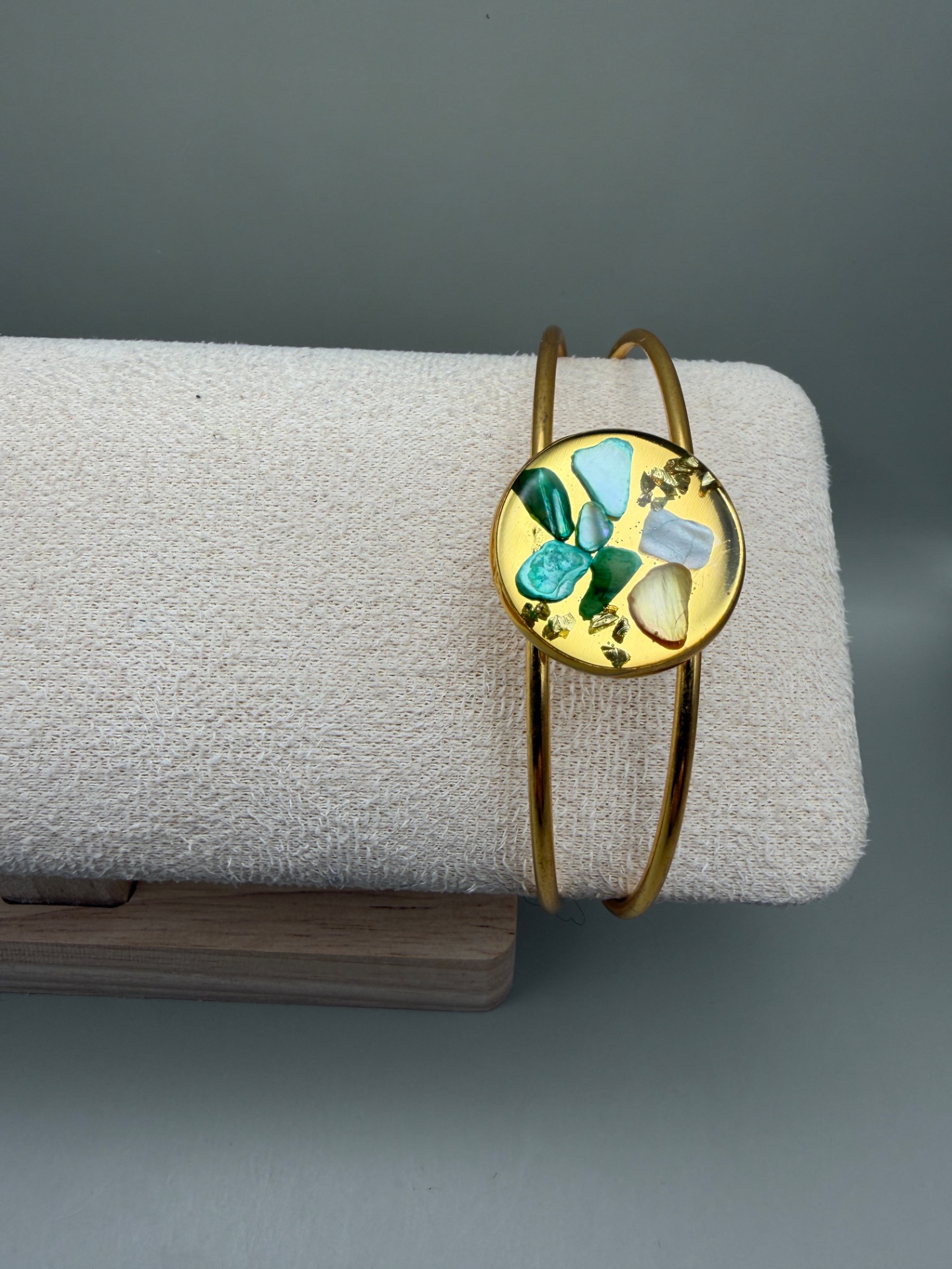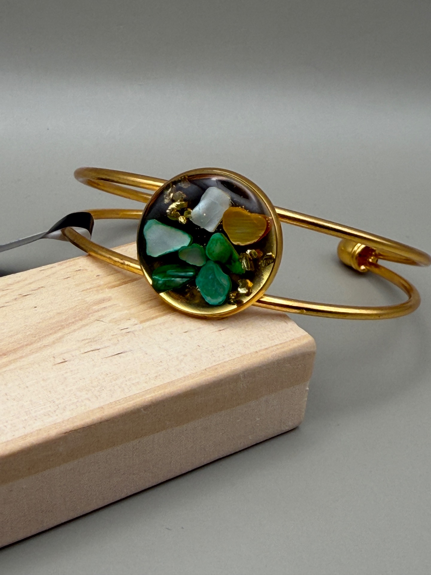 Vackert lekfullt armband med fast guldfärgad ram och vacker stor platt berlock med en fin mix av naturnära färger på stenar, i kristallklar resin, gjuten för hand för att ge en unik och exklusiv finish.