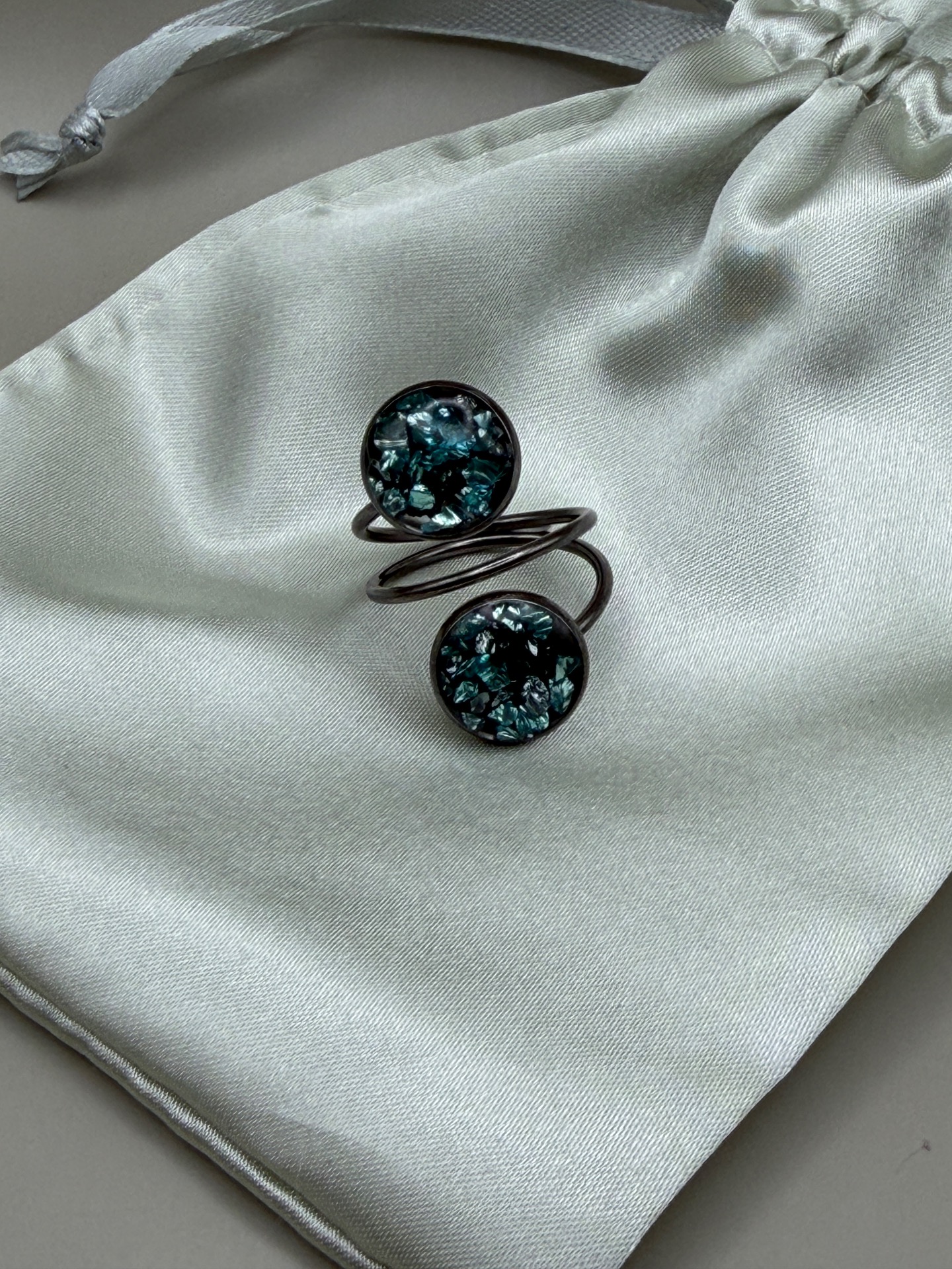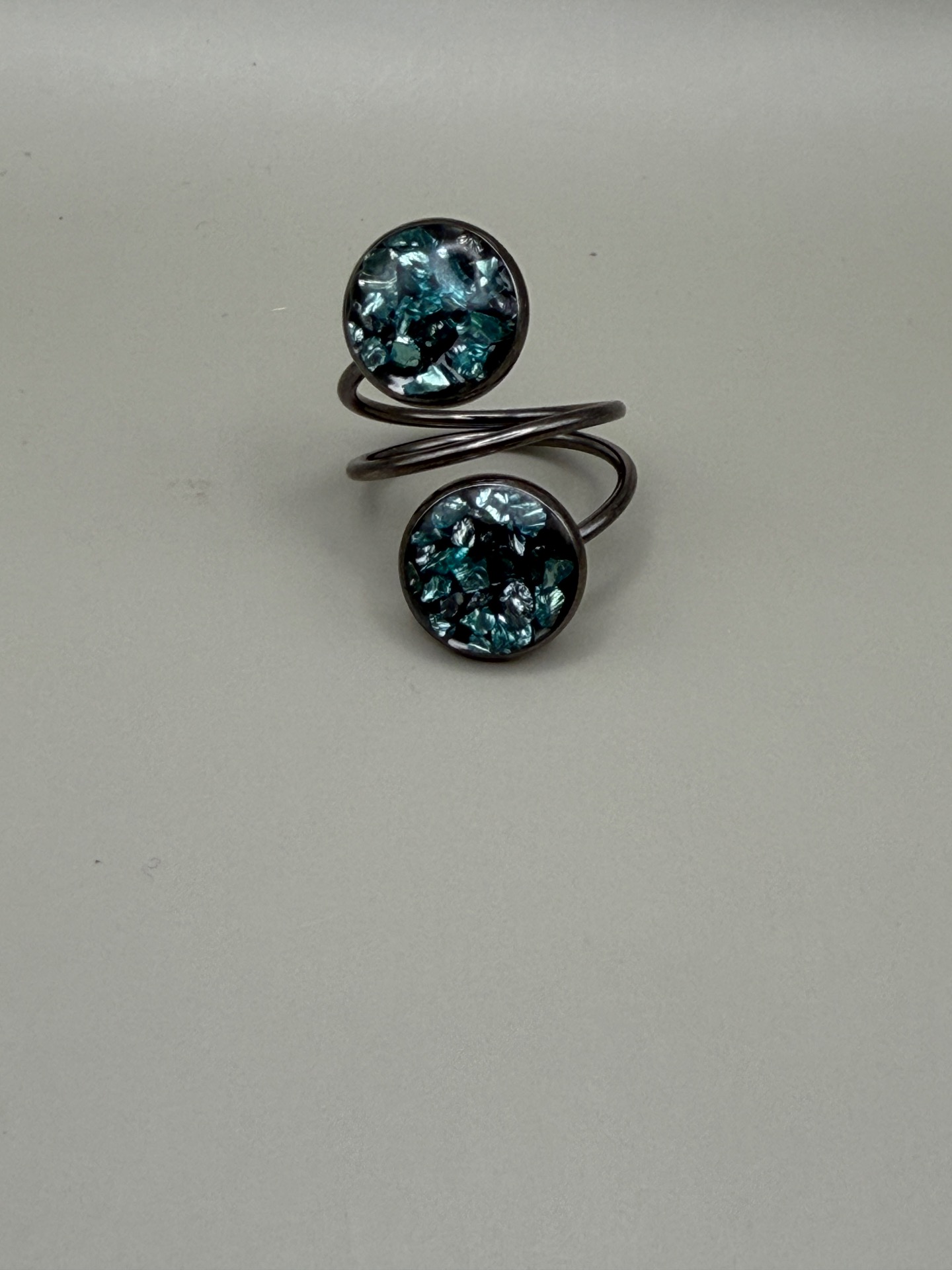 Lekfull ring med två berlocker, båda i en mix av turkost och grågrött glaskrosst lagd i kristallklar resin, gjuten för hand för att ge en unik och exklusiv finish.