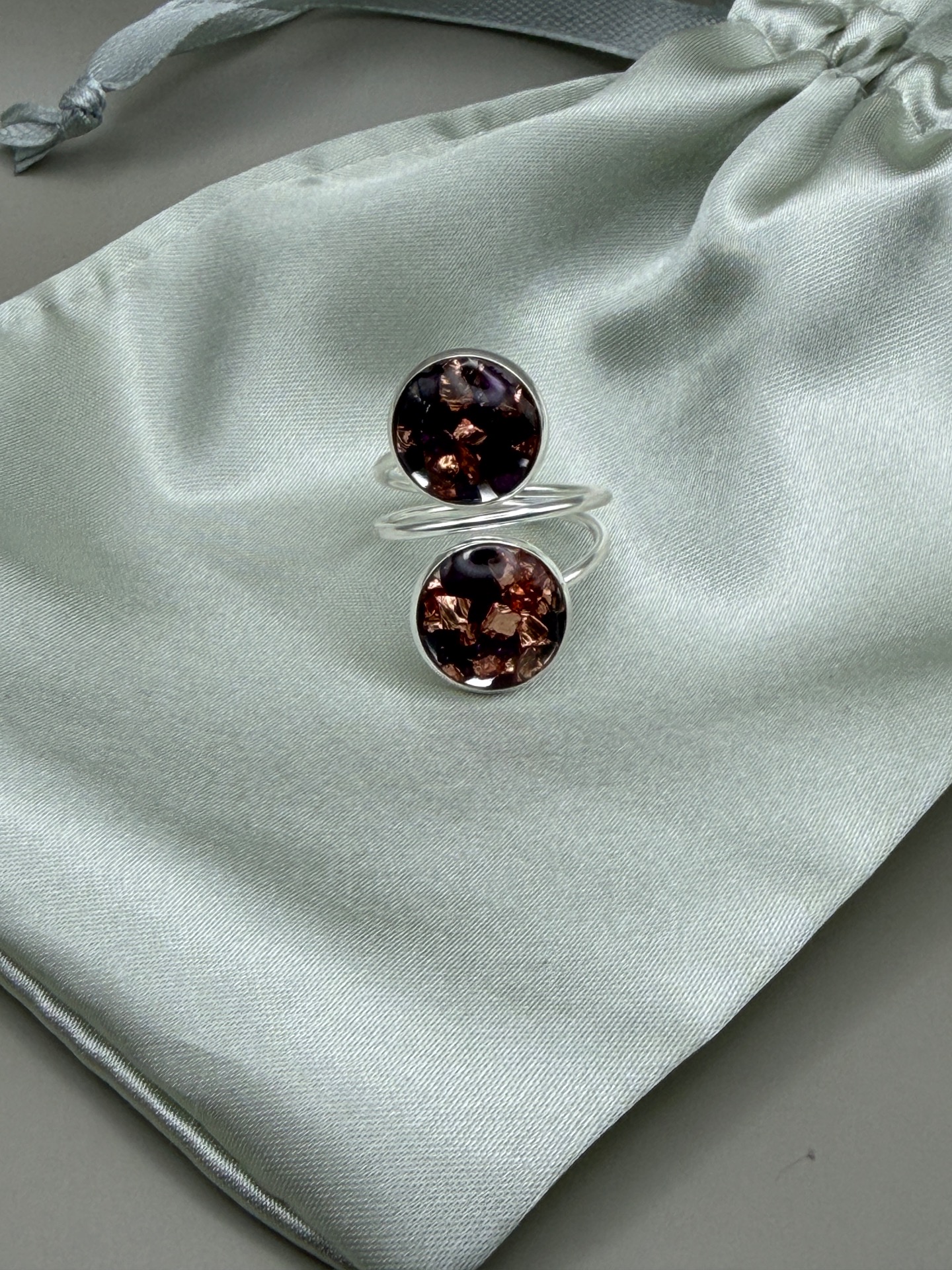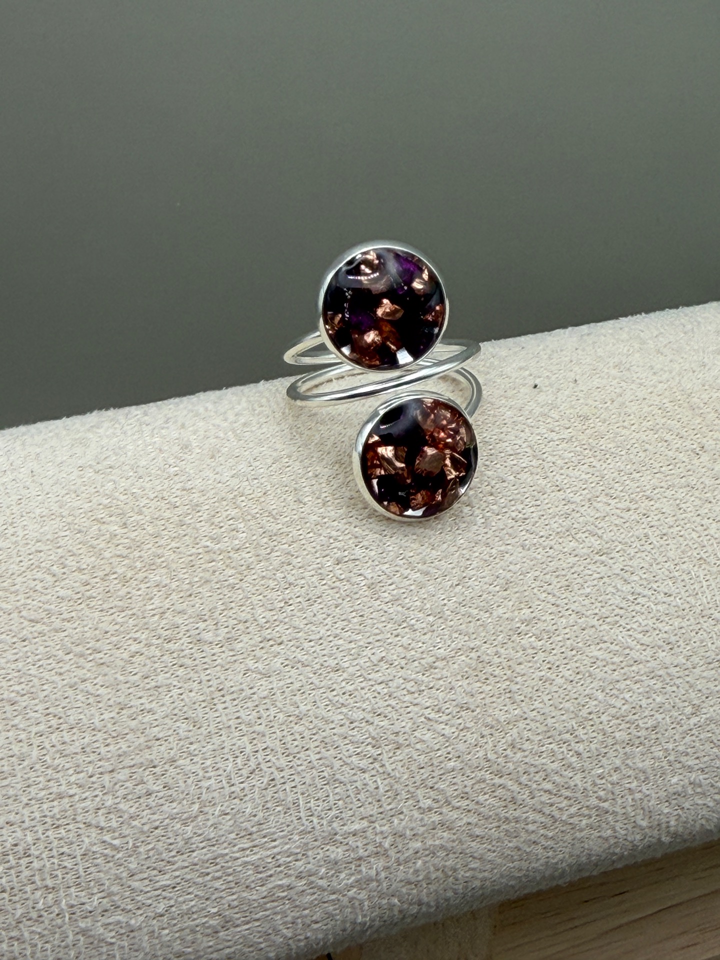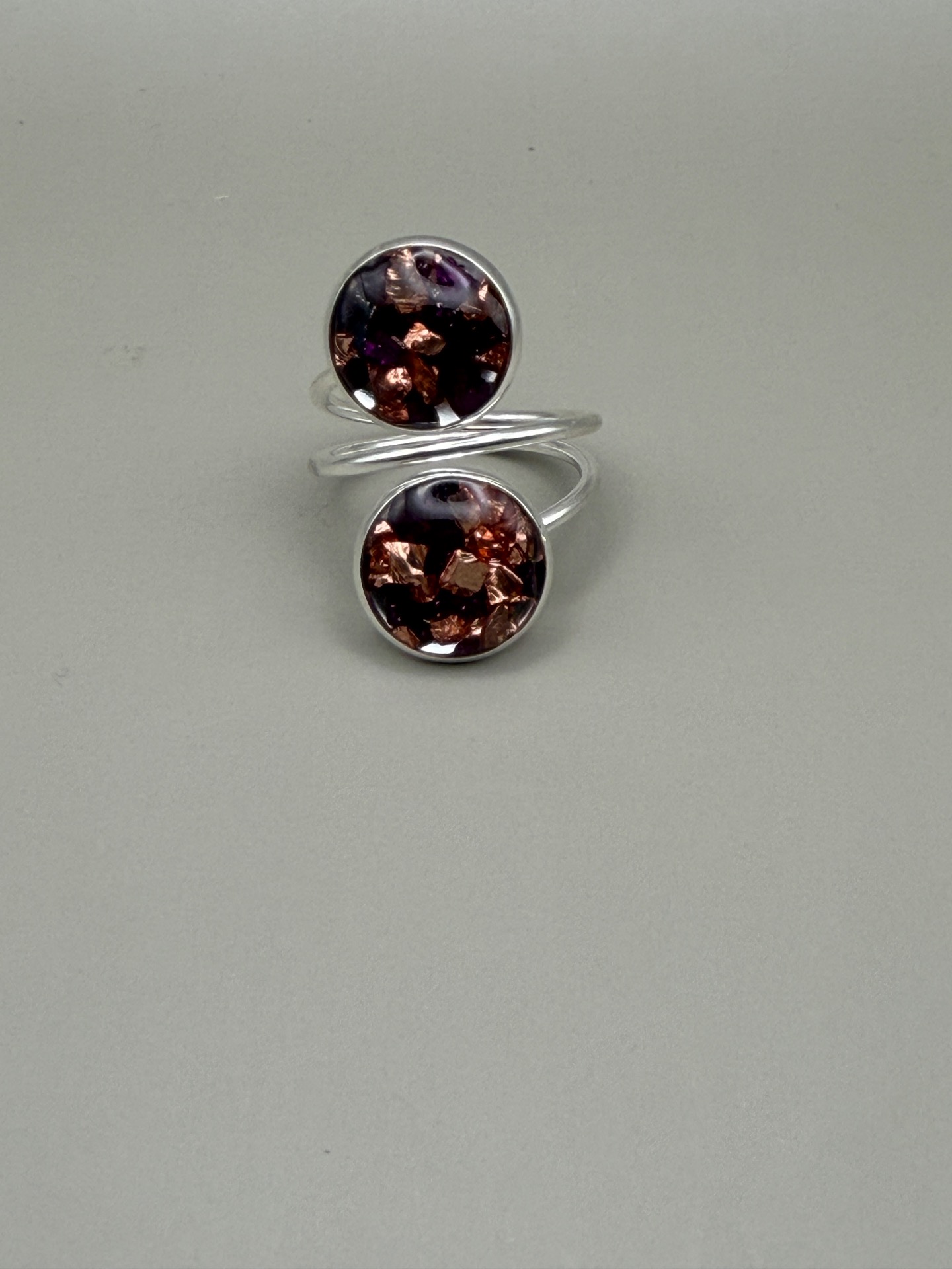 Lekfull ring med två berlocker, båda i en mix av vinrött och koppar glaskross, i lagd i kristallklar resin, gjuten för hand för att ge en unik och exklusiv finish.