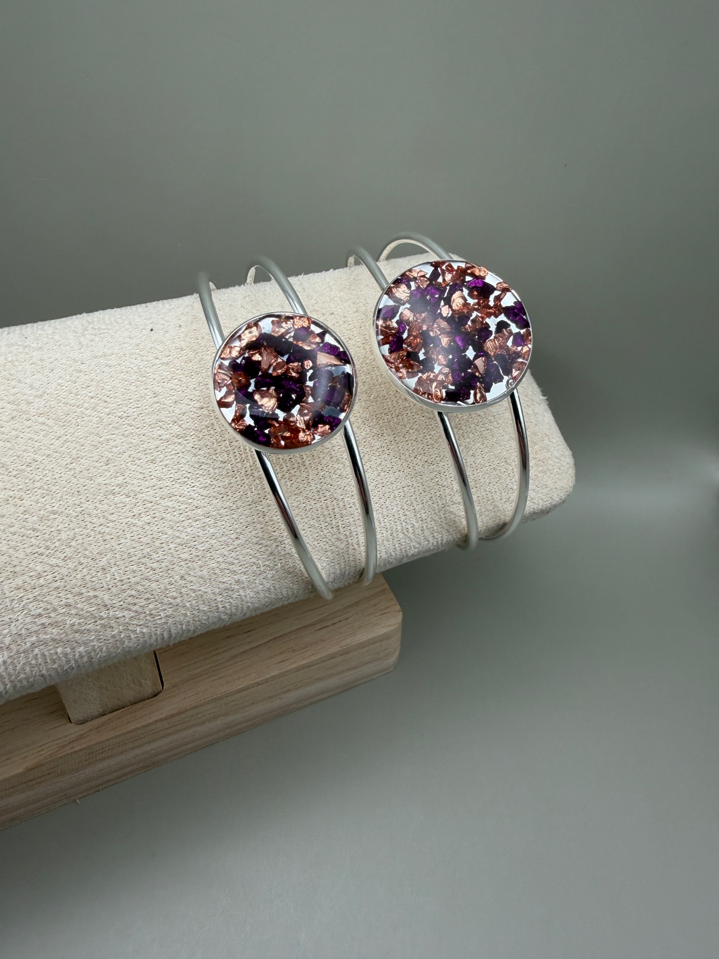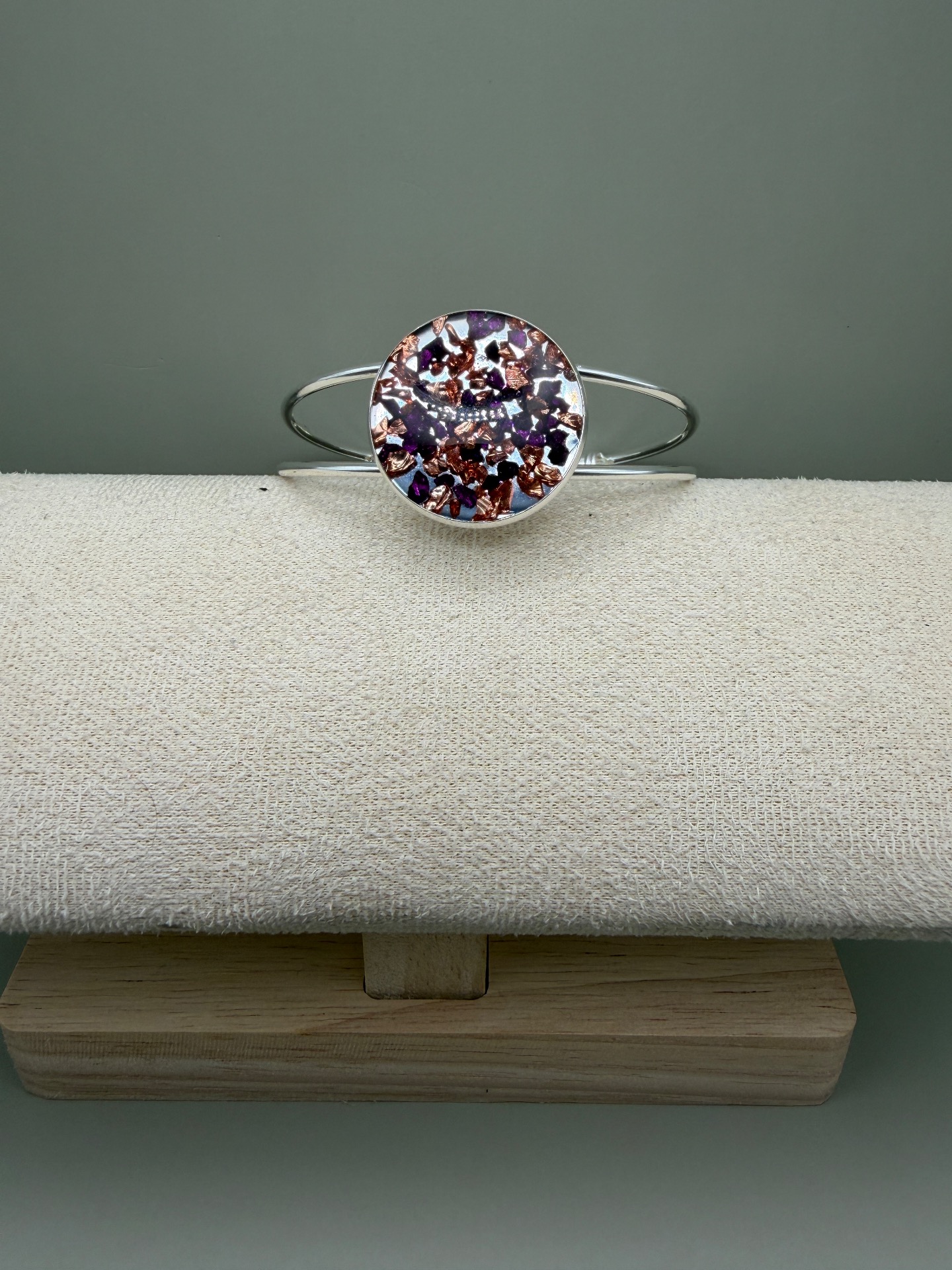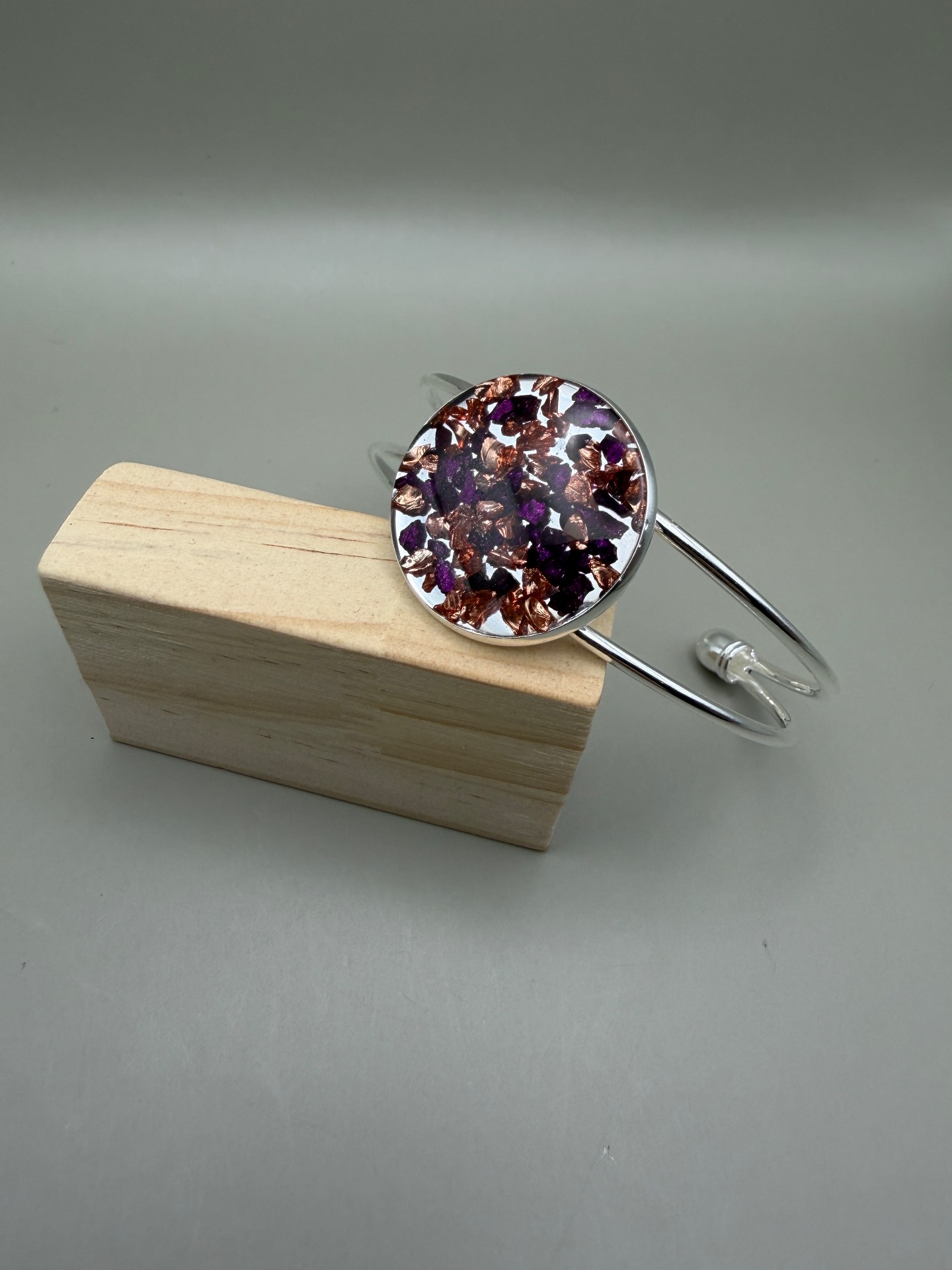 Vackert lekfullt armband med fast silverfärgad ram och vacker stor platt berlock med en fin mix av vinröd och kopparfärrgat glaskross, i kristallklar resin, gjuten för hand för att ge en unik och exklusiv finish.