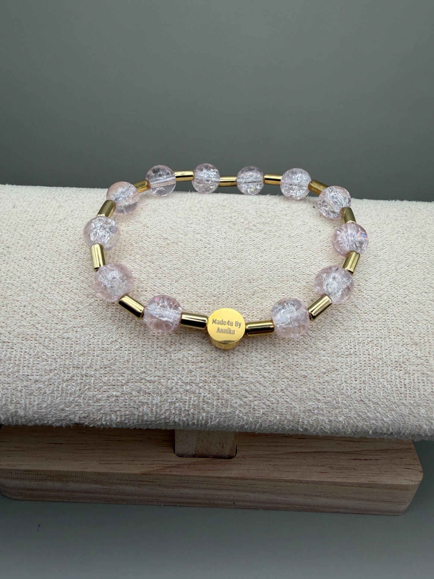 Vackert armband med runda mellerade ljusrosa pärlor varvat med guldfärgade distanser och min signaturpärla.