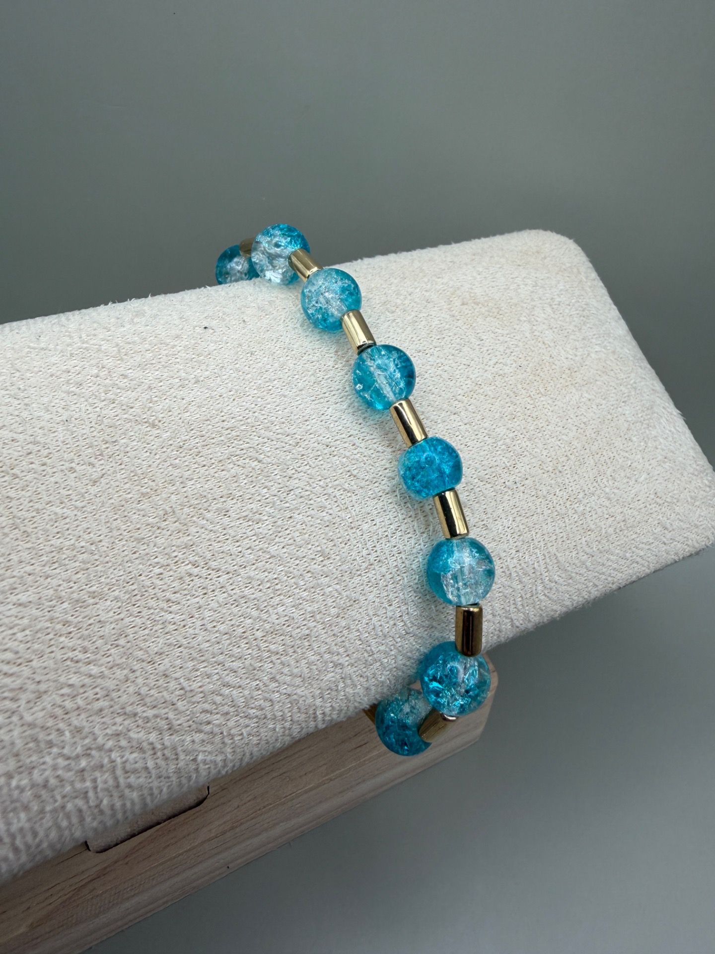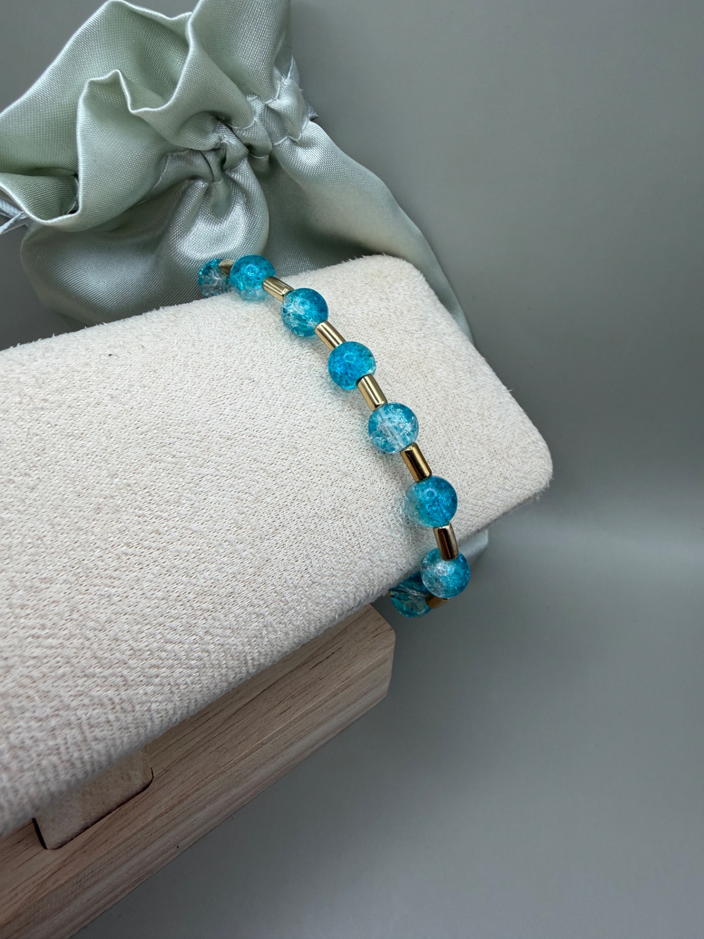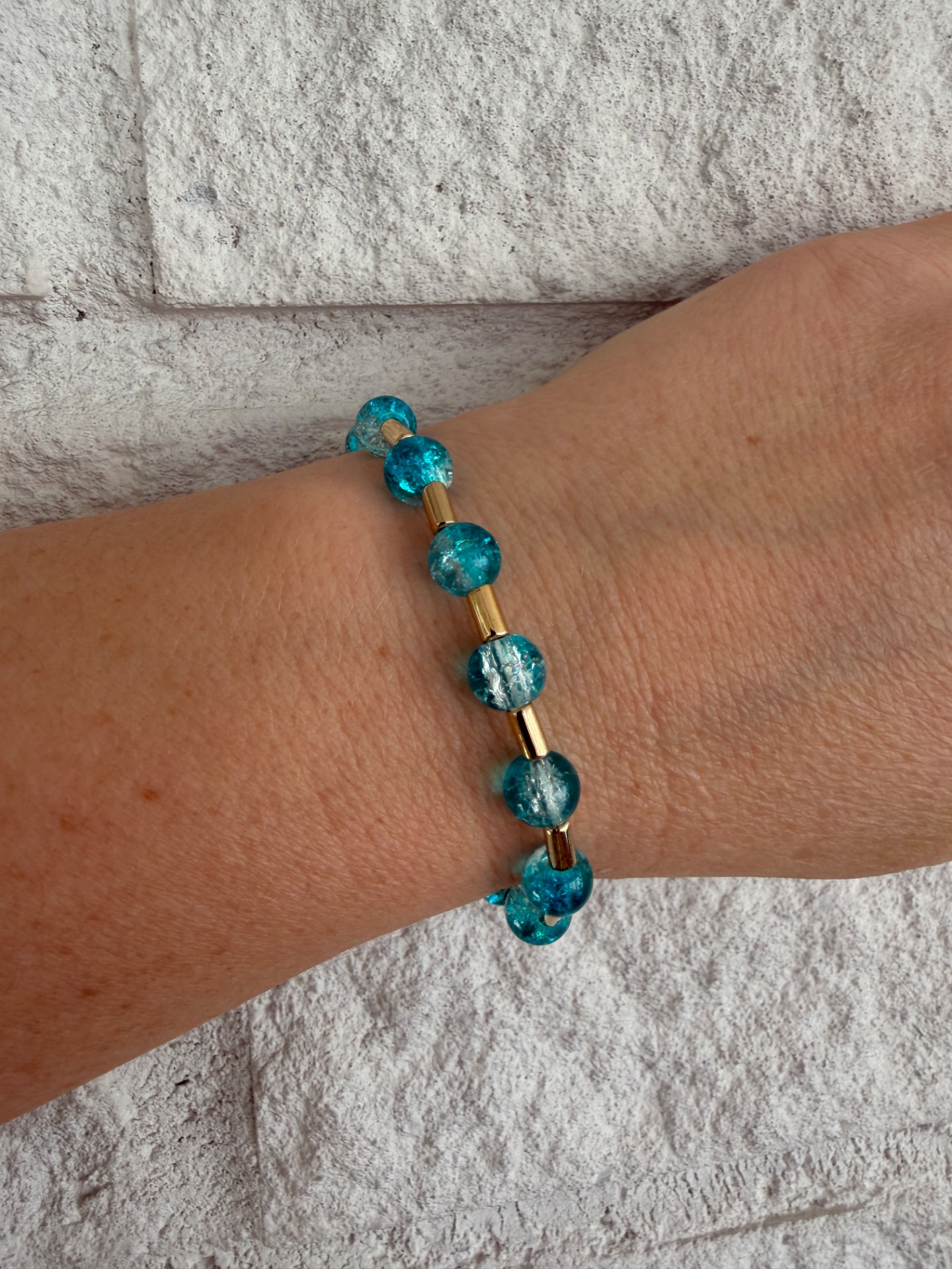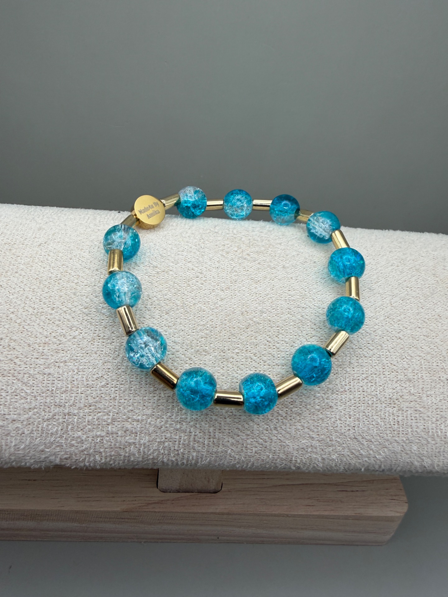 Vackert armband med runda mellerade turkosa pärlor varvat med guldfärgade distanser och min signaturpärla.