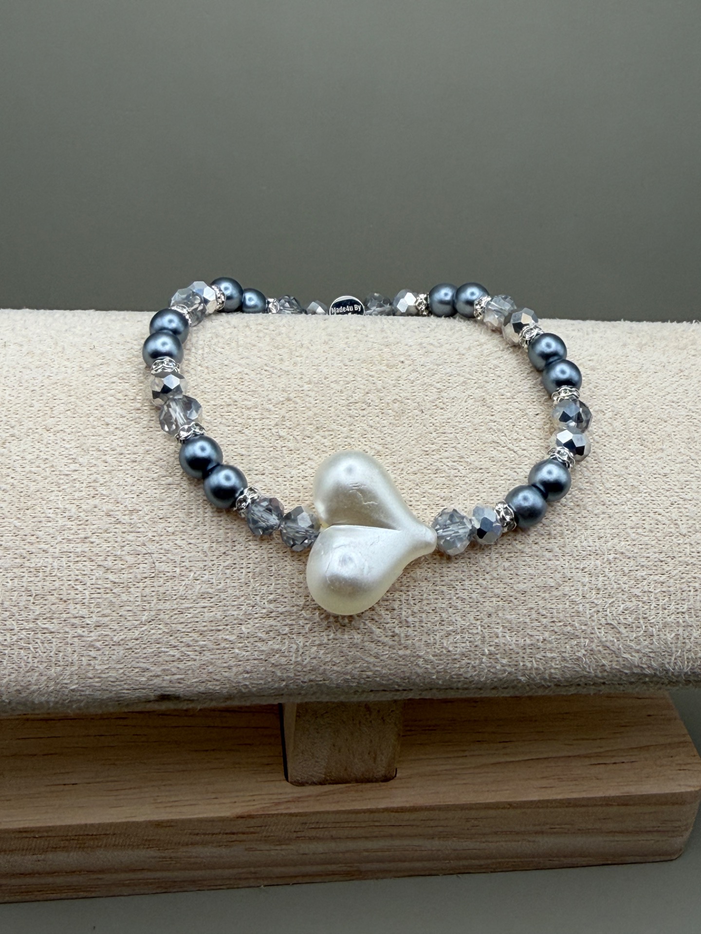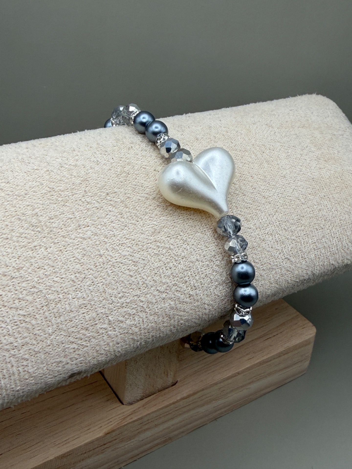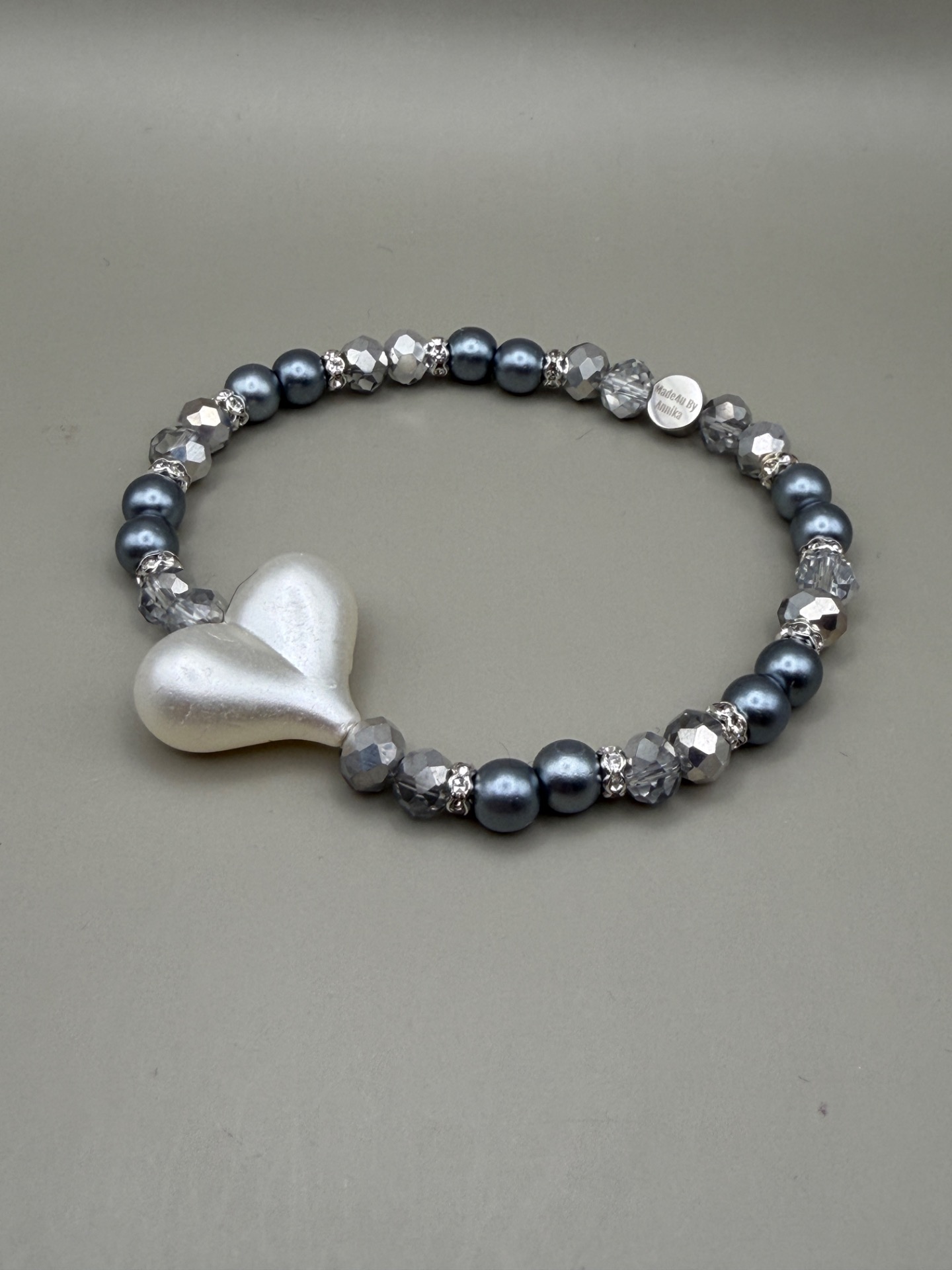 Armband med varvat mönster av stålgrå runda pärlor och facetterade silvergrå glaskristallpärlor och strass med vackert benvitt hjärta som  fångar blicken, och designen avslutas med min signaturpärla.