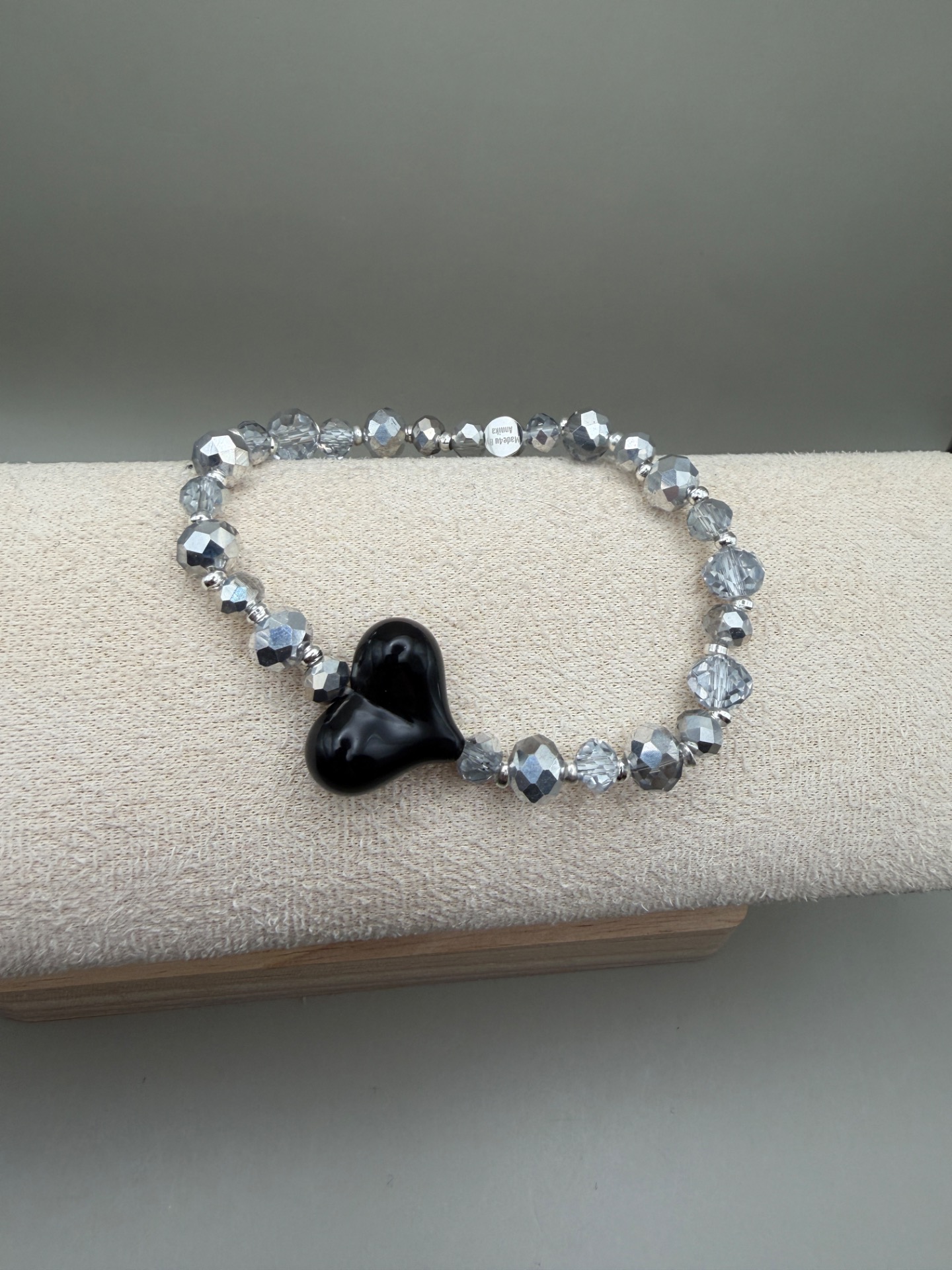 Armband i varvat stora och mellanstora facetterade silvergrå glaskristallpärlor och silverfärgade distanser och ett vackert svart hjärta som fångar blicken. Armbandet avsslutas med min signaturpärla.