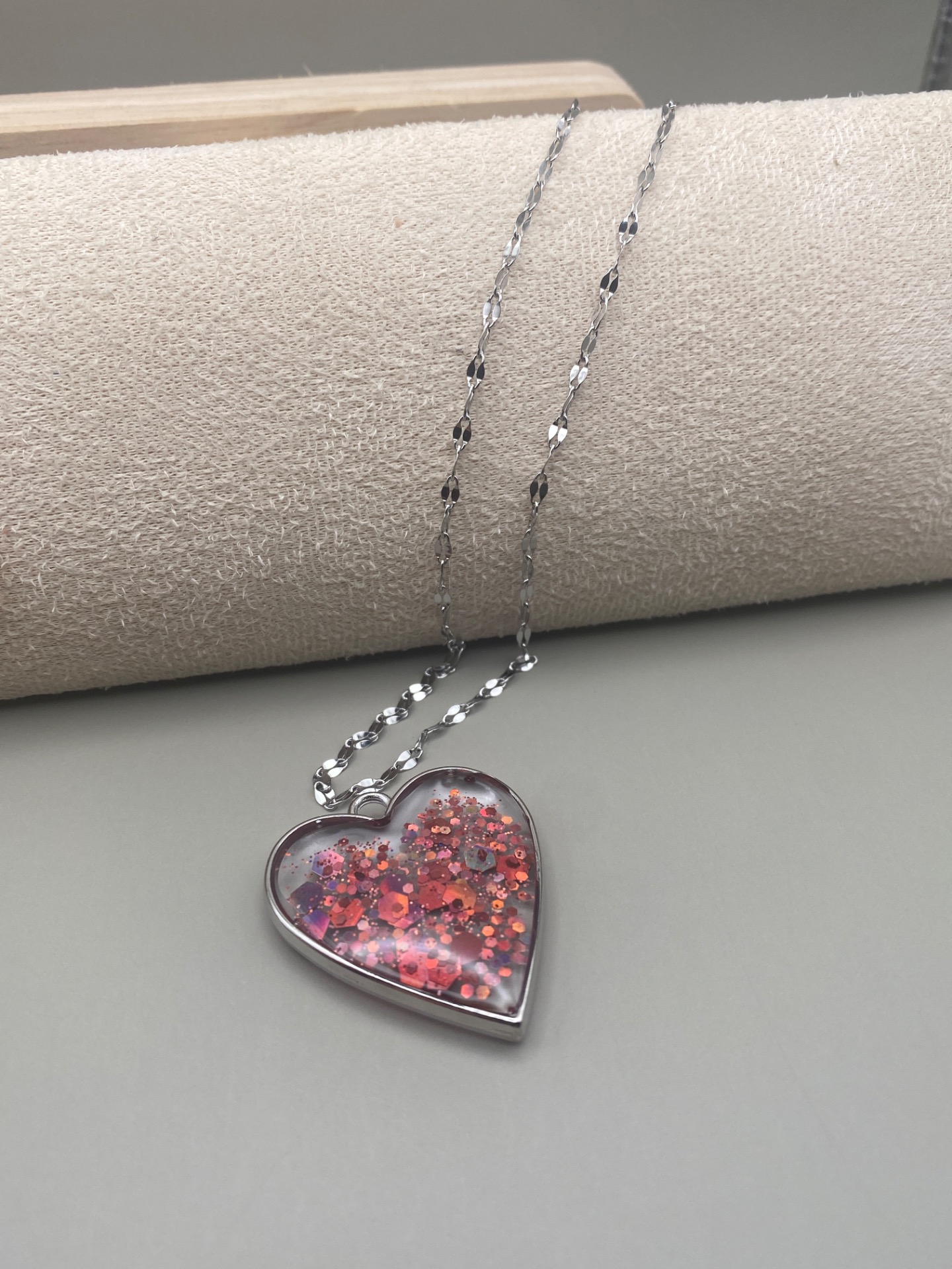 Förtrollande halsband med en vacker hjärtformad silverfärgad berlock med rött sparkling glitter inuti. Kan väljas med svart läderhalsband eller silverfärgat halsband i rostfritt stål.
