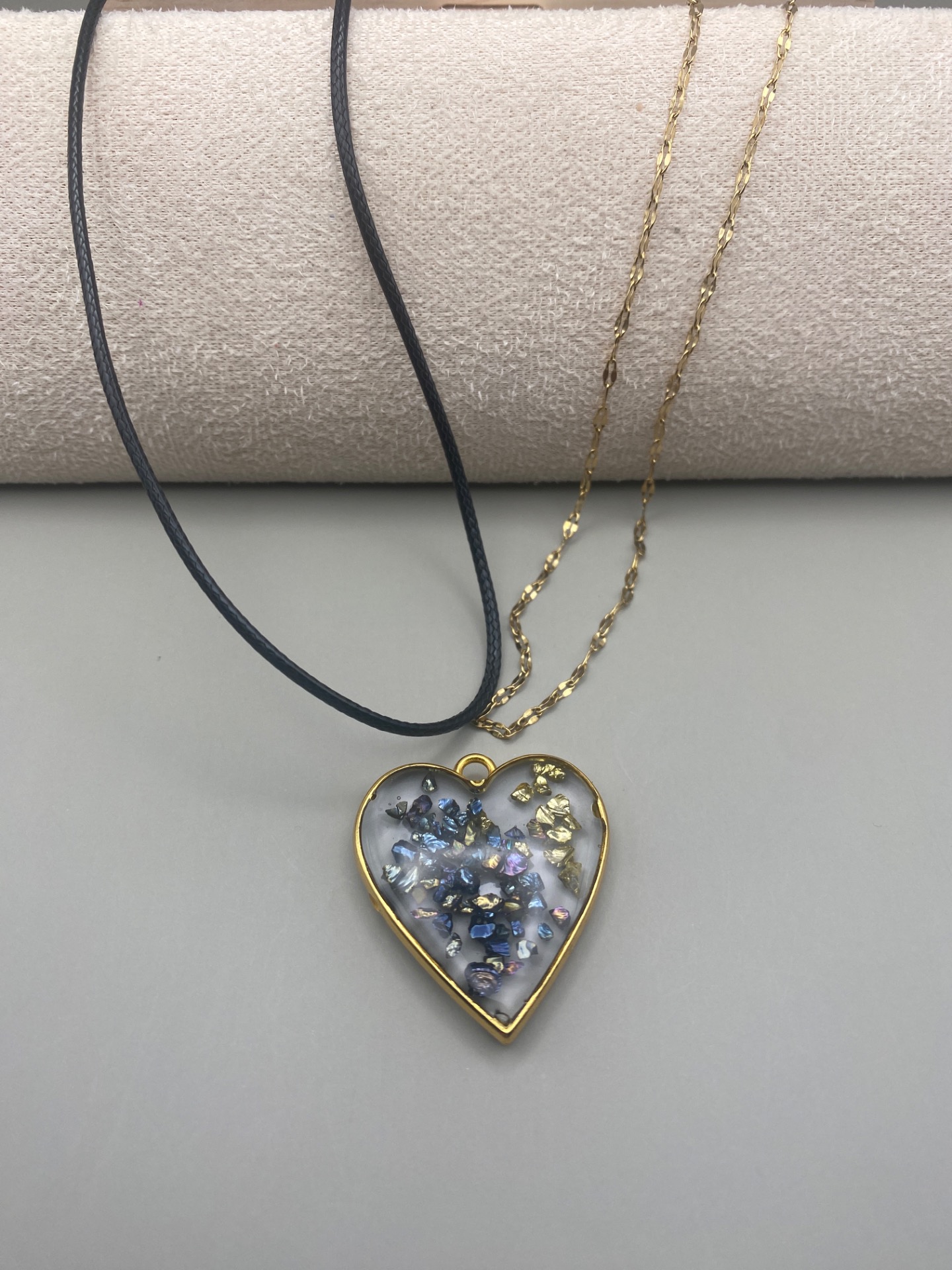 Förtrollande halsband med en vacker hjärtformad guldfärgad berlock med grågrönt och guldfärgat glitterkross inuti. Kan väljas med svart läderhalsband eller guldfärgat halsband i rostfritt stål.