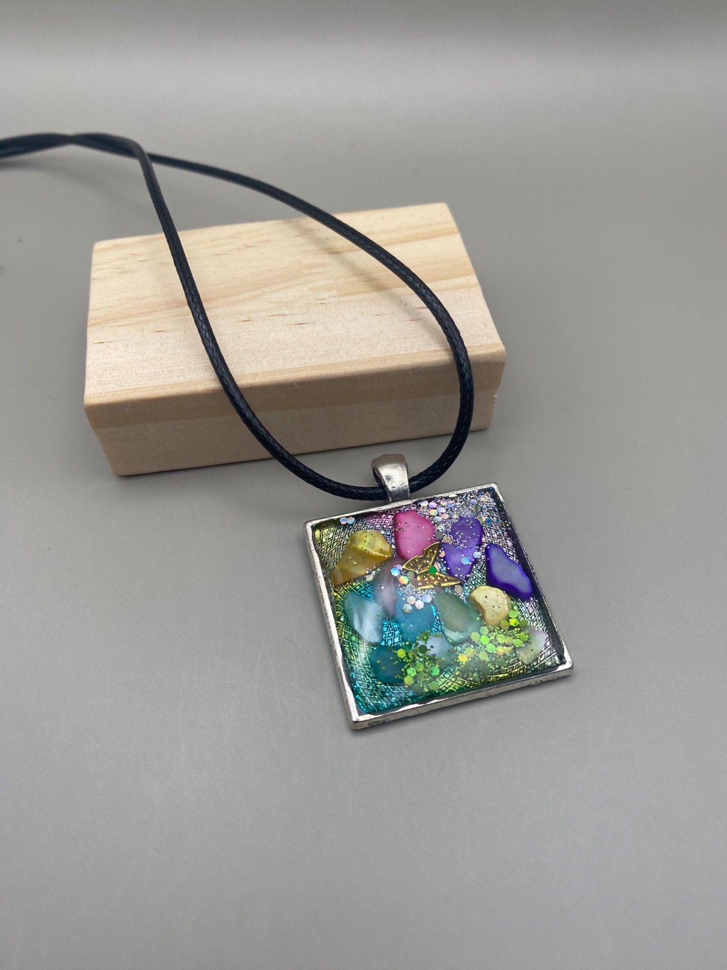 Förtrollande halsband med en vacker fyrkantig silverfärgad berlock med härligt färglatt skimrande mönster grågrönt inuti, svart halsband.