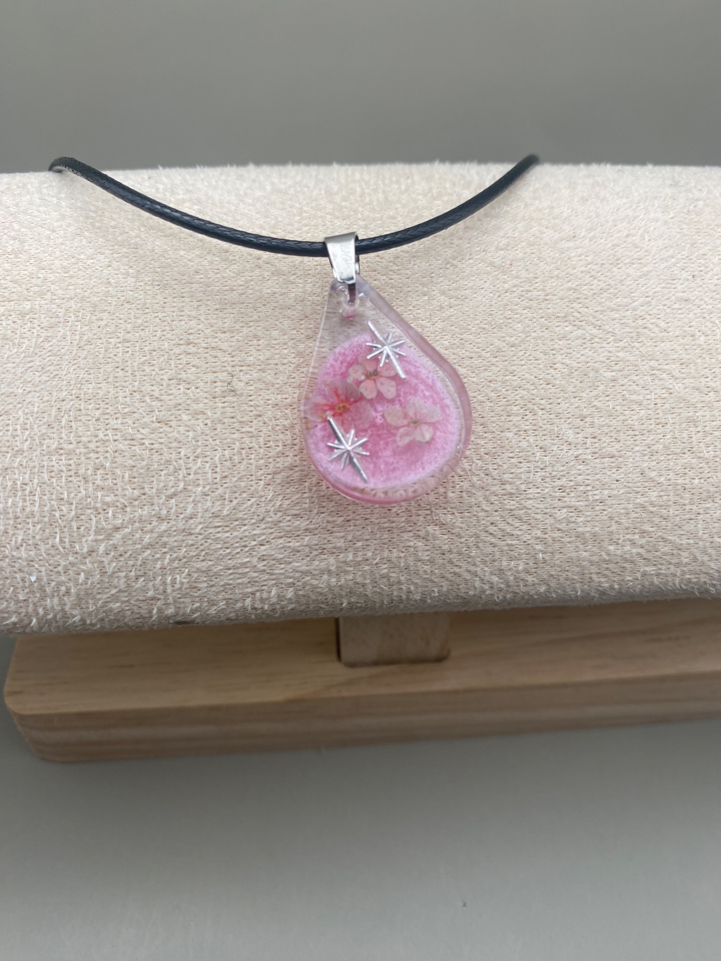 Lekfullt halsband med en vacker droppformad berlock med ljusrosa detaljer och svart läderhalsband.