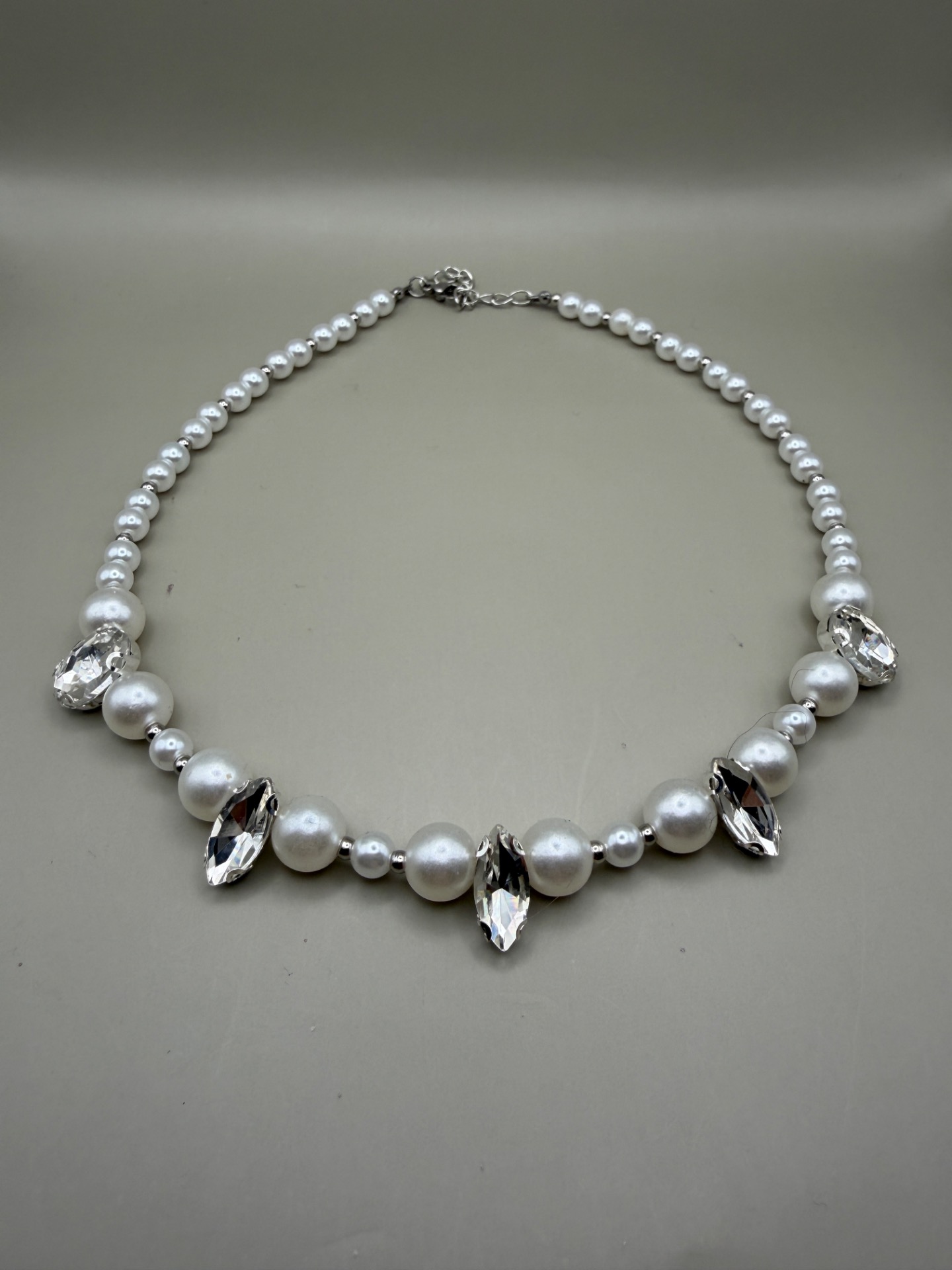 Ett vackert halsband i ett varvat mönster av små och mellanstora vita, högblanka pärlor. Smycket är dekorerat med små silverfärgade distanser och klar strass som ger ett fint ljusspel. Halsbandet är en kort modell som vilar högt upp vid nyckelbenen och har reglerbar längd för bästa passform.