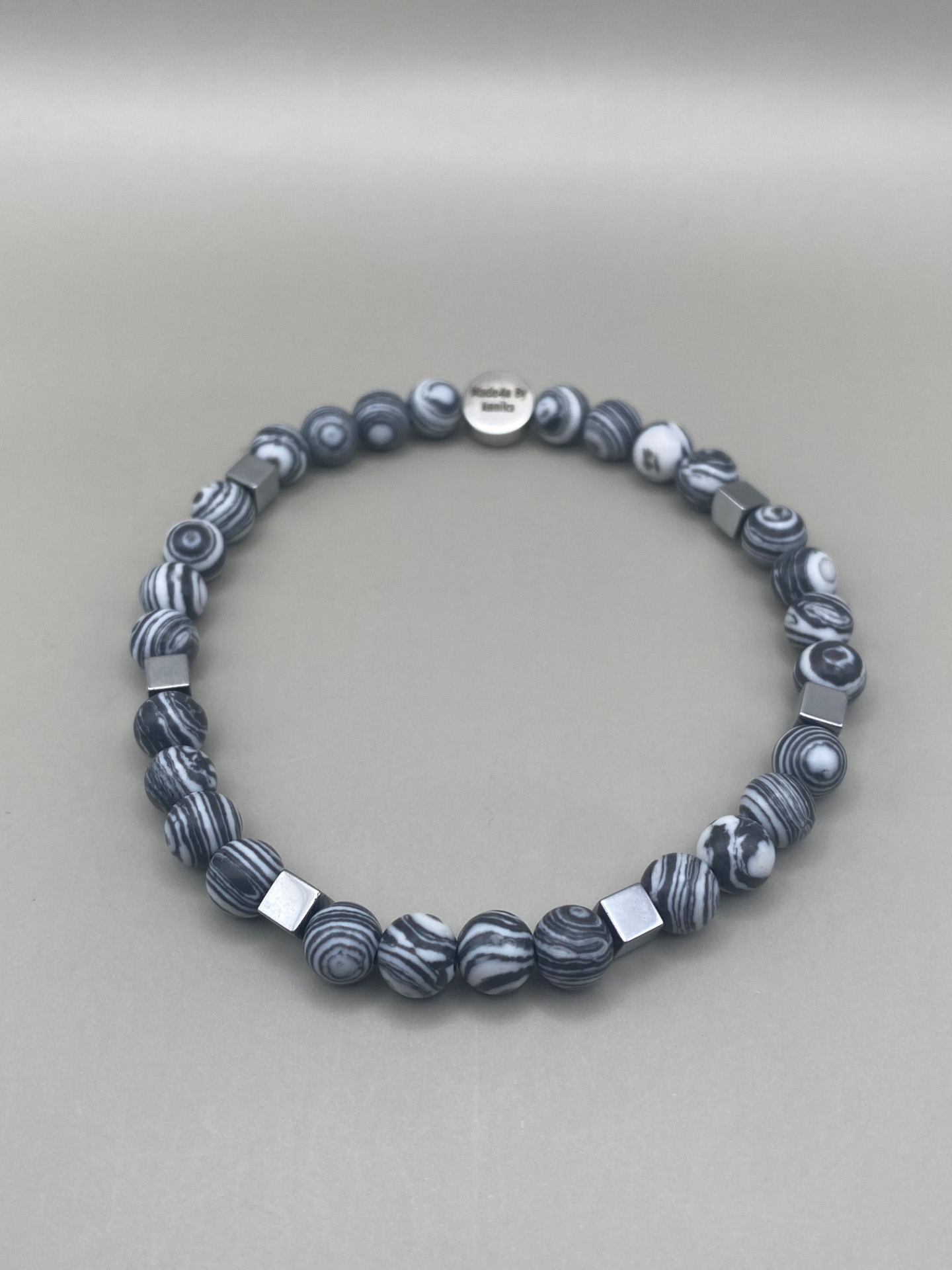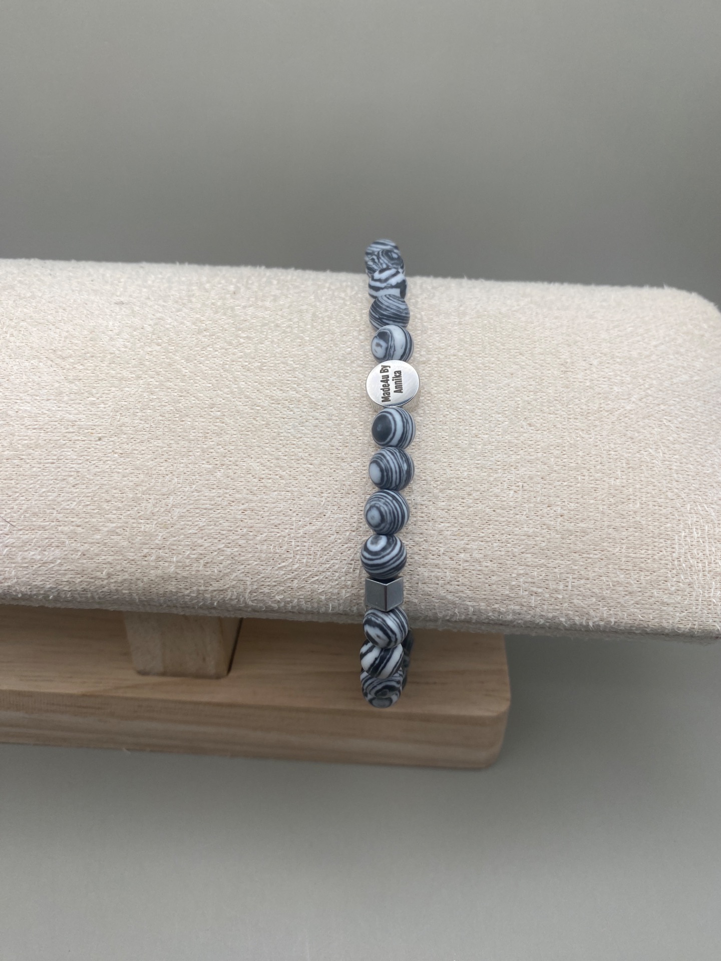 Stiligt armband med vackra grå-och vitmellerade stenpärlor och fyrkantiga pärlor och stilig avslutspärla i rostfritt stål