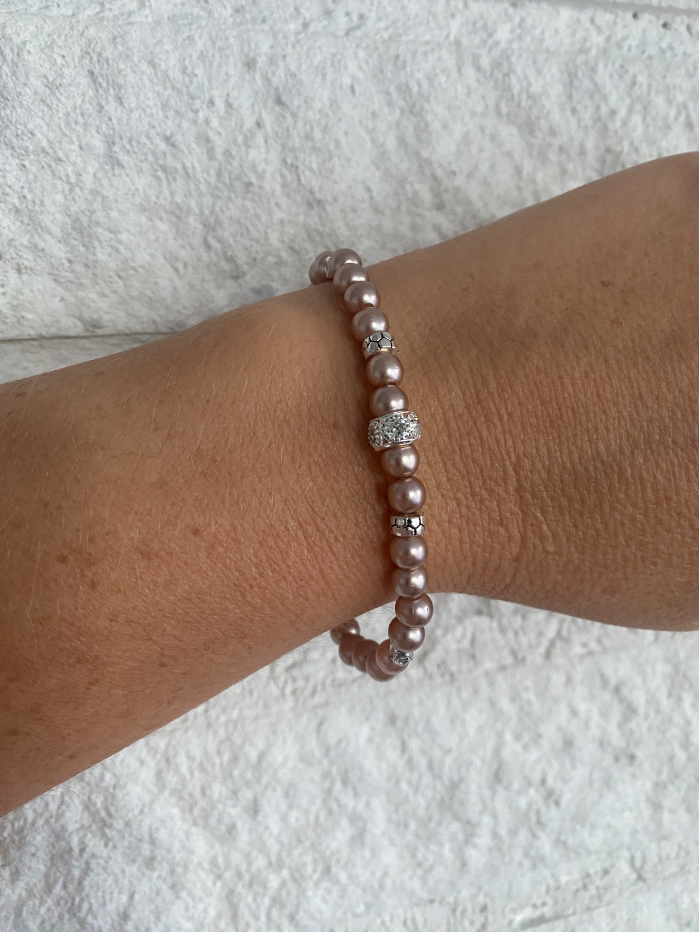 Vackert armband i champagnefärgade mindre pärlor varvat med silverfärgade distanser och vacker strass och avslutspärla.