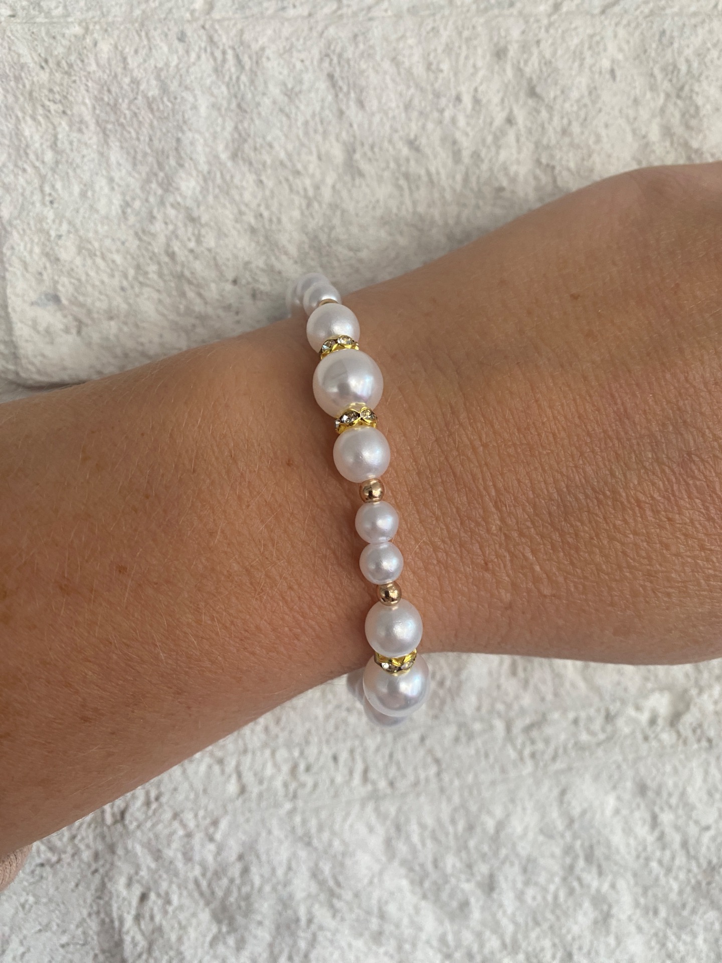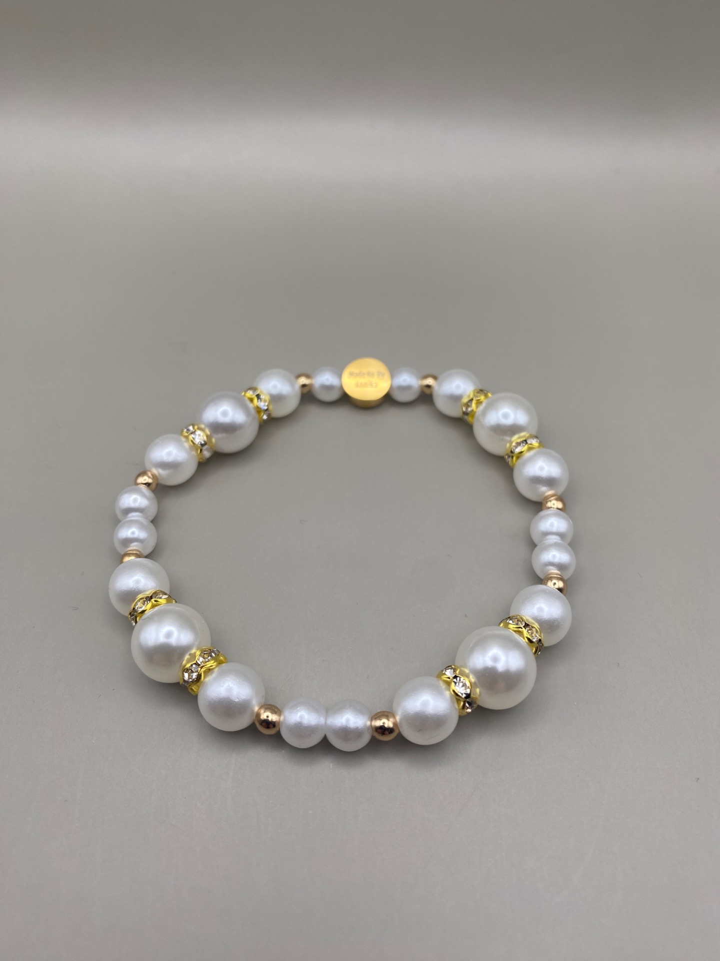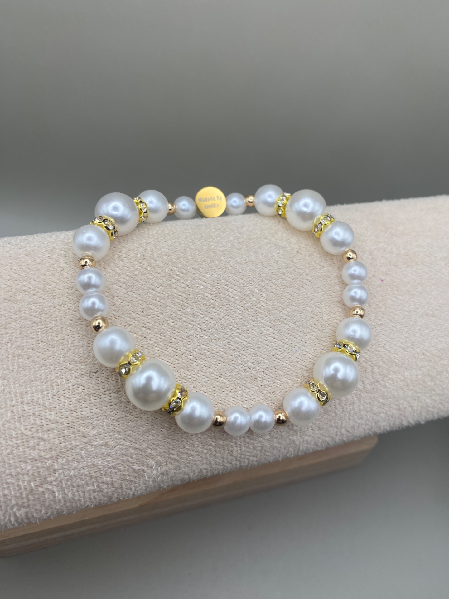 Vackert armband i mönster av kritvita pärlor i olika storlekar och guldfärgade detaljer och strass.