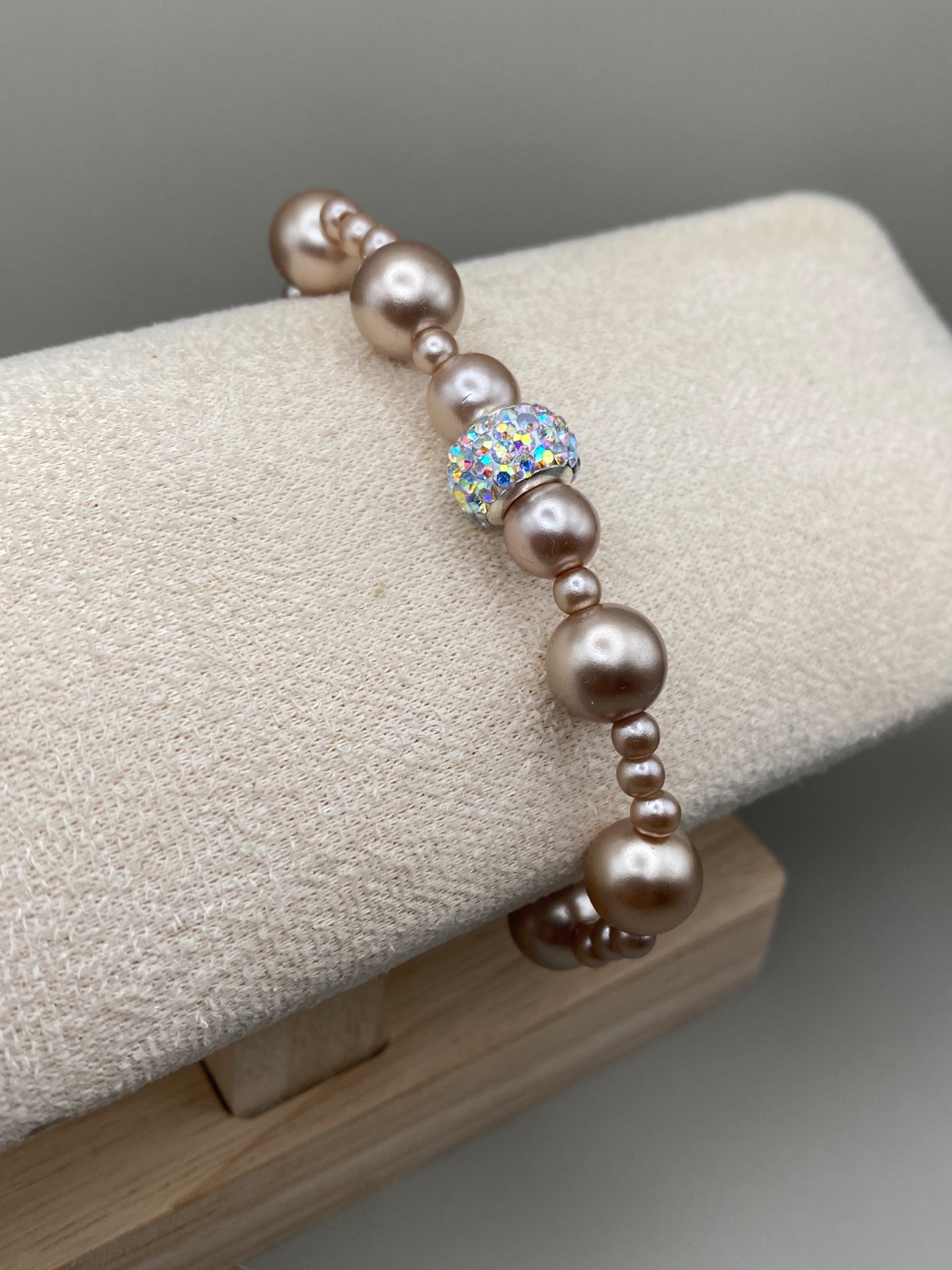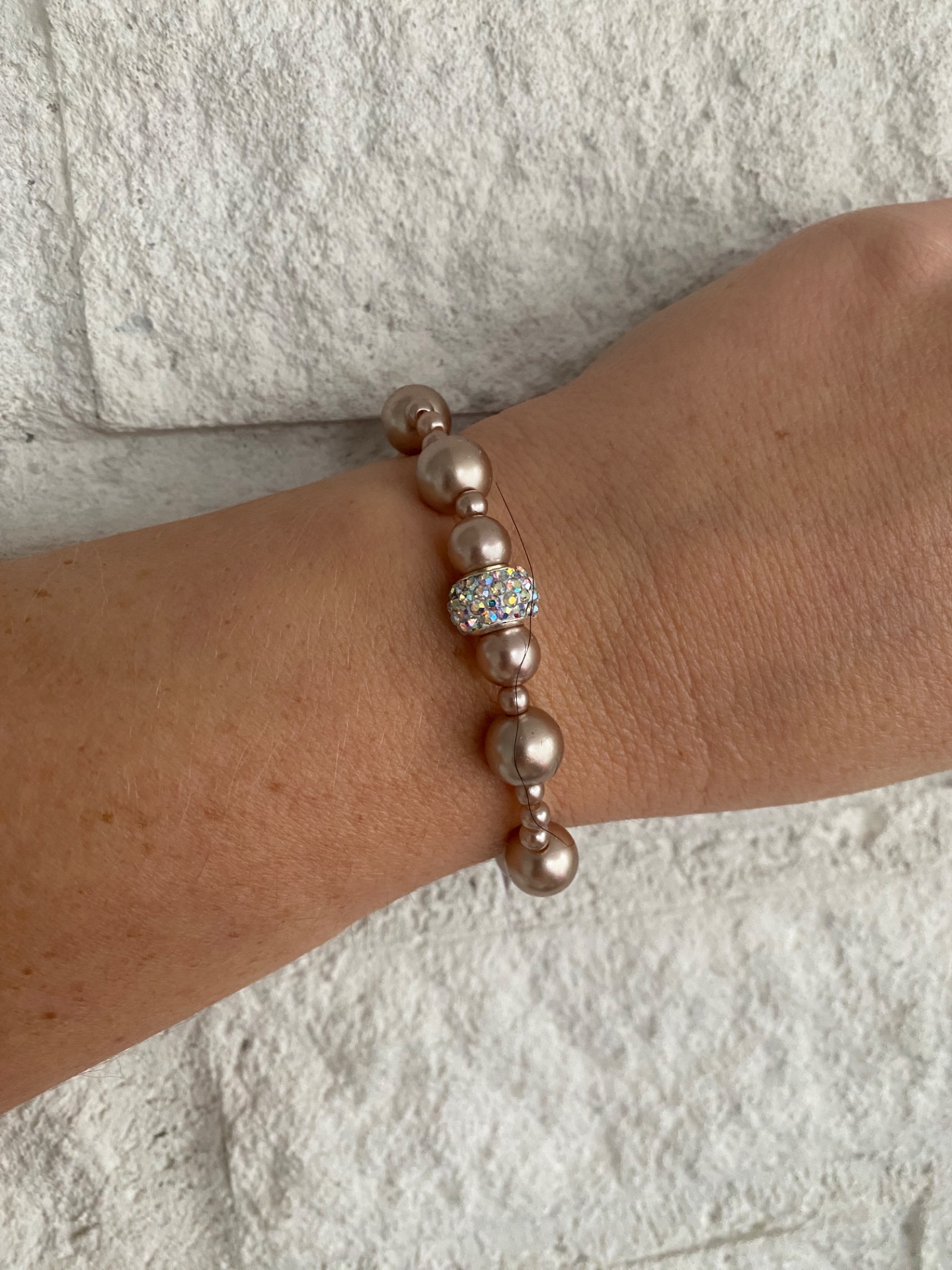Vackert armband i mönster av chamapagnefärgade pärlor i olika storlekar och vacker flerfärgad strass i blickfånget. Avslutas som vanligt med min signaturpärla.