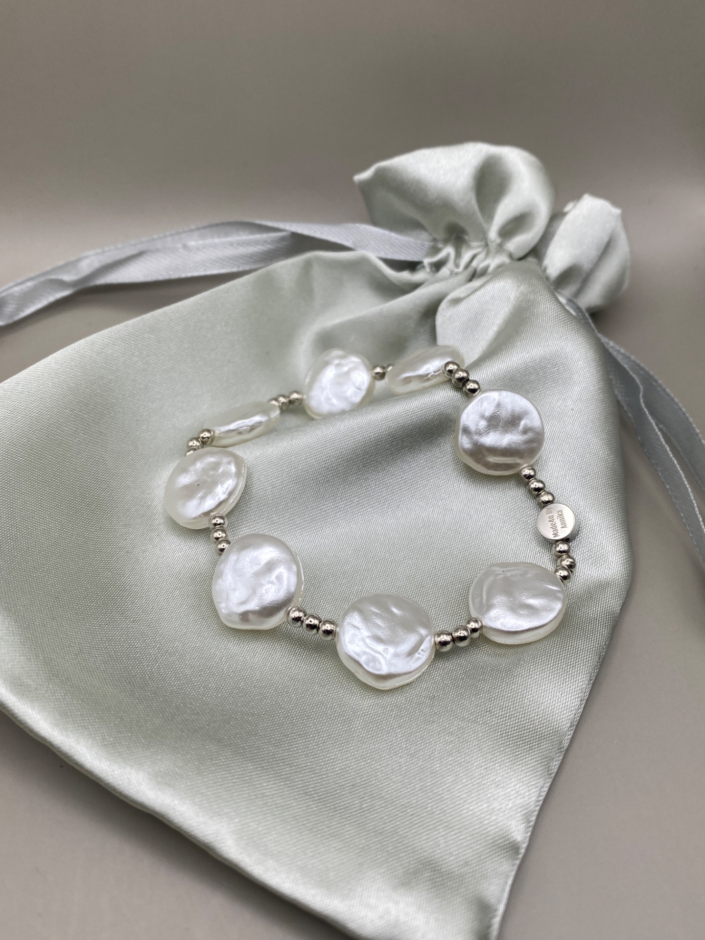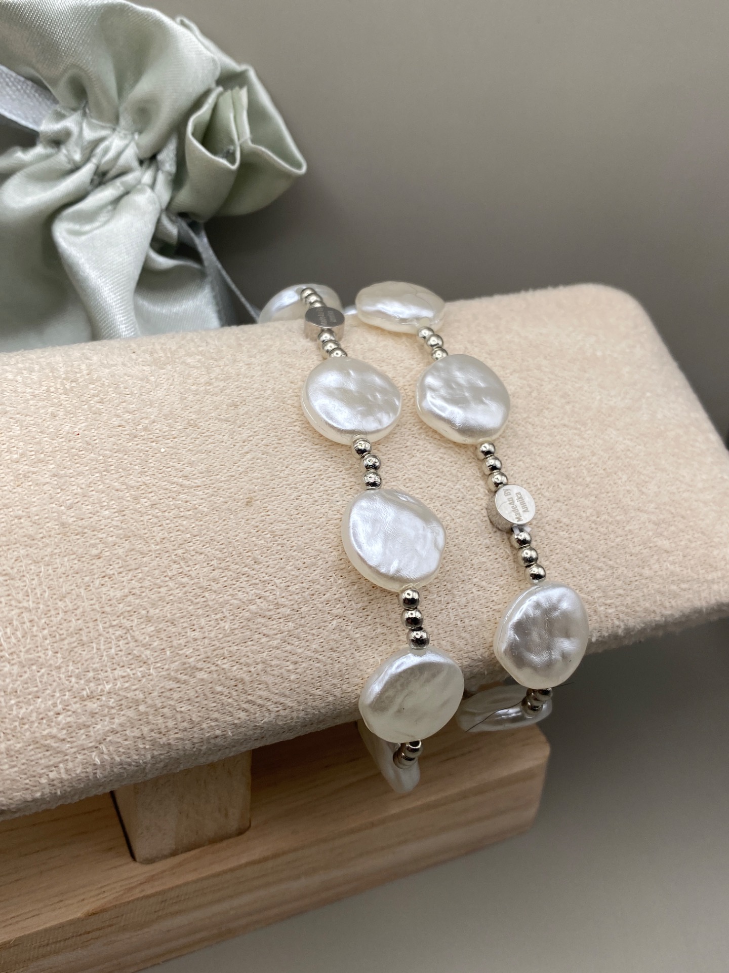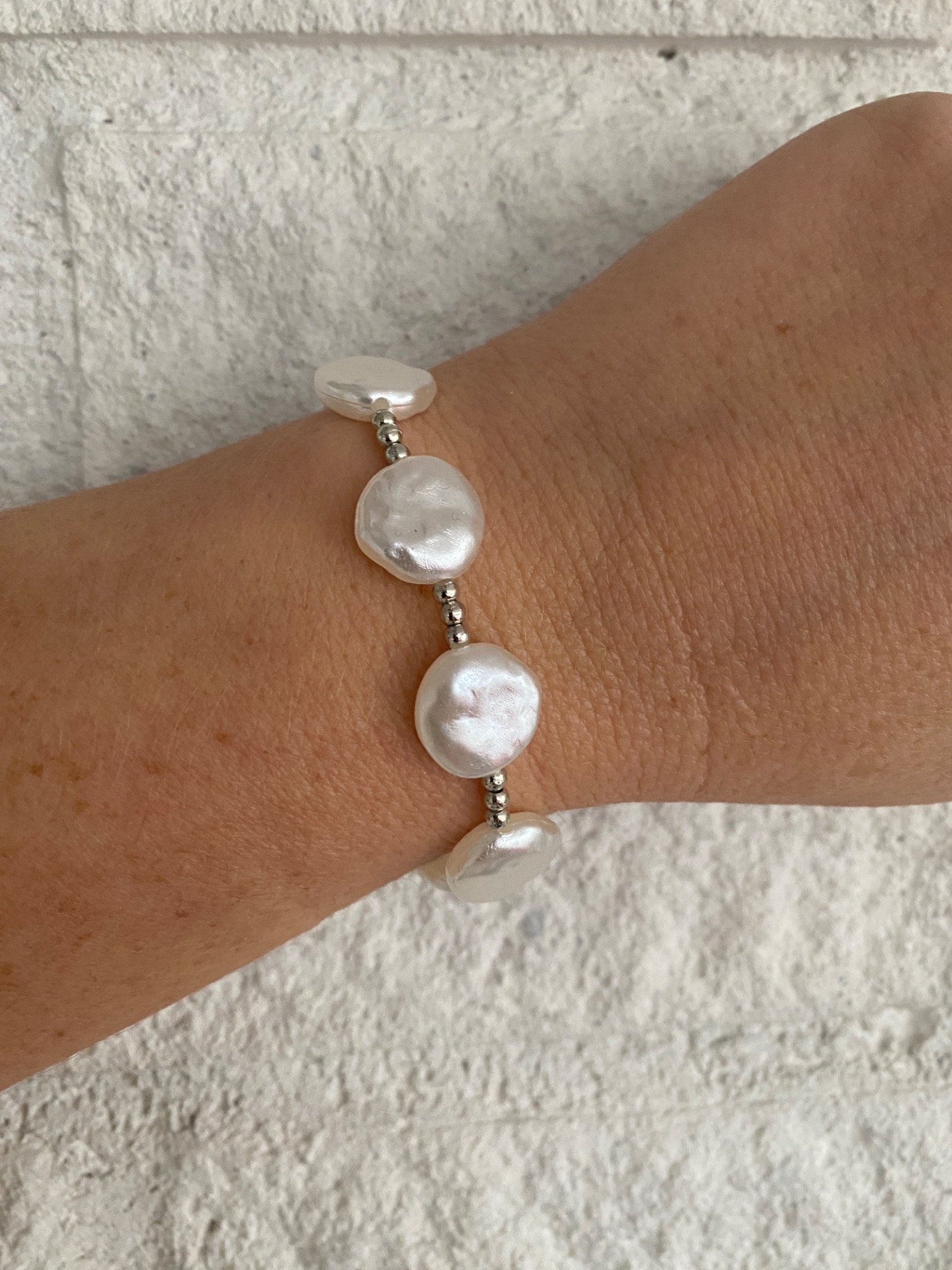 Vackert armband i varvat mönster av kritvita asymetriska platta pärlor och små silverfärgade pärlor. Avslutas som vanligt med min signaturpärla.