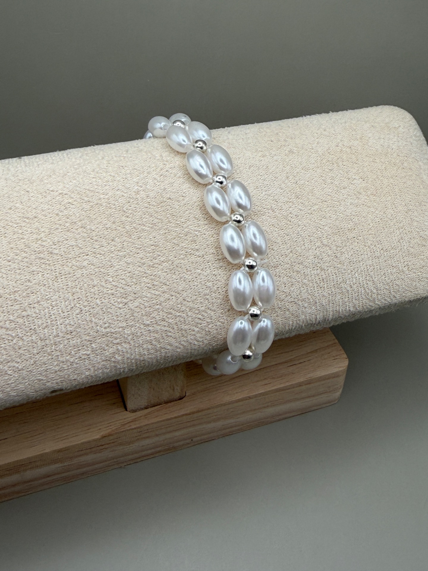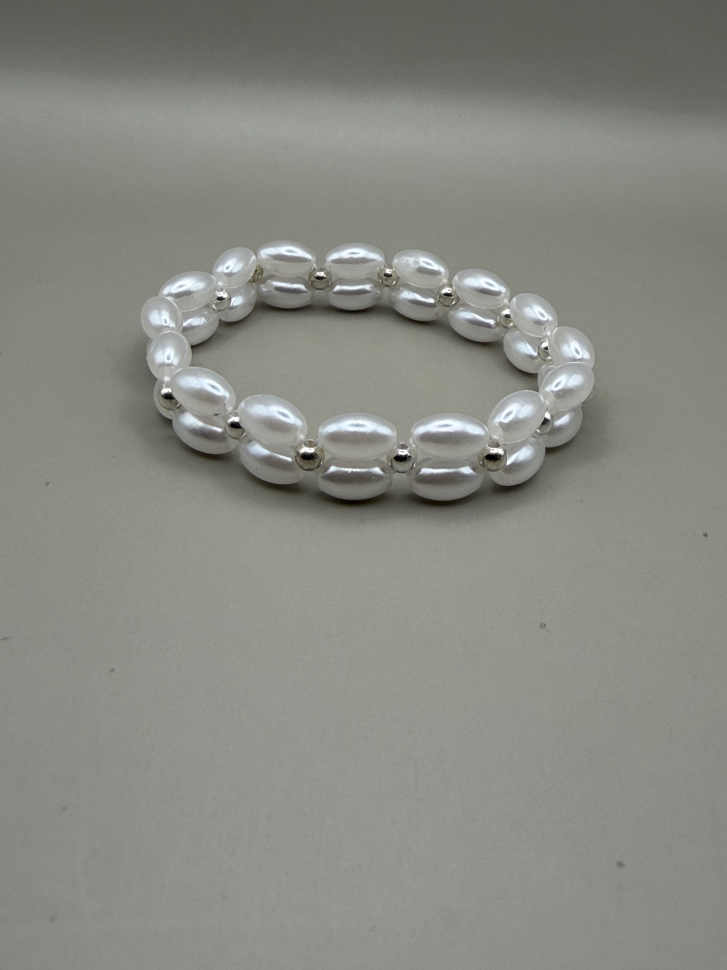 Ett stilrent armband med ett brett, varvat mönster av avlånga kritvita högblanka pärlor och diskreta silverfärgade distanser.