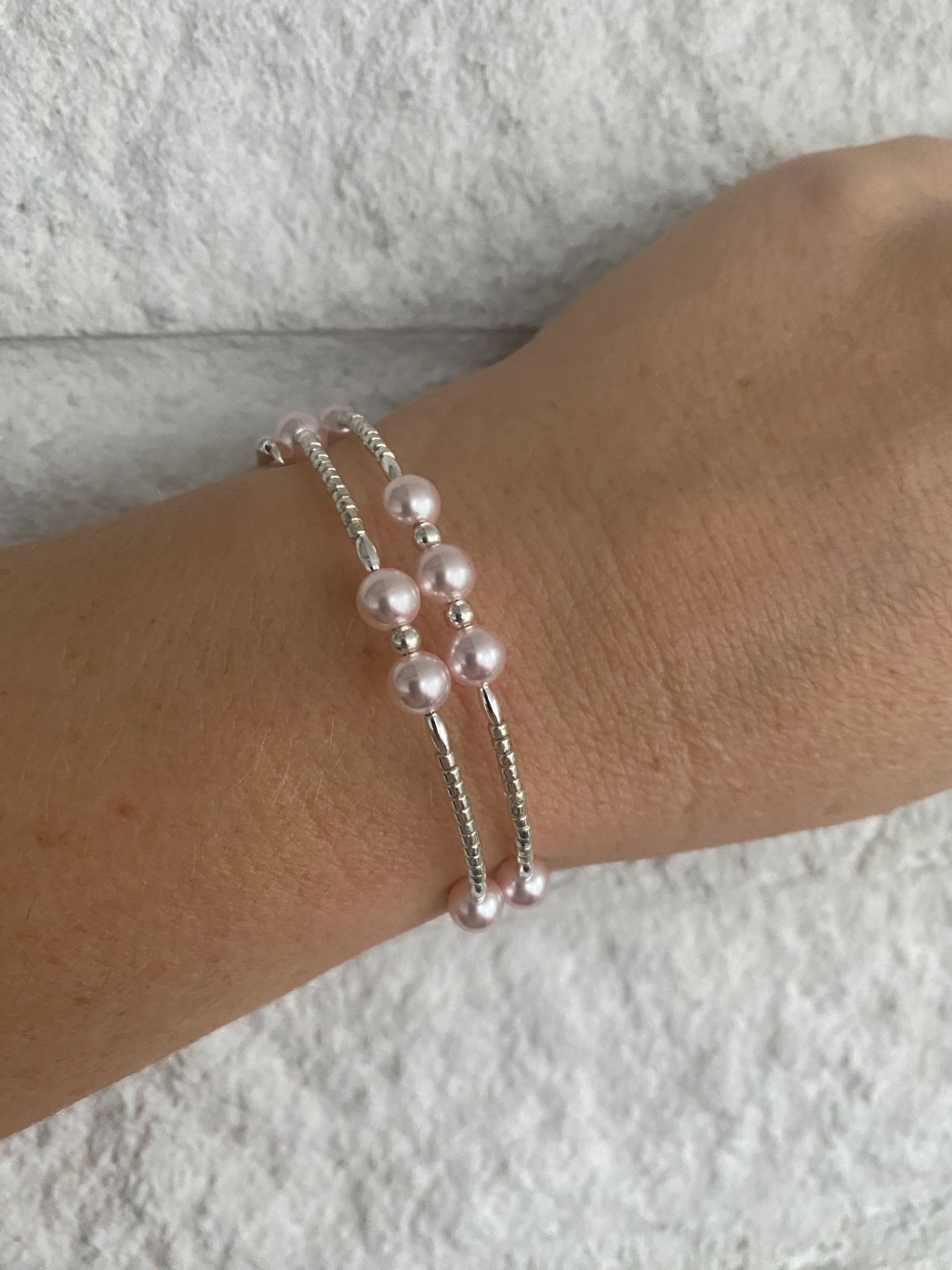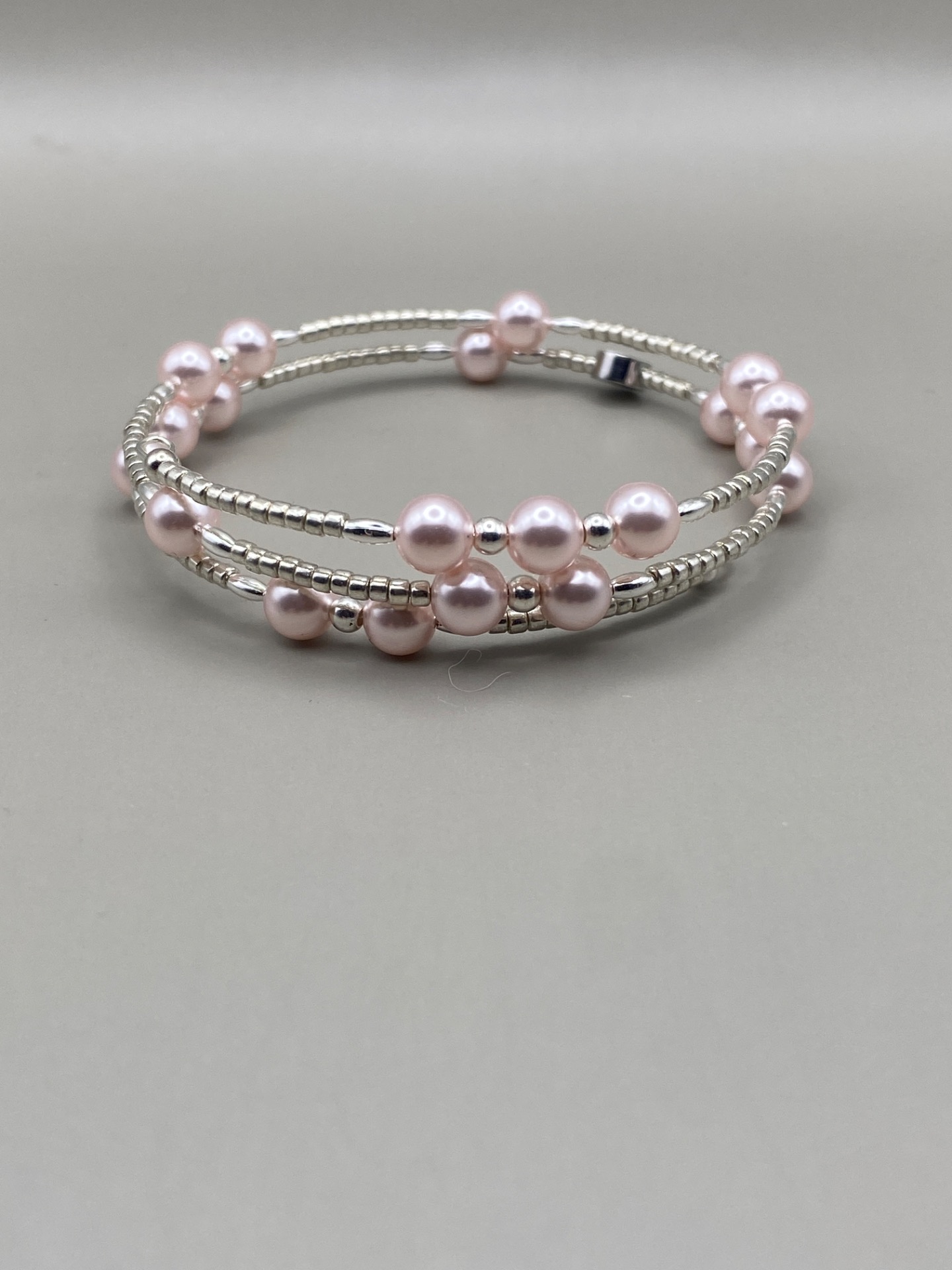 Vackert, lyxigt och stilrent spiralarmband i tvåradigt (tre åt ena hållet) mönster av ljusrosa glaspärlor och små silverfärgade glaspärlor.