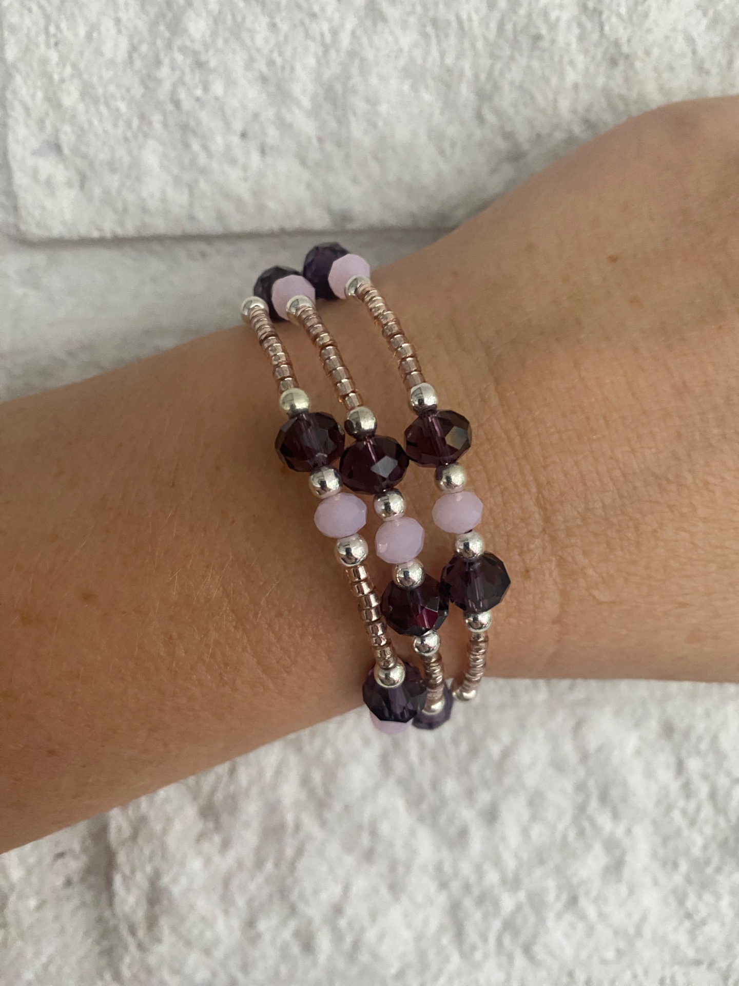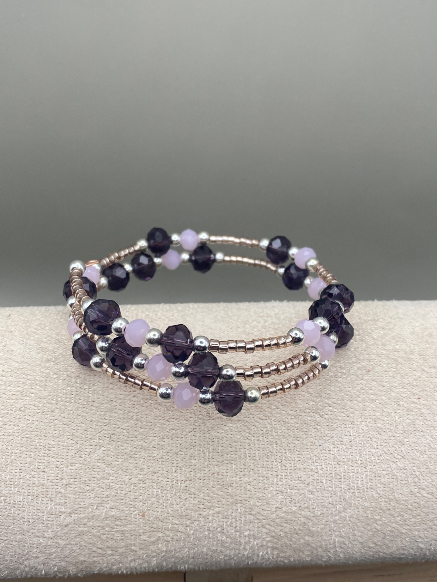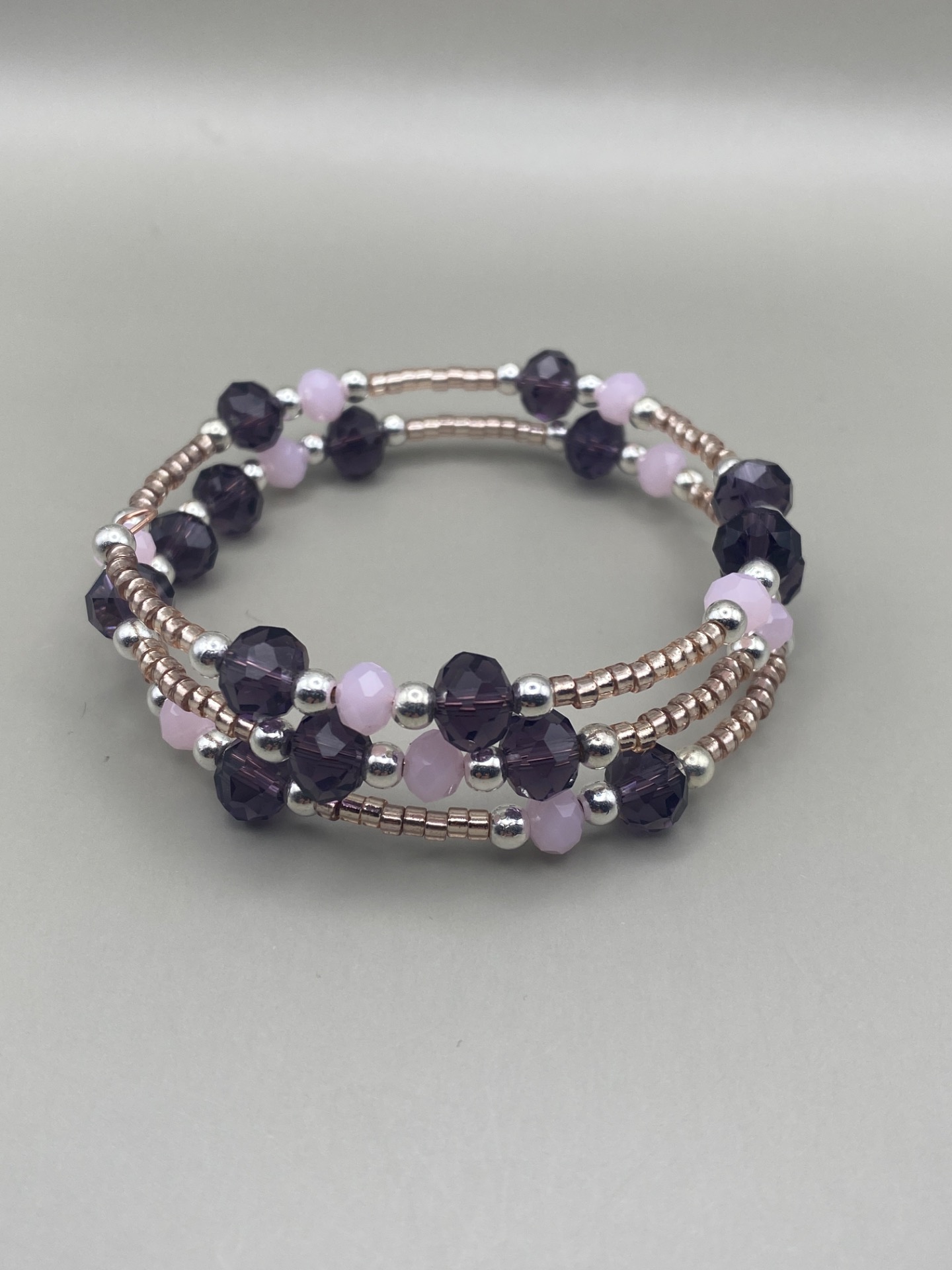 Fint lila och ljusrosa flexibelt spiralarmband tvåradigt (tre åt ena hållet) mönster av varvat lila och ljusrosa facetterade glaskristallpärlor och små roséfärgade små glaspärlor.