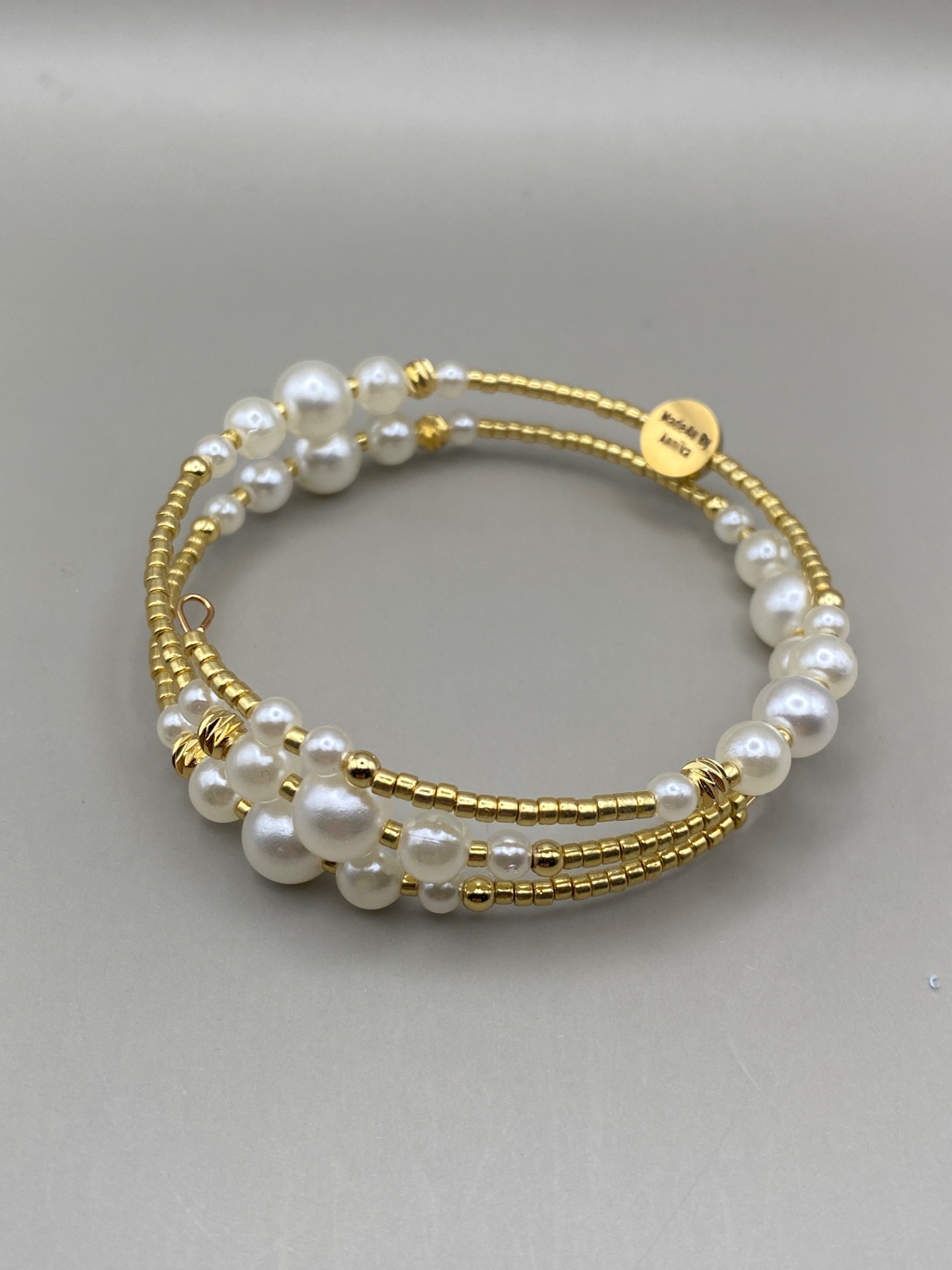 Vackert, lyxigt och stilrent spiralarmband i stilrent mönster av benvita runda högblanka pärlor och små guldfärgade glaspärlor.