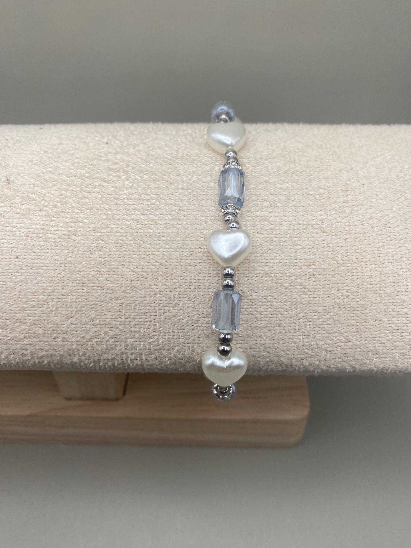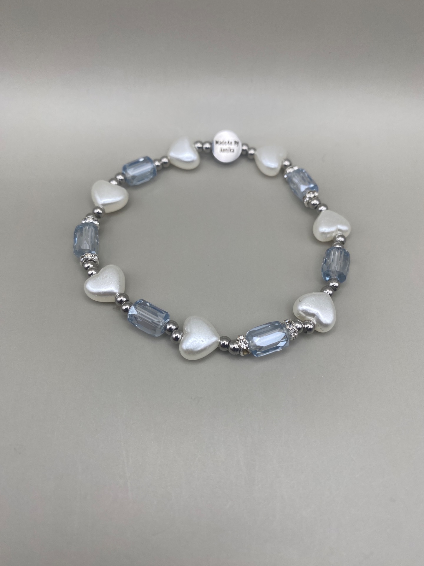 Tjusigt armband med vita glansiga hjärtan varvat med ljusblå kubiska facetterade glaskristallpärlor, strass och små silverfärgade pärlor. Sött möter elegans.