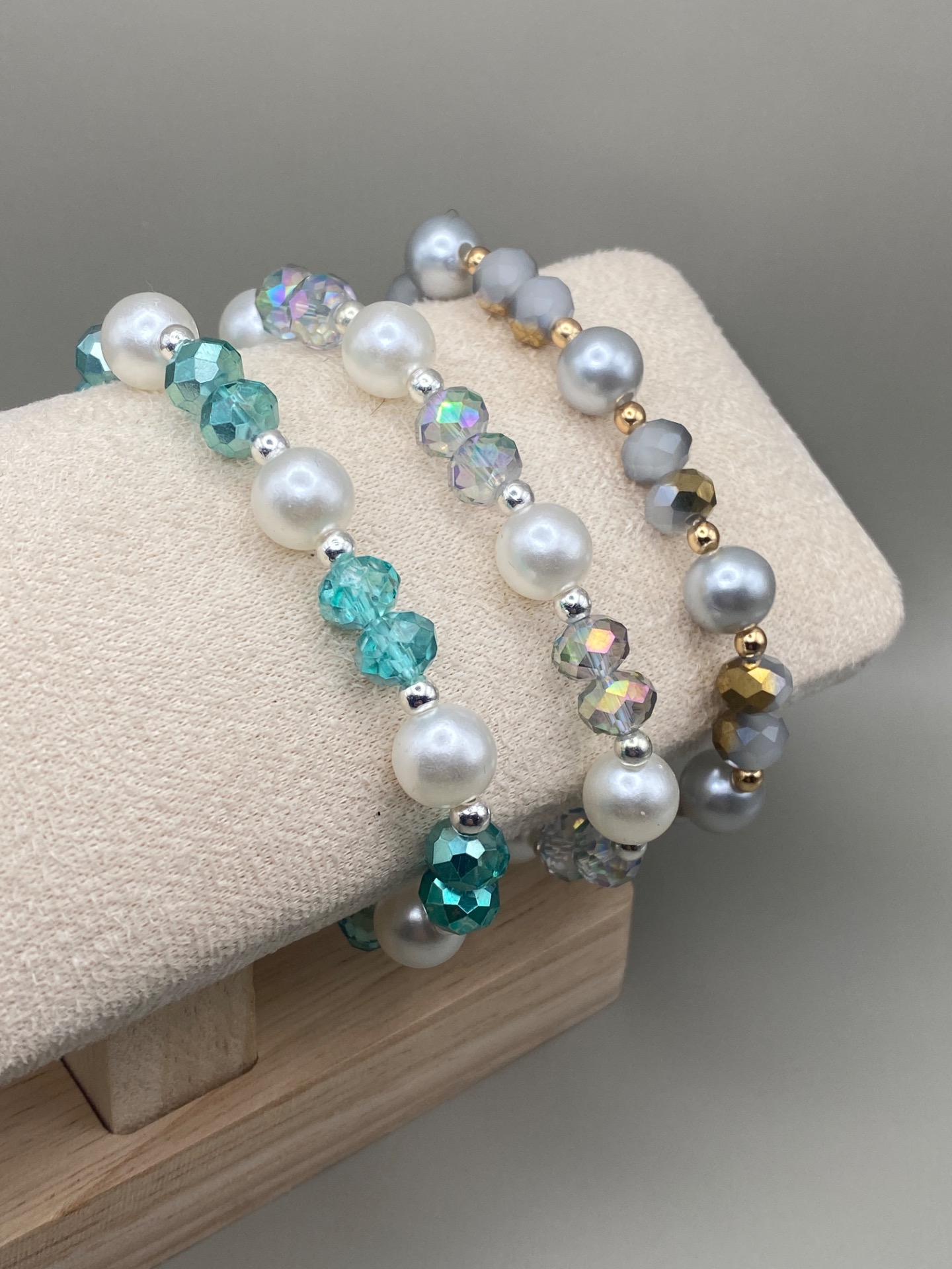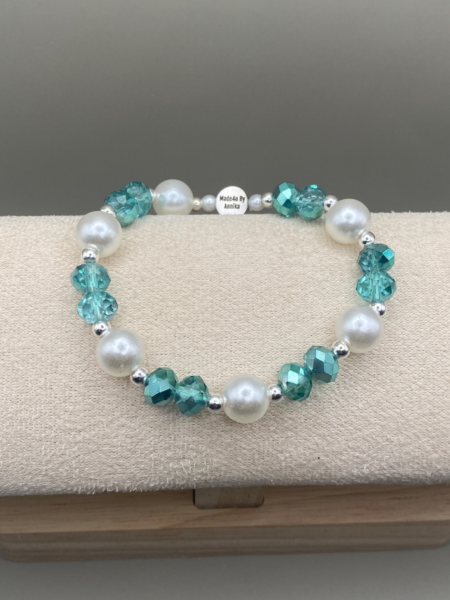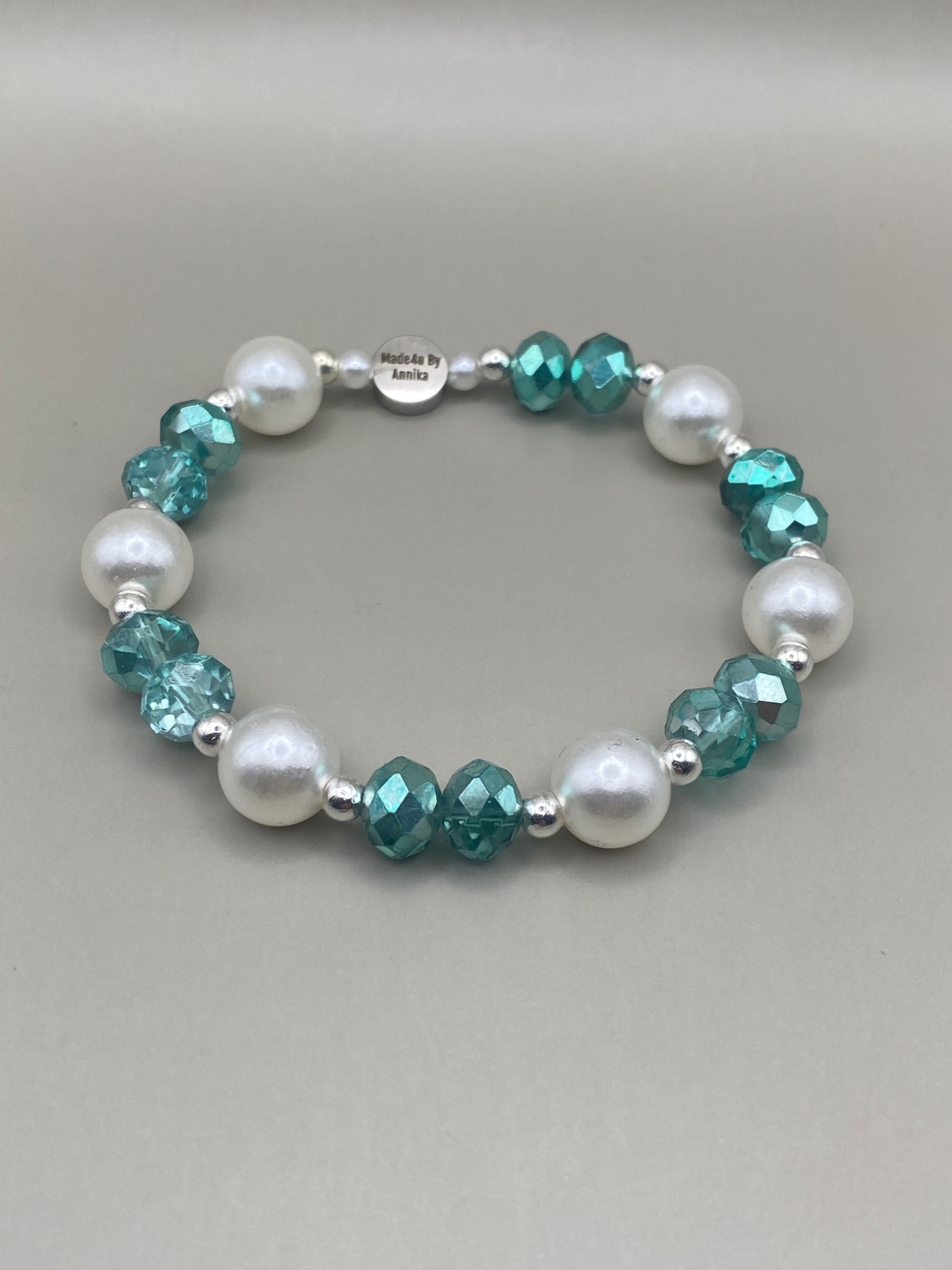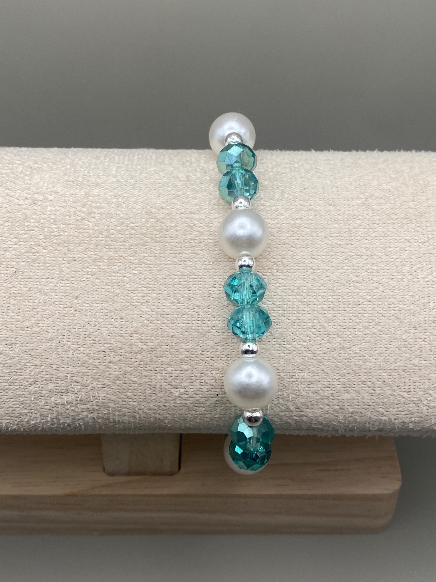 Vackert och skimrande armband i varvat fint mönster av klara turkos-grönkimrande facetterade glaskristallpärlor och kritvita högblanka stora pärlor varvat med små silverfärgade pärlor.