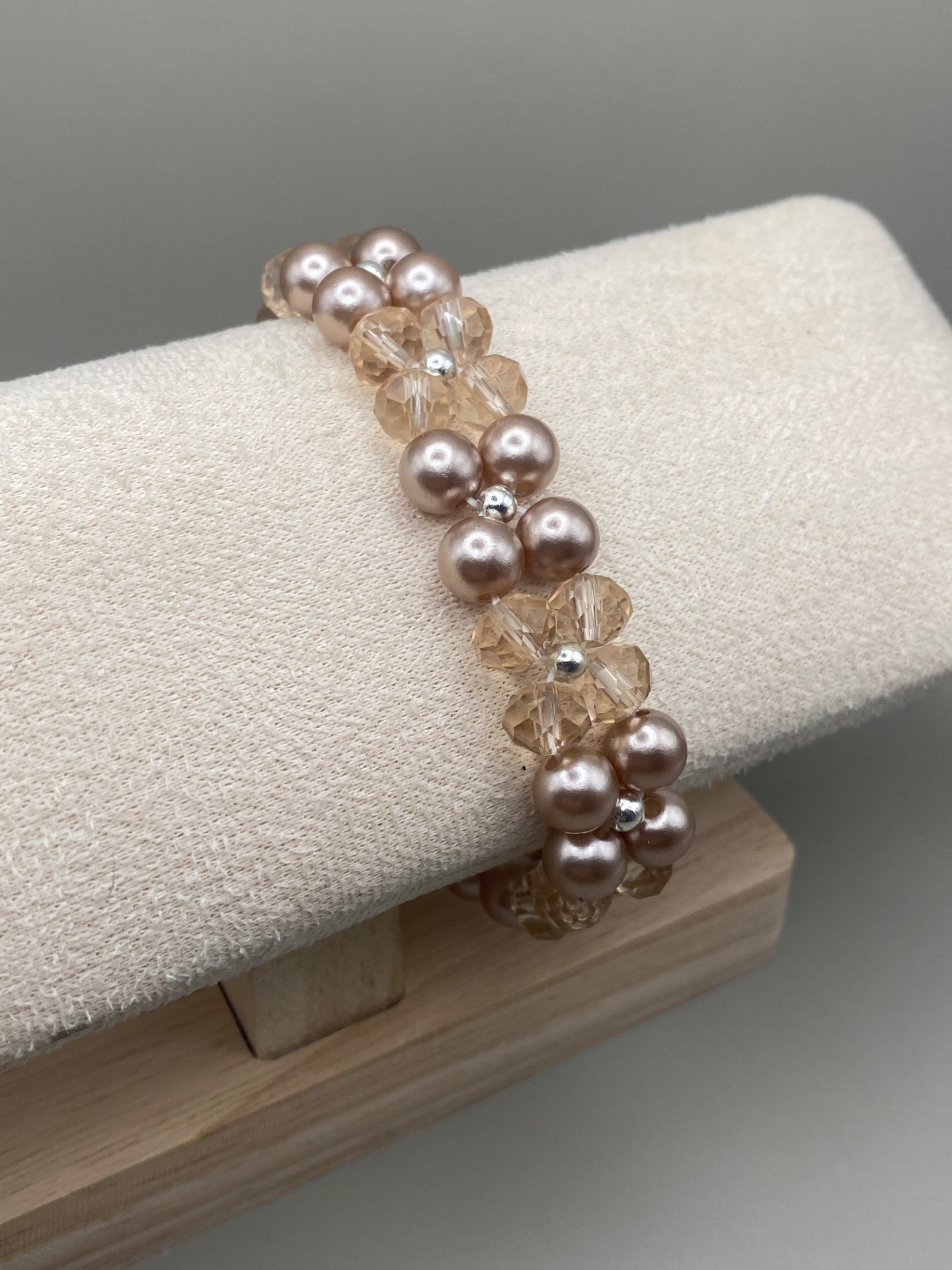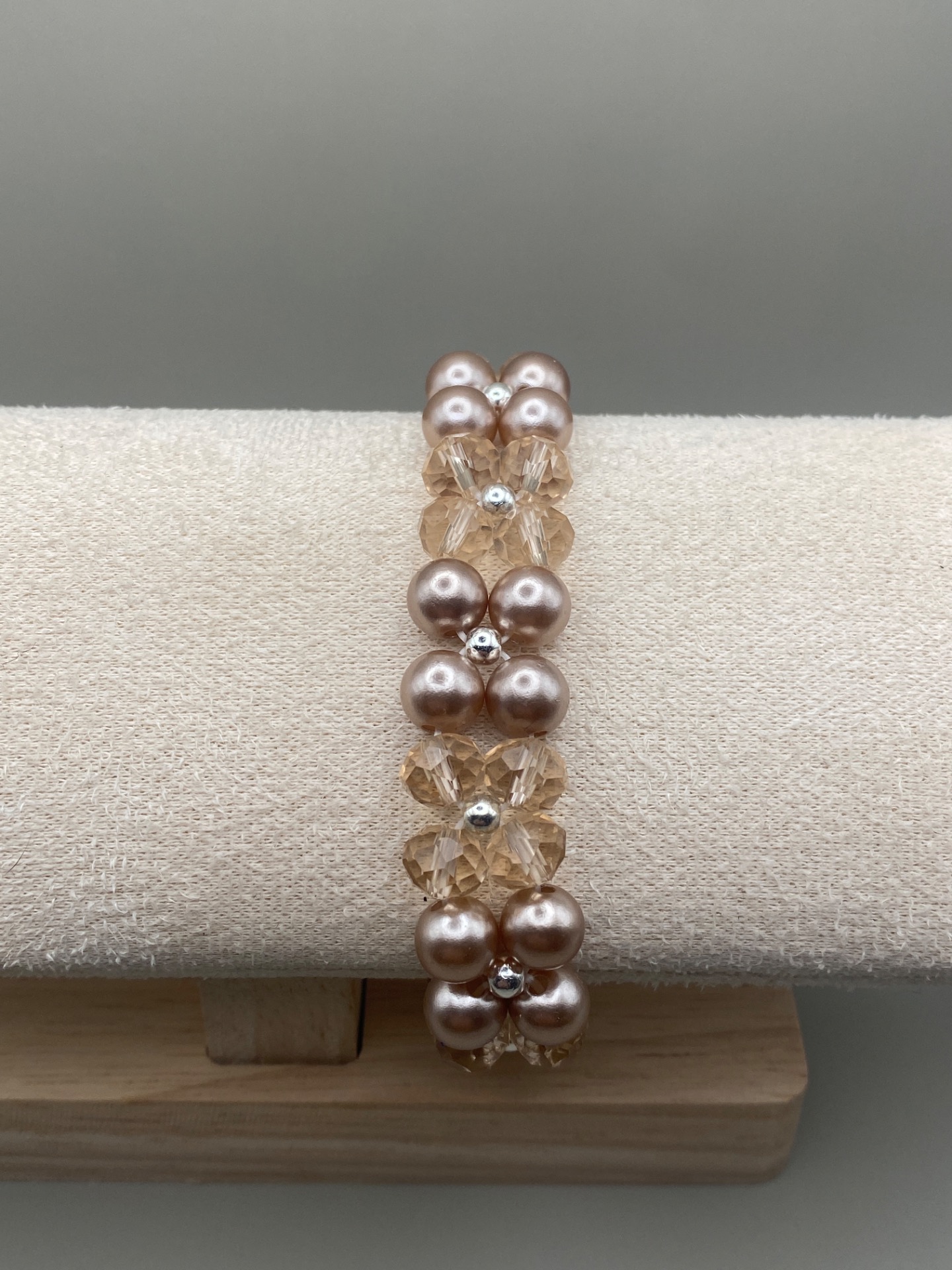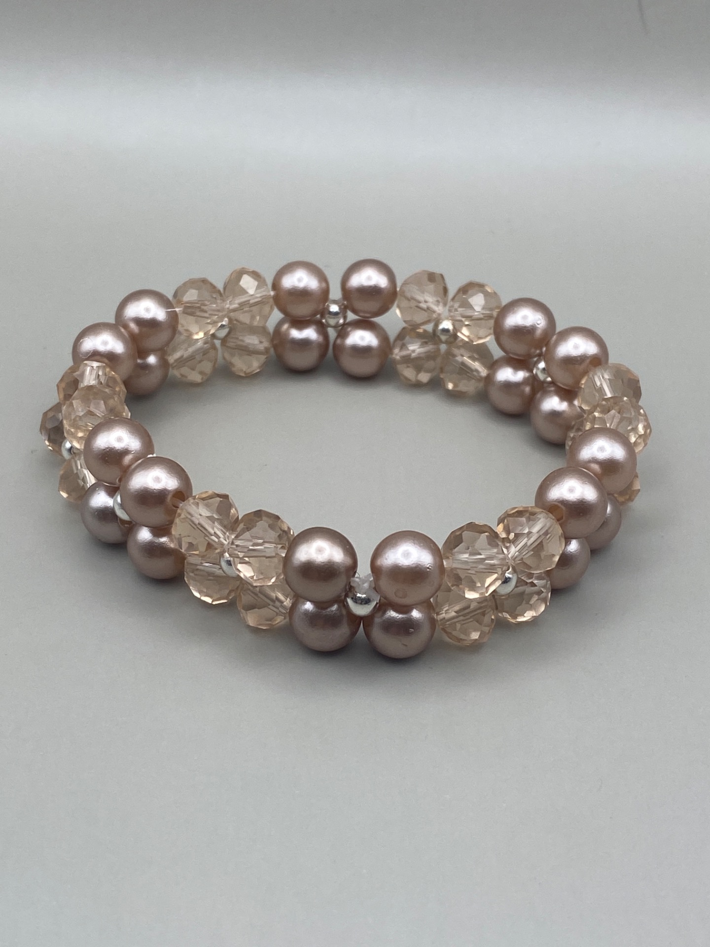 Vackert, brett tvåradigt och skimrande armband i varvat fint mönster av klara champagnefärgade skimrande facetterade glaskristallpärlor och beiga högblanka pärlor varvat med små silverfärgade pärlor.