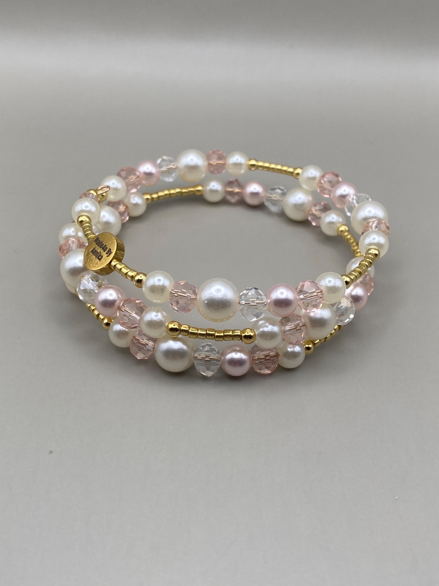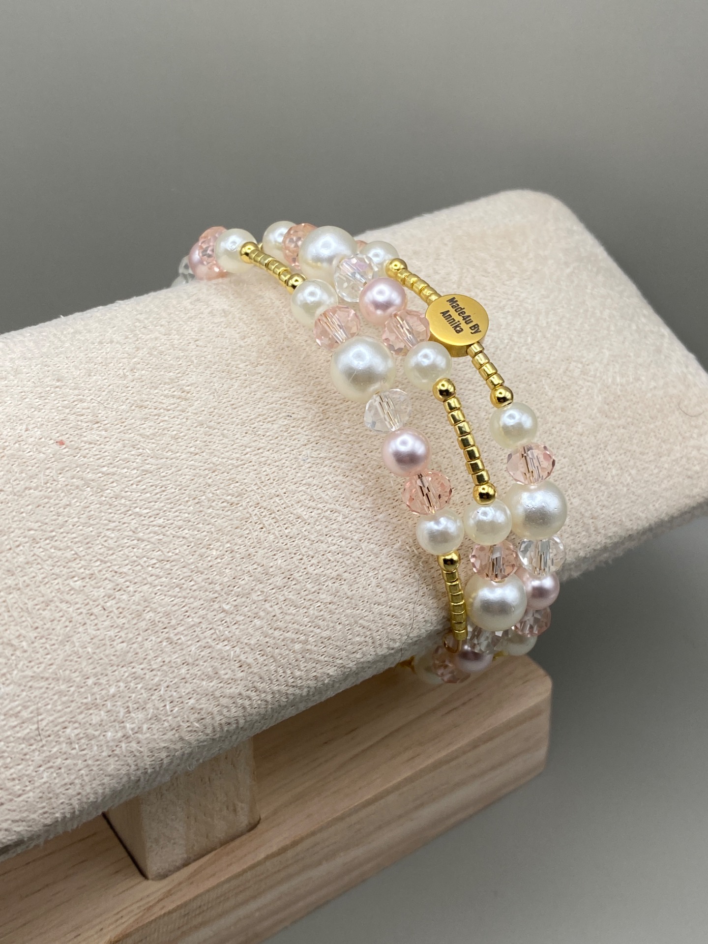 Vackert och lyxigt spiralarmband i tvåradigt (tre åt ena hållet) mönster av benvita och ljusrosa pärlor, ljusrosa och klara facetterade glaskristall pärlor och guldfärgade små glaspärlor.
