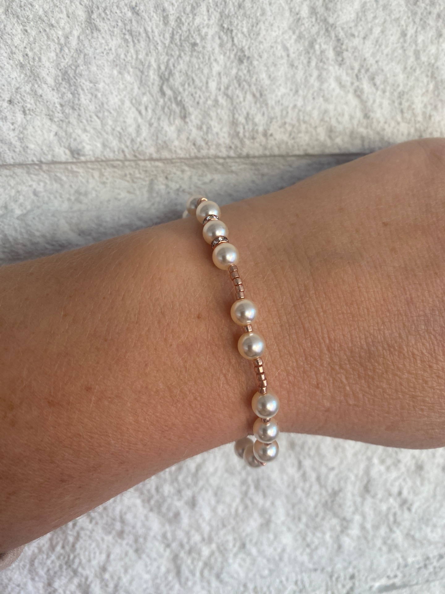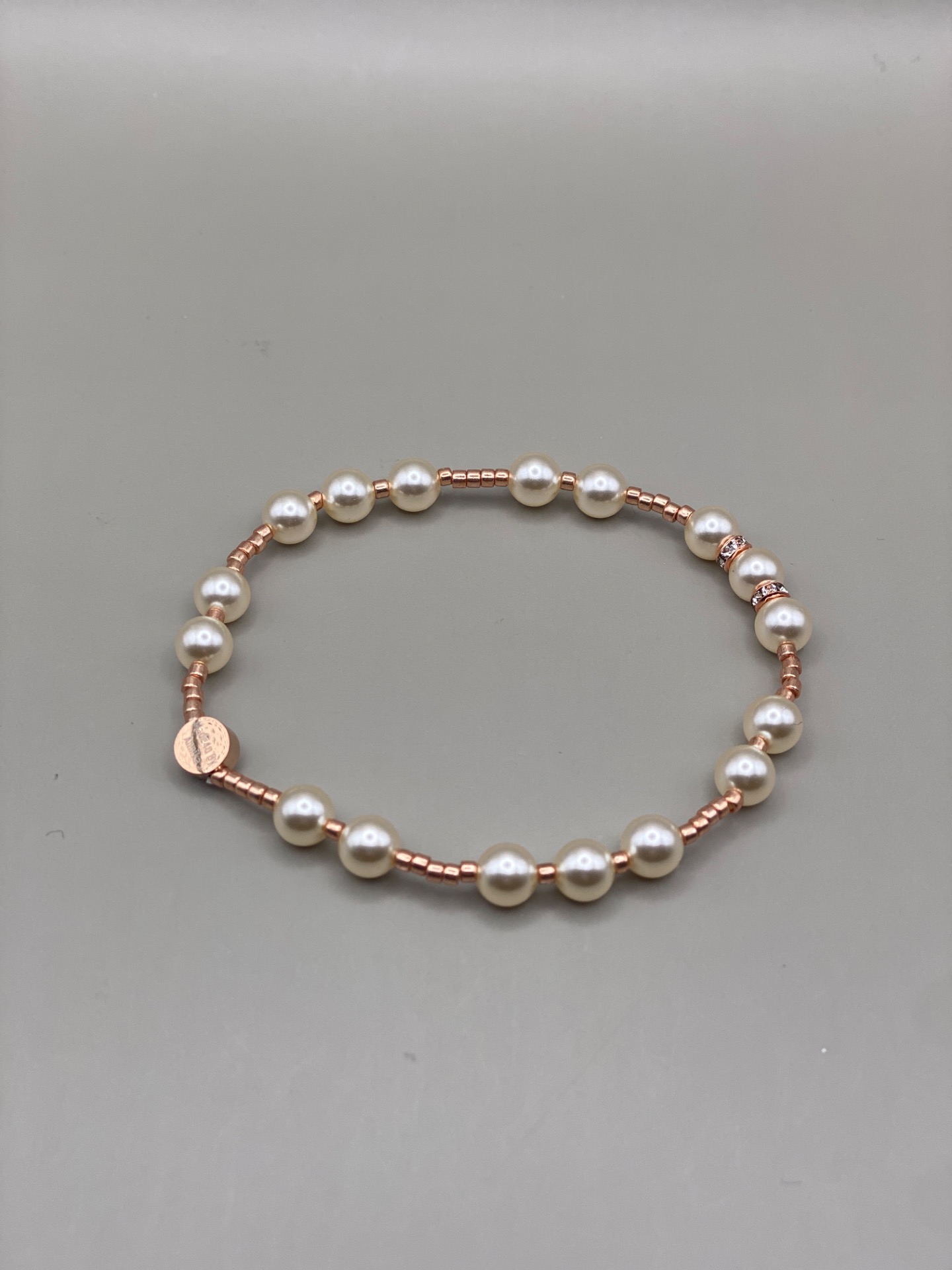 Vackert och ljusigt armband med en härlig sammansättning av benvita vaxad glaspärlor och små rosefärgade glaspärlor, strass i blickfånget.