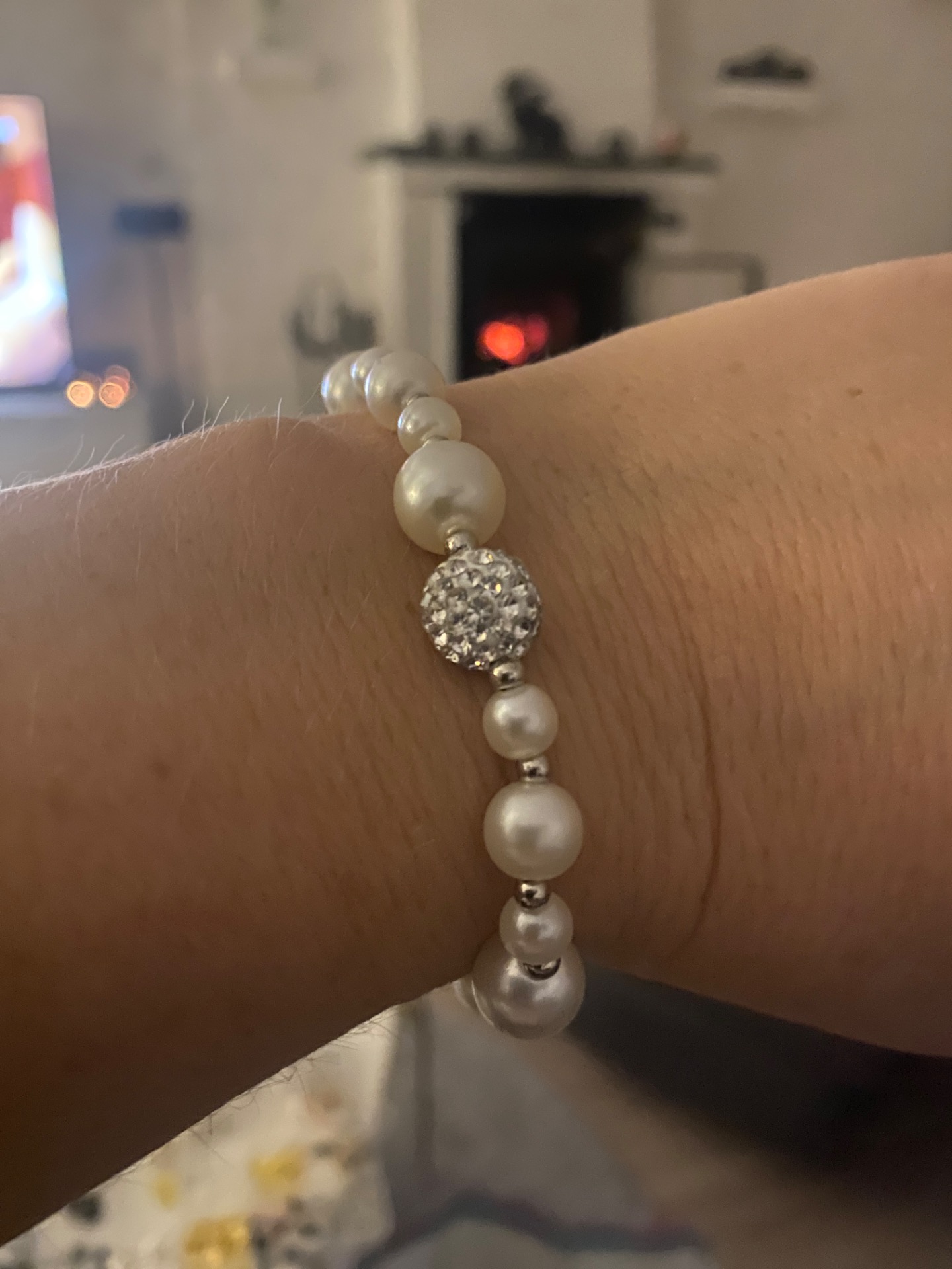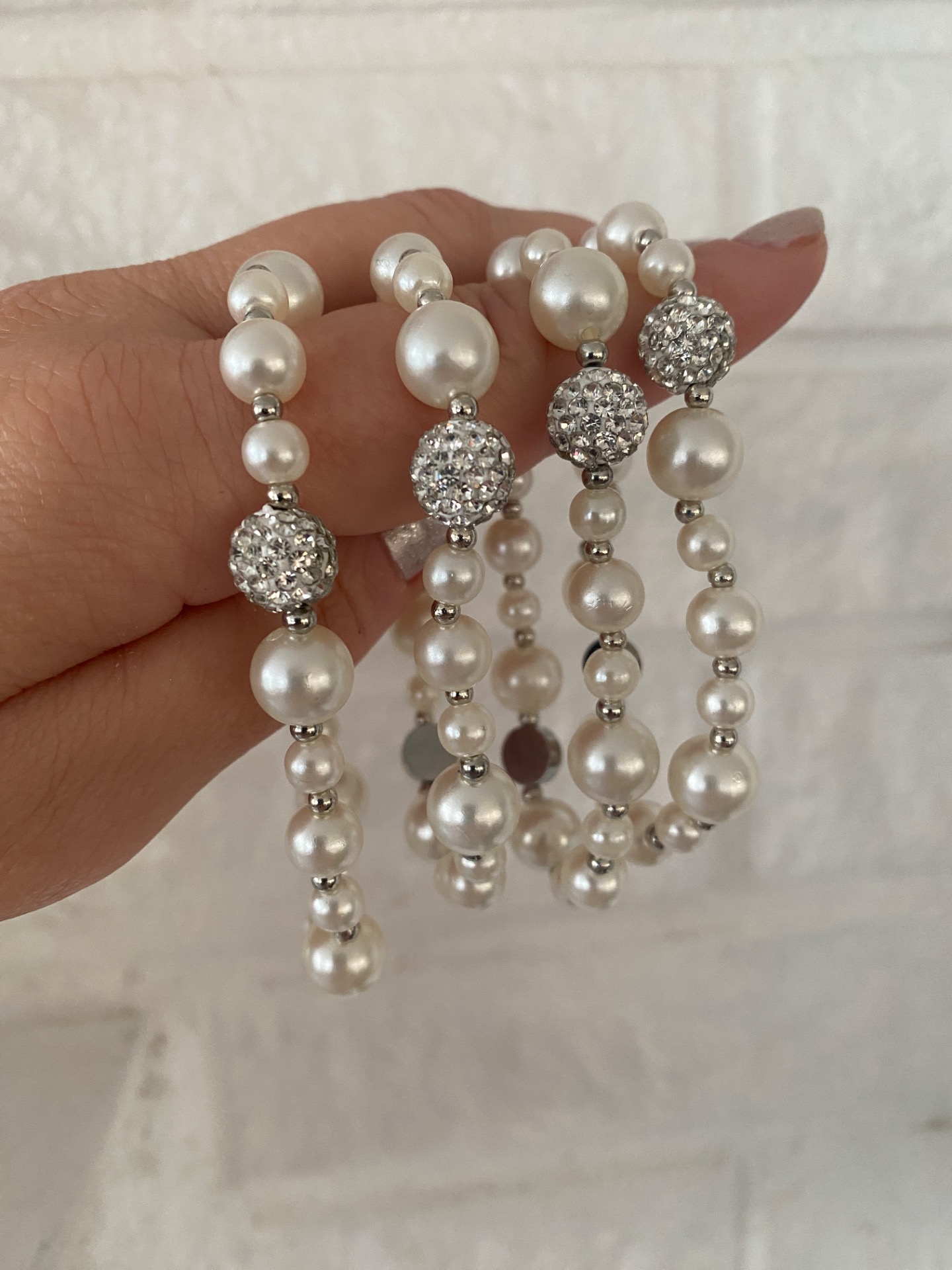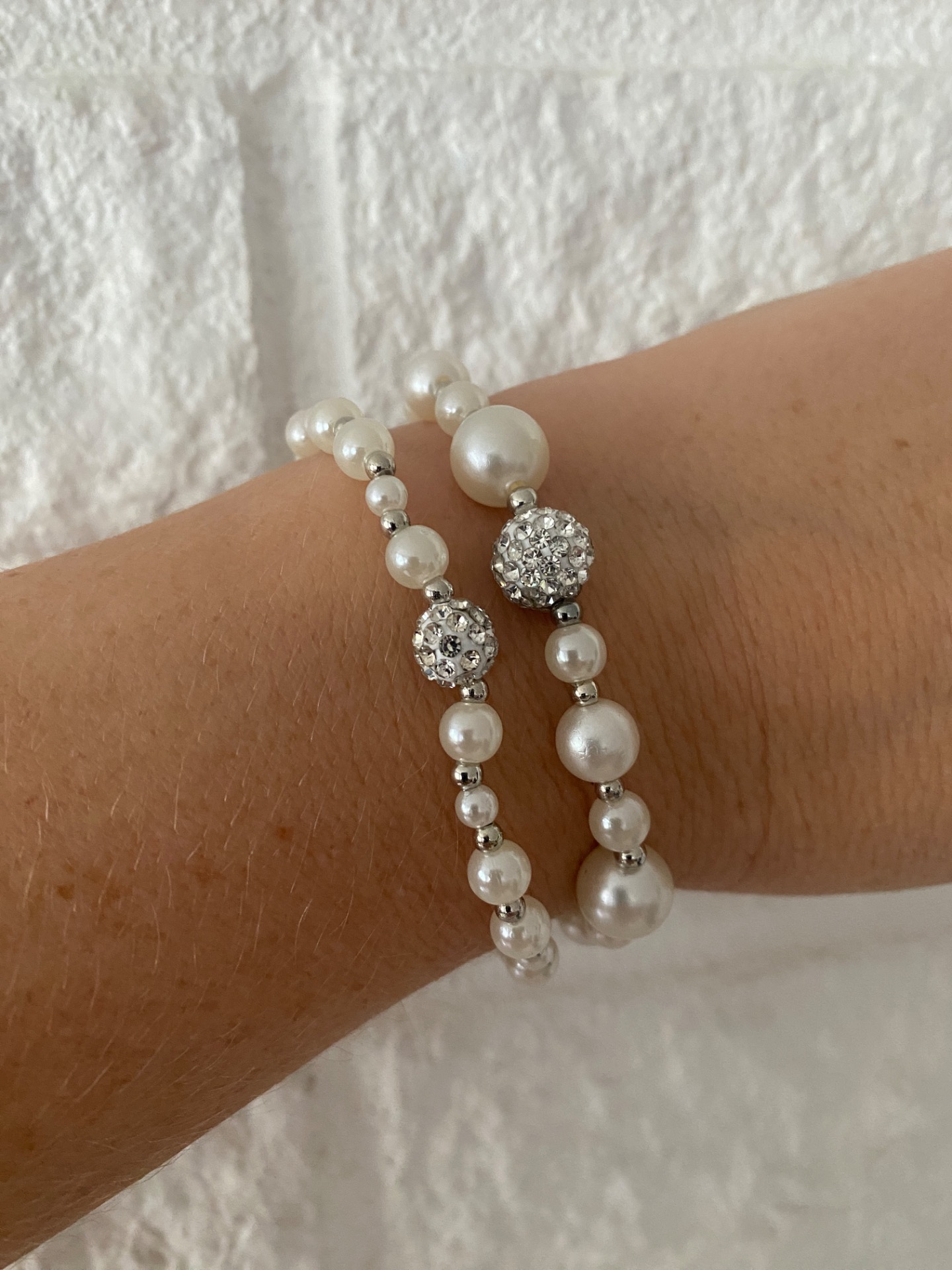 Vackert och lyxigt armband i benvita pärlor i olika storlekar varvat med små silverfärgade pärlor och vacker silverfärgad pärla med rhinestones i blickfånget