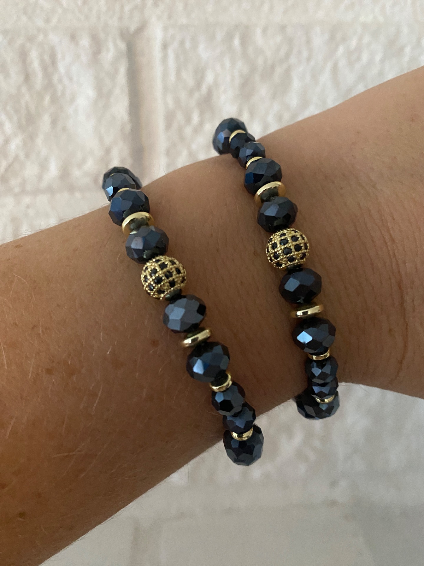 Vackert och lyxigt armband i midnattsblå spegelblanka facetterade glaskristallpärlor varvat med guldfärgade små distanser och vacker berlock i blickfånget.