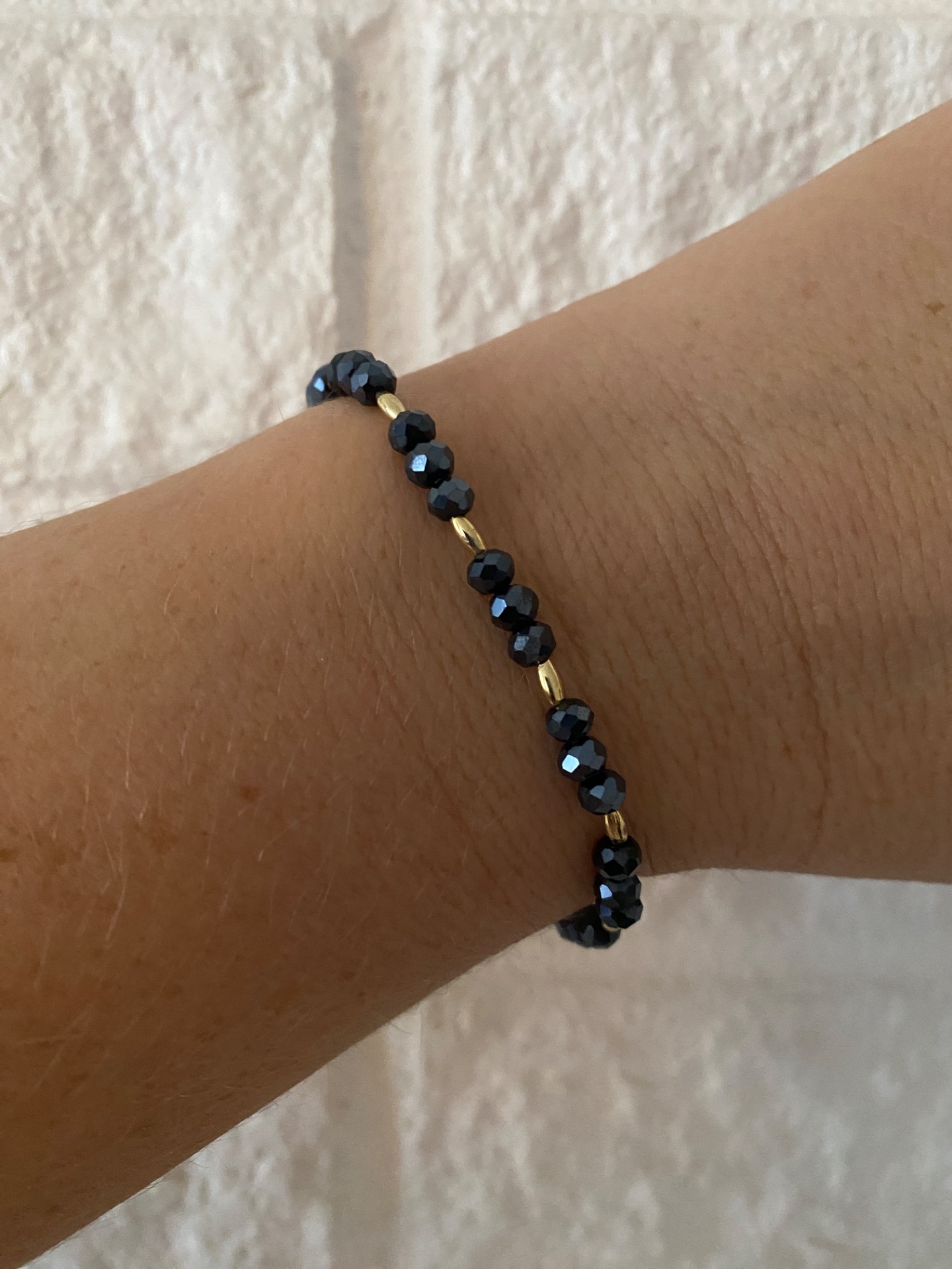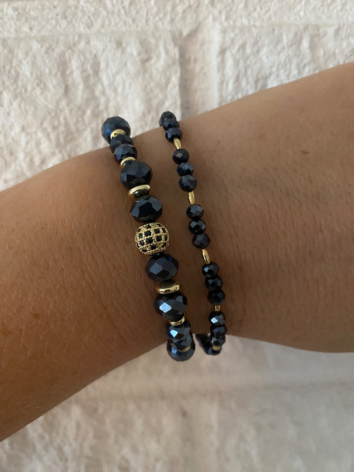 Vackert och lyxigt armband i små midnattsblå spegelblanka facetterade glaskristallpärlor varvat med guldfärgade små avlånga pärlor.