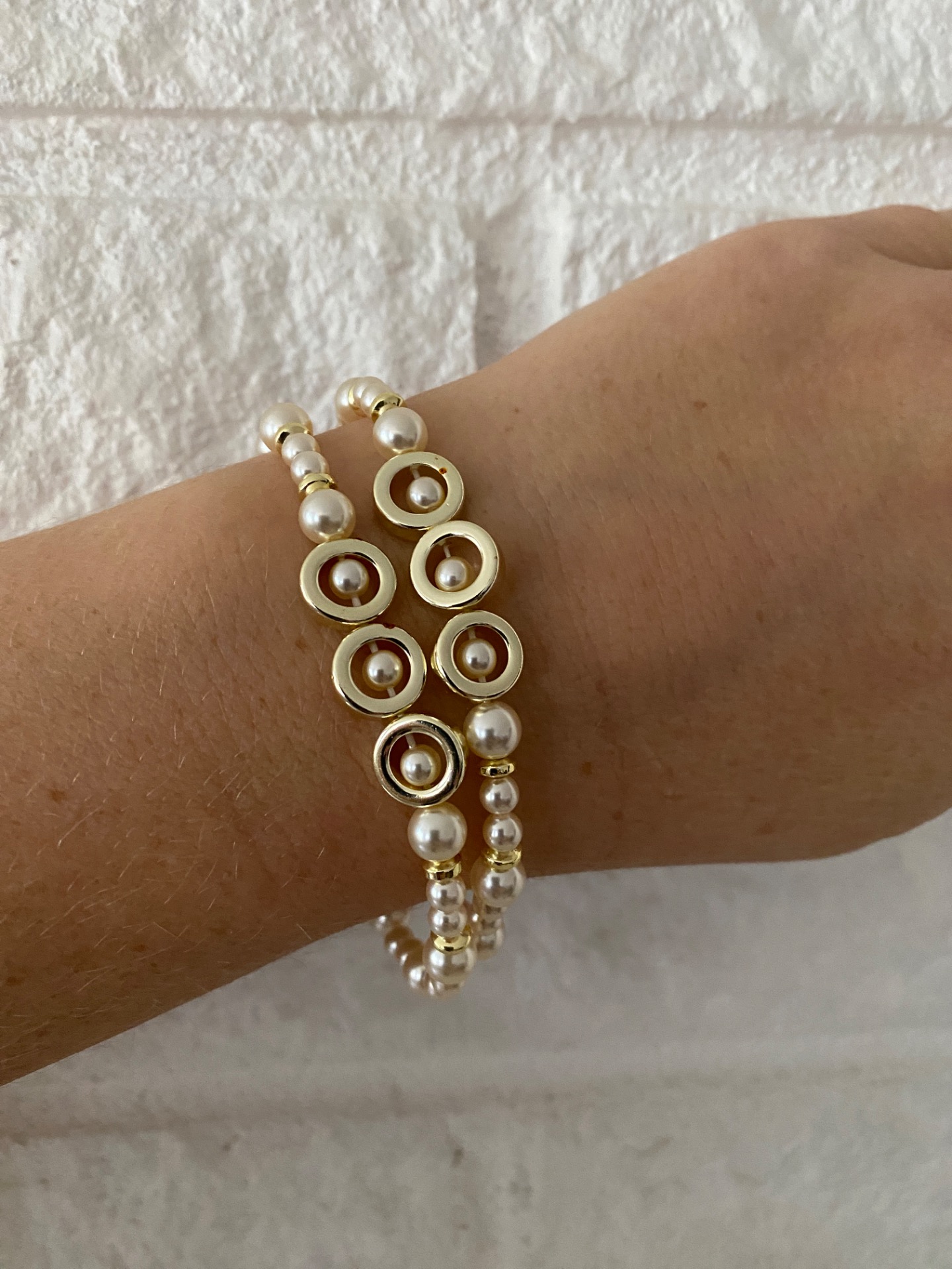 Vackert armband i varvat olika storlekar av fina benvita vaxade glaspärlor och tre guldfärgade hematitpärlor och guldfärgade små distanser.